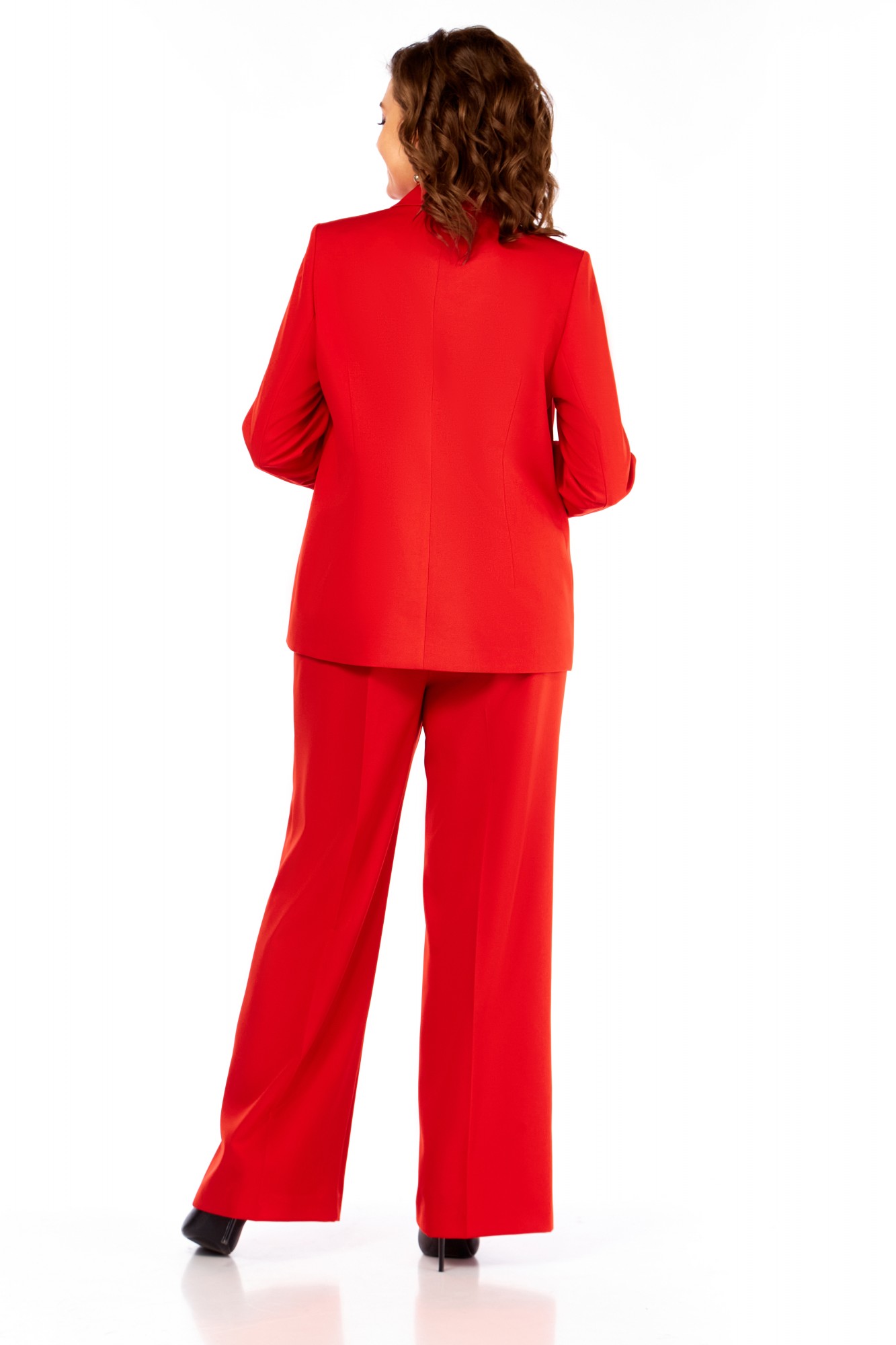 Шикарный костюм, состоит из жакета и брюк. Жакет на подкладке, приталенного силуэта с центральной бортовой застежкой на петли и пуговицы, с отрезным бочком . По переду прорезные карманы с клапаном, спинка со средним швом и вытачками. Рукав втачной двухшовный со шлицами-обманками на петли и пуговицы. Брюки прямые на притачном поясе и боковыми карманами, застежка брюк на тесьму молнию и пуговицу.