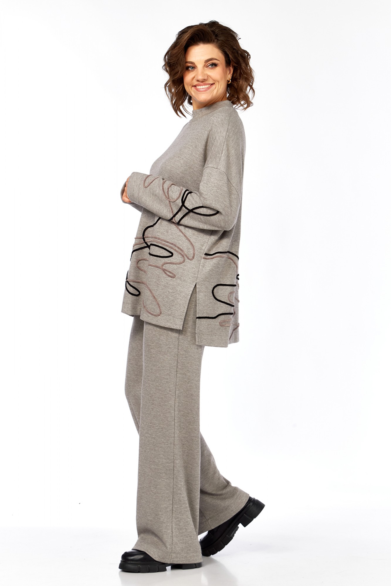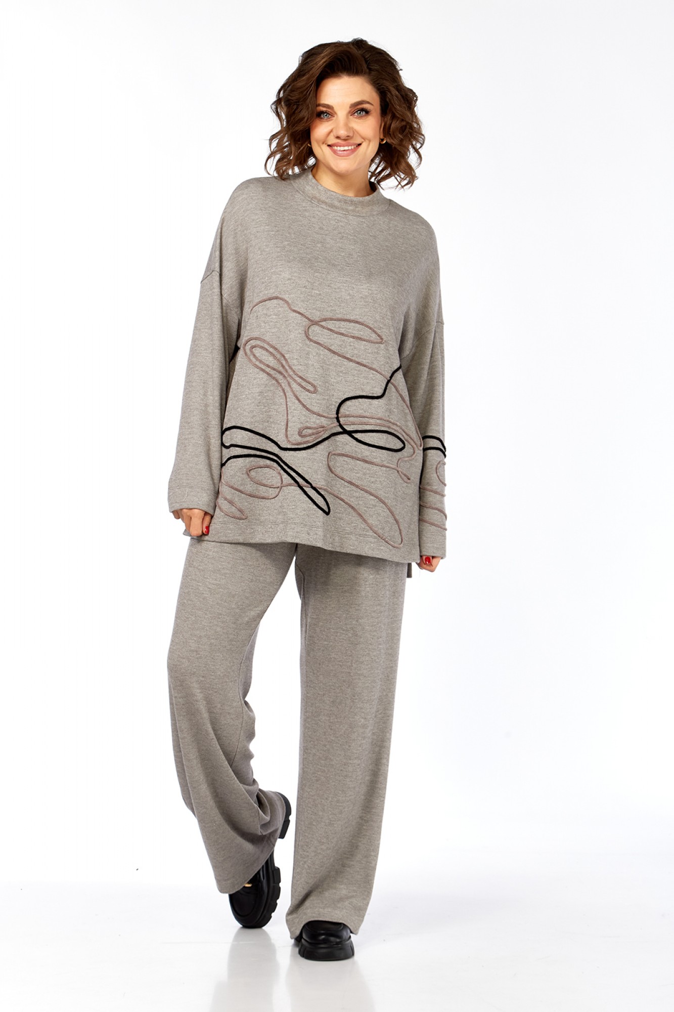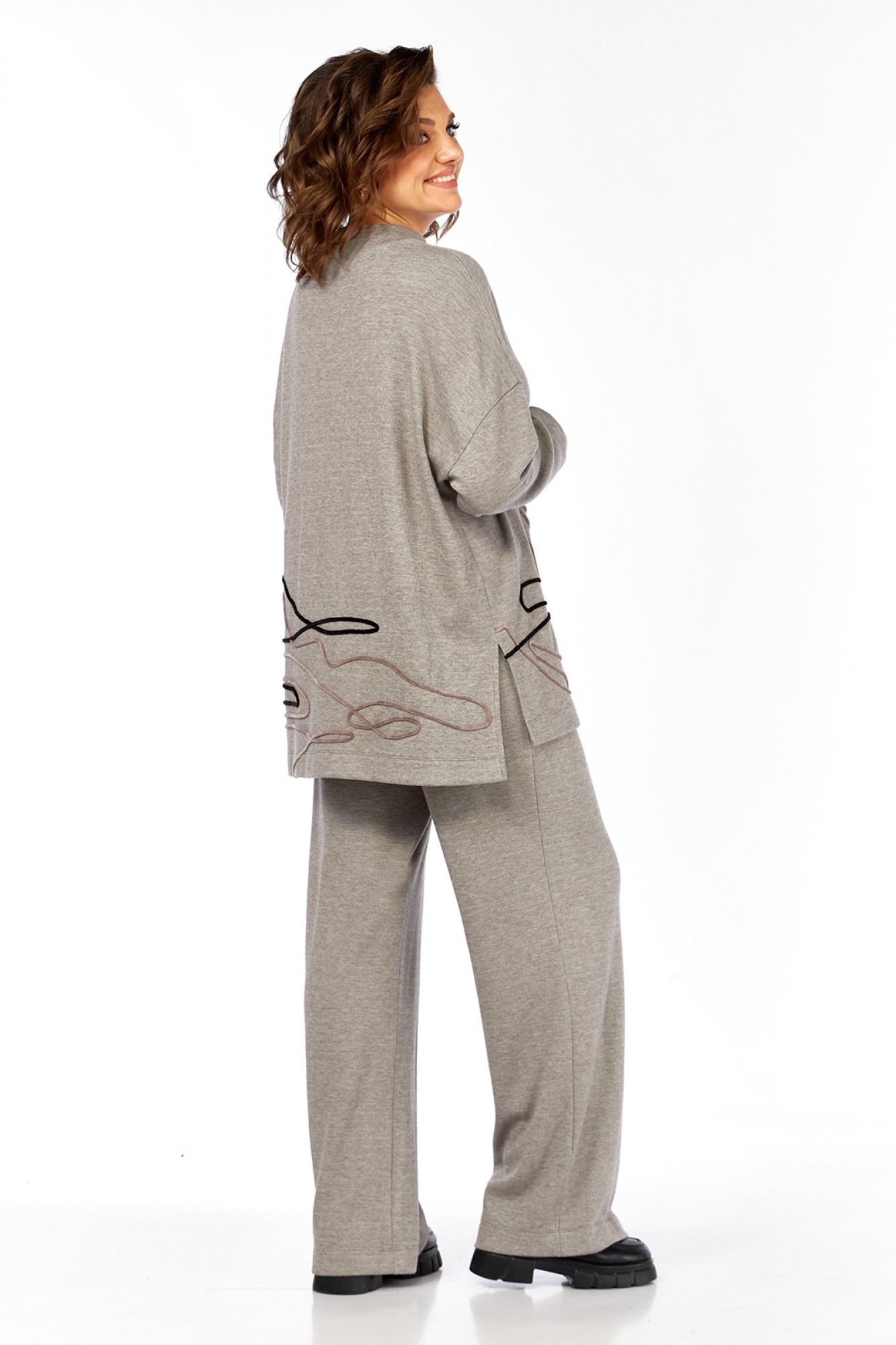 Костюм брючный двухпредметный изготовлен из трикотажного полотна. Состоит из джемпера и брюк. Джемпер свободного кроя. Горловина обработана воротником-стойкой. По переду, спинке и рукаву — вышива шнуром. В боковых швах внизу обработаны разрезы. Рукава спущенные длинные. Брюки прямого силуэта, обработан пояс на резинке. В брюках имеются карманы.