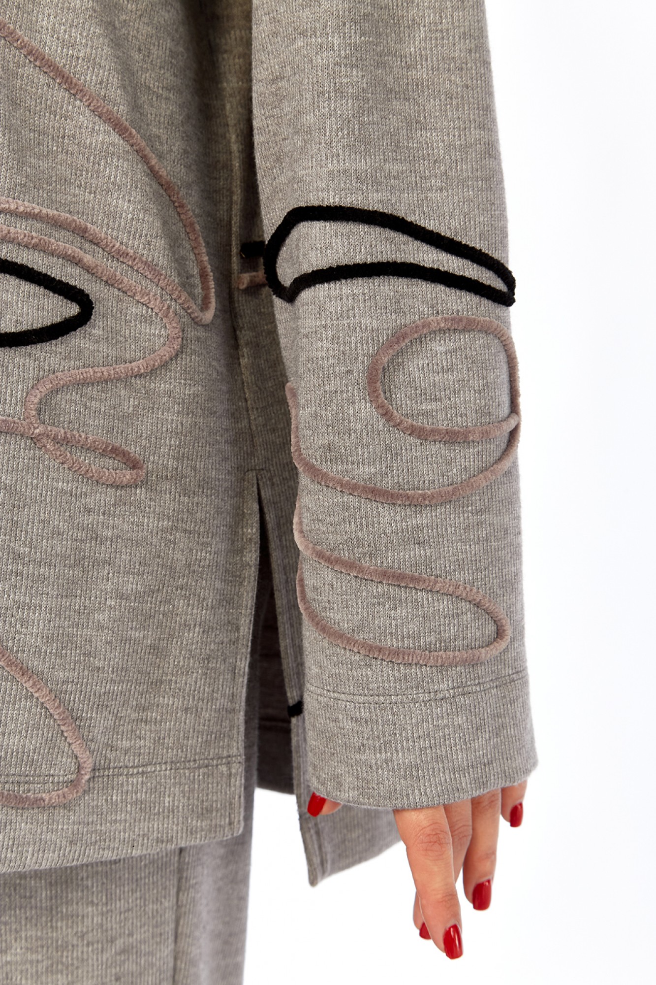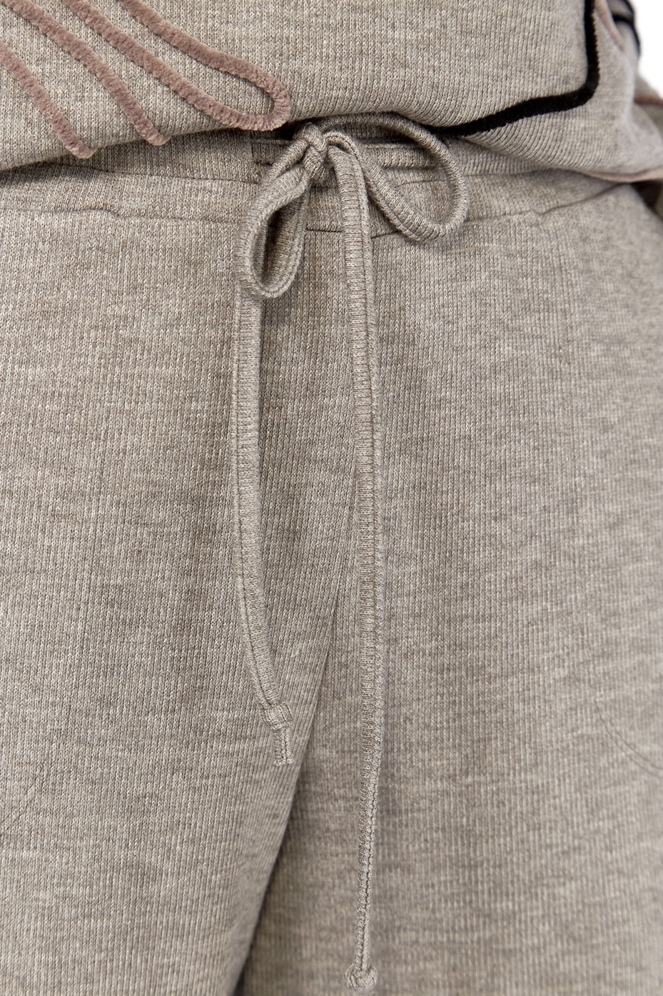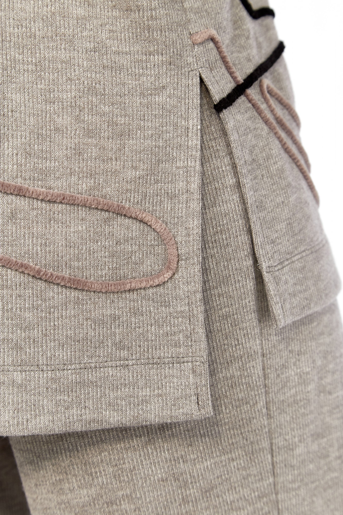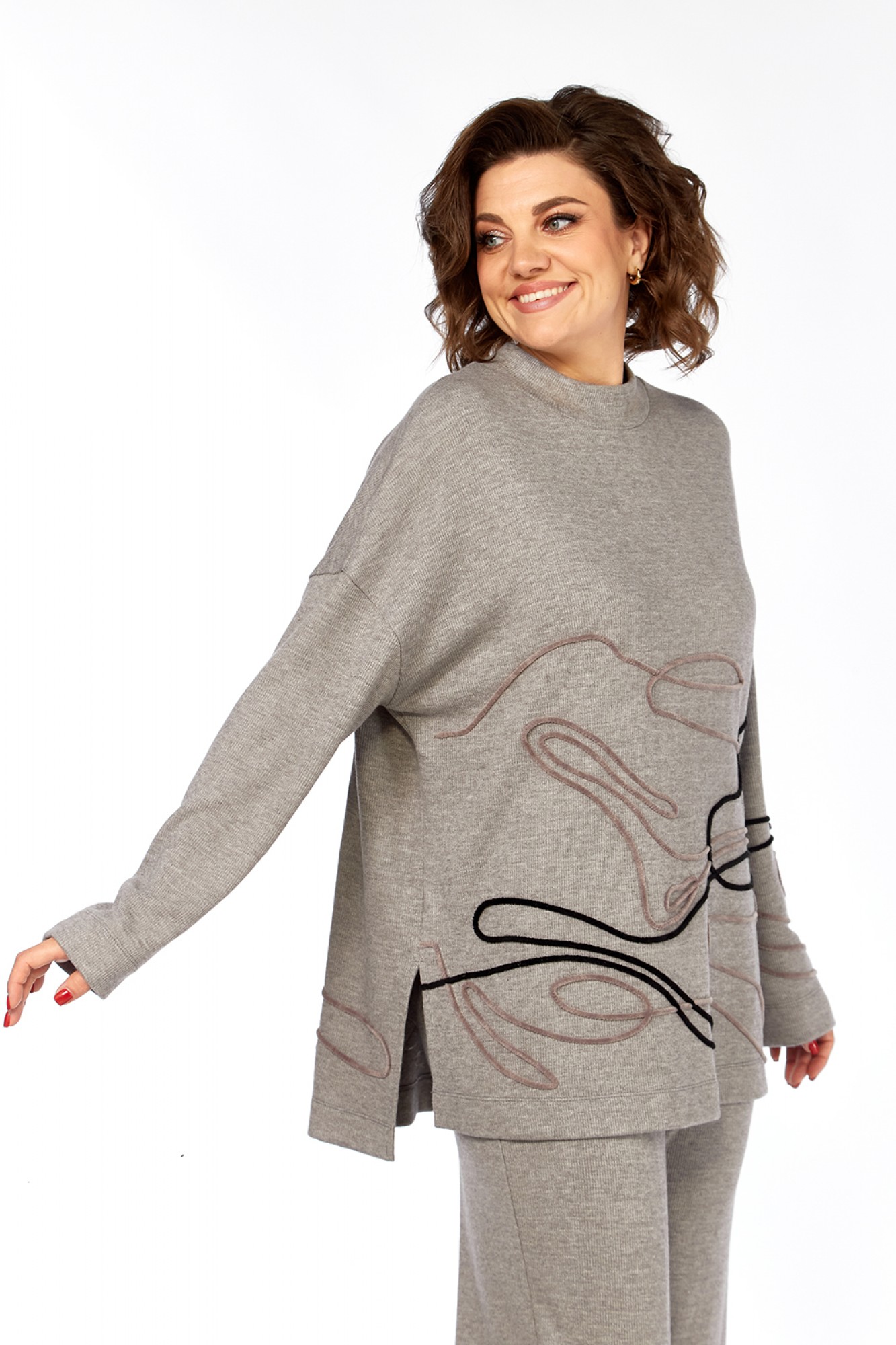 Костюм брючный двухпредметный изготовлен из трикотажного полотна. Состоит из джемпера и брюк. Джемпер свободного кроя. Горловина обработана воротником-стойкой. По переду, спинке и рукаву — вышива шнуром. В боковых швах внизу обработаны разрезы. Рукава спущенные длинные. Брюки прямого силуэта, обработан пояс на резинке. В брюках имеются карманы.