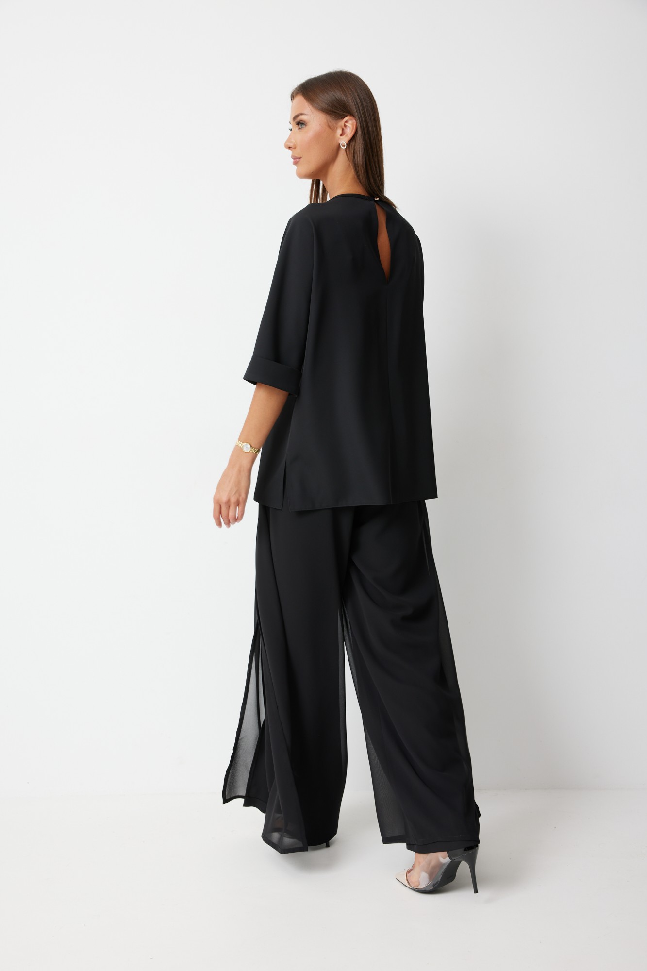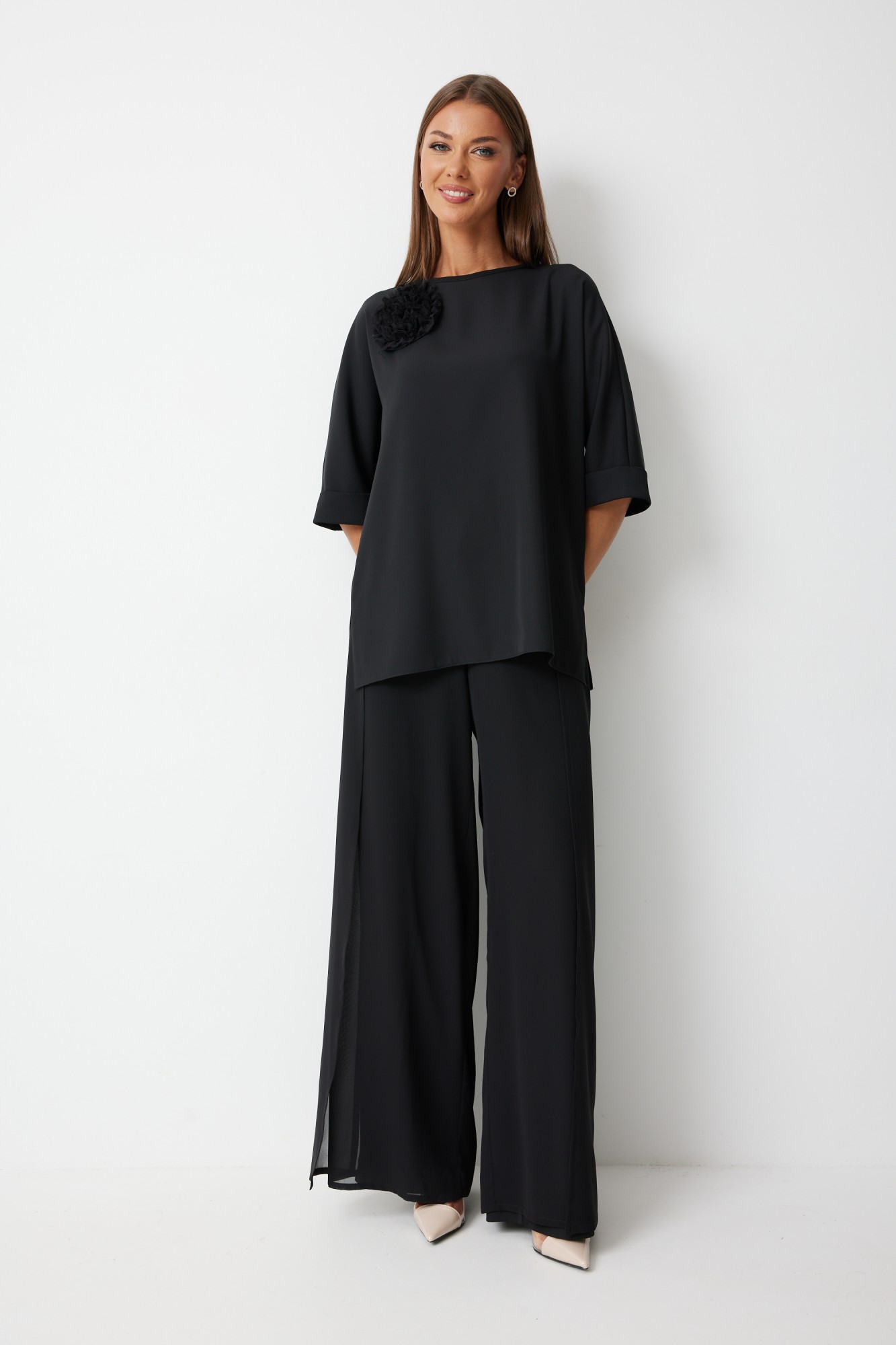 Костюм состоит из блузы и брюк. Блуза женская прямого силуэта закрывающая линию паха с цельнокроеными рукавами. К блузке прилагается съёмный декор – цветок. По боковым швам располагаются разрезы. Спинка с центральным швом и застежкой на навесную петлю и пуговицу. Горловина обработана косой бейкой. Рукав до локтя, низ рукава обработан отрезной отворачивающейся манжетой, закрепленной по швам. Низ блузки обработан швом «в подгибку». Брюки прямого силуэта, выполнены из шифоновой ткани на подкладке полной длинны. Боковой шов брюк открыт. Синка брюк заходит на перед по верхней части. Подкладка из не просвещающейся креповой ткани. Верх брюк обработан отрезным поясом. Центральная часть пояса без резинки, остальной пояс на резинке. Низ брюк обработан швом « в подгибку». Цвет материала может отличаться по тону в зависимости от настроек вашего монитора!.