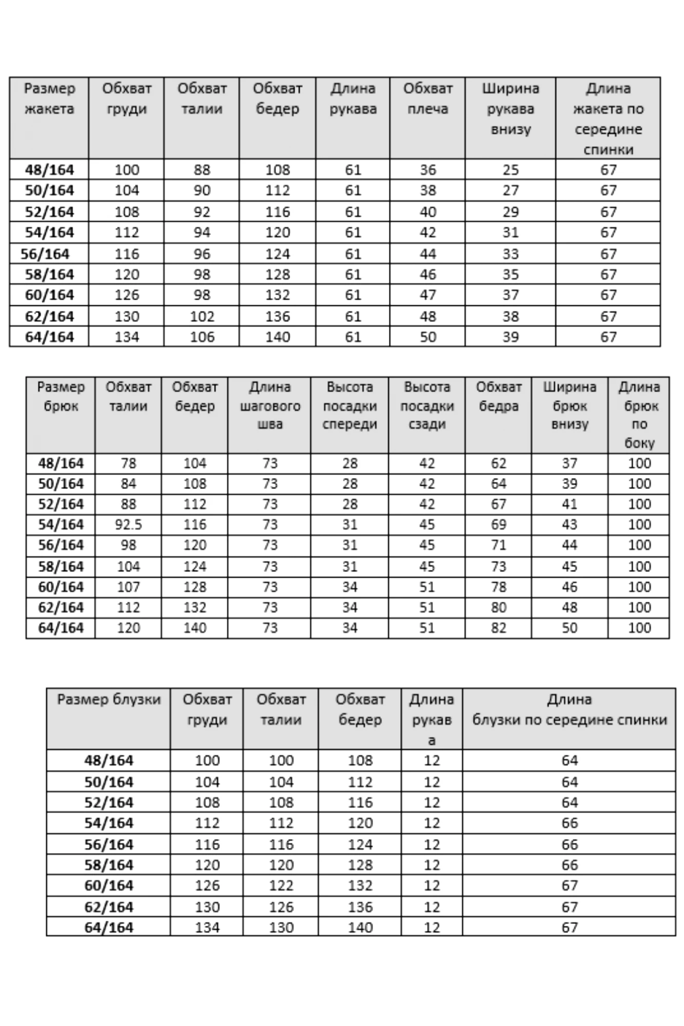 Таблица размеров
