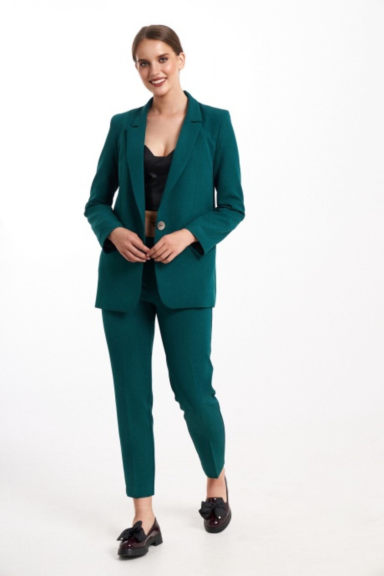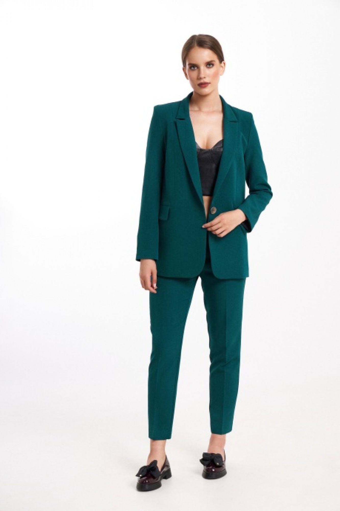 Шикарный 2-х предметный комплект, состоящий из жакета и брюк. Универсальный женский жакет на подкладке прямого силуэта. Перед с центральной застежкой на одну пуговицу, с карманами и с клапанами в шве.
