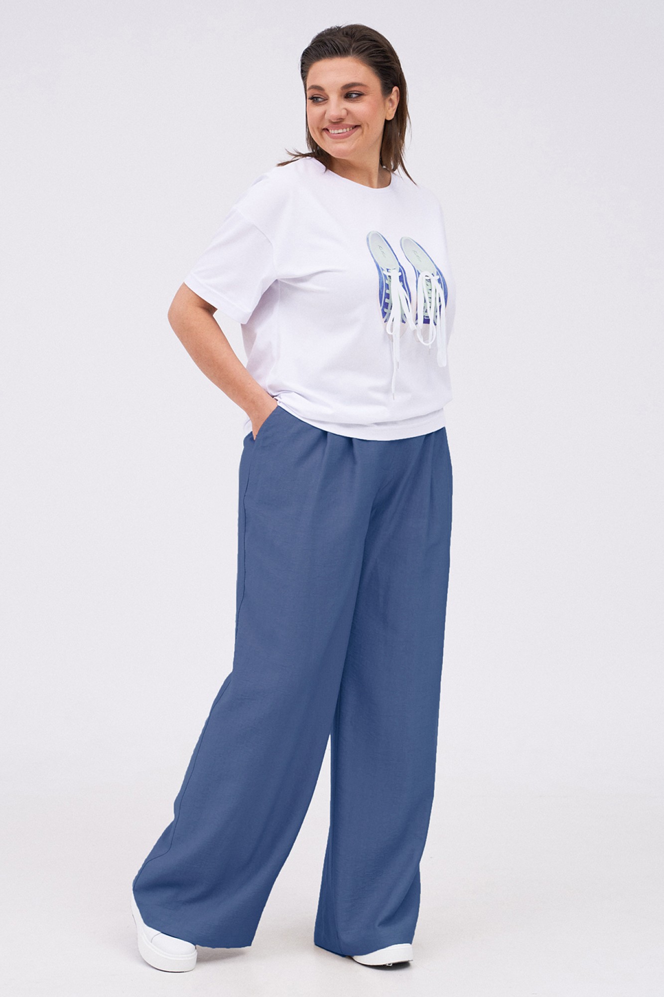 2-х предметный комплект, состоящий из футболки и брюк. Объёмная футболка со спущенной линией плеча. По переду принт «кеды» со шнурками, завязанными на бантик. Брюки-палаццо прямого силуэта. На передних половинках брюк по линии талии заложены две односторонние складки, направленные в сторону бокового шва и функциональные карманы с отрезным бочком. На задних половинках находятся по две талиевые вытачки. Пояс отрезной, притачной. На поясе шлевки. Верхний край пояса расположен на естественной линии талии. Застежка брюк – классический гульфик. Застежка пояса на две пуговицы и две петли. Длина брюк в пол.