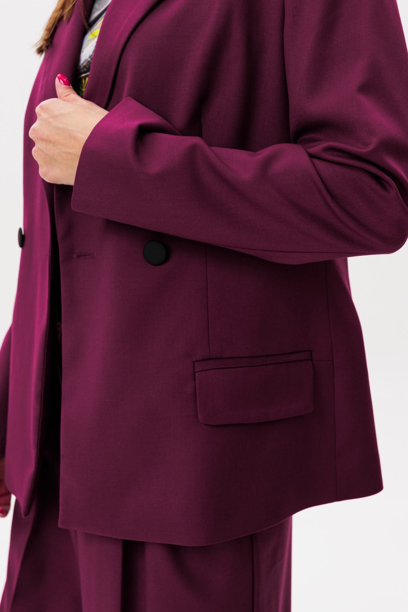 Идеальный выбор для создания утонченного образа — классический костюм, объединяющий двубортный жакет с английским воротником и брюки палаццо свободного силуэта. Жакет выполнен из костюмной ткани. Модель отличается строгим английским воротником, прорезными карманами в рамку с клапанами, которые подчеркивают лаконичность дизайна, и двубортной застежкой, гарантирующей идеальную посадку по фигуре.