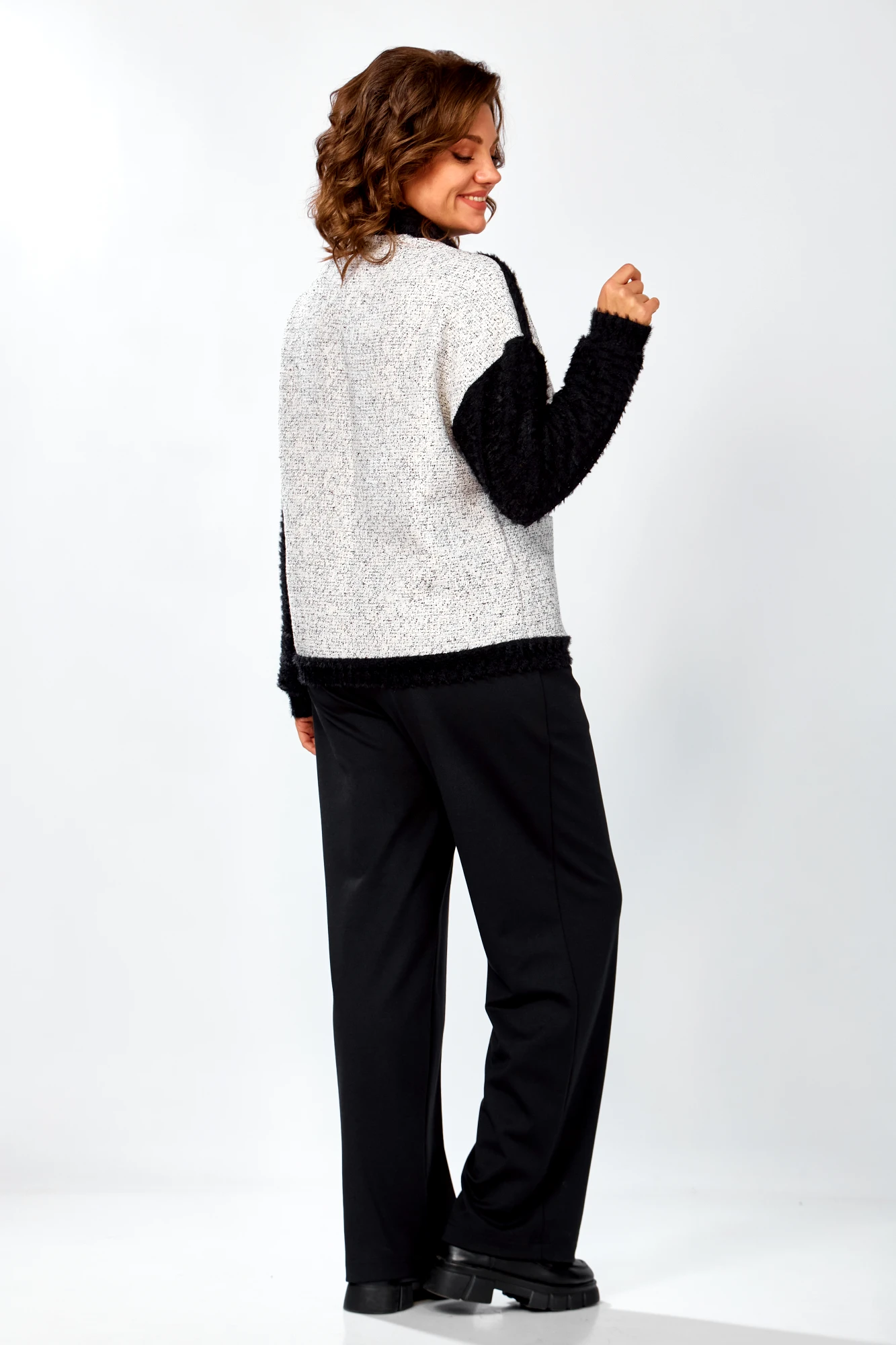 Джемпер состав: ПЭ 70%, Вискоза 26%, Эластан 4% Брюки Состав: Вискоза 47%, ПЭ 30%, ПА 19%, Эластан 4%