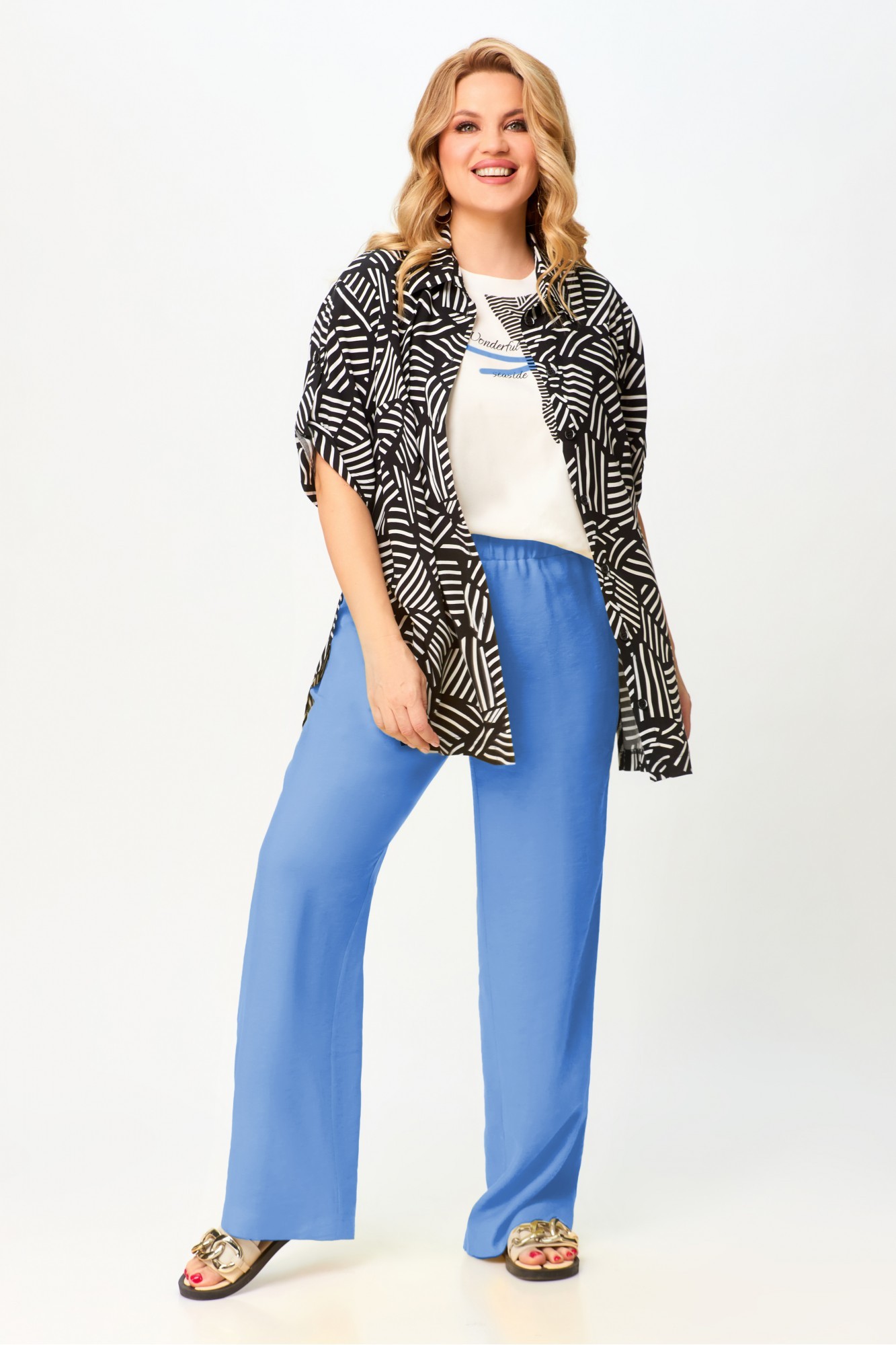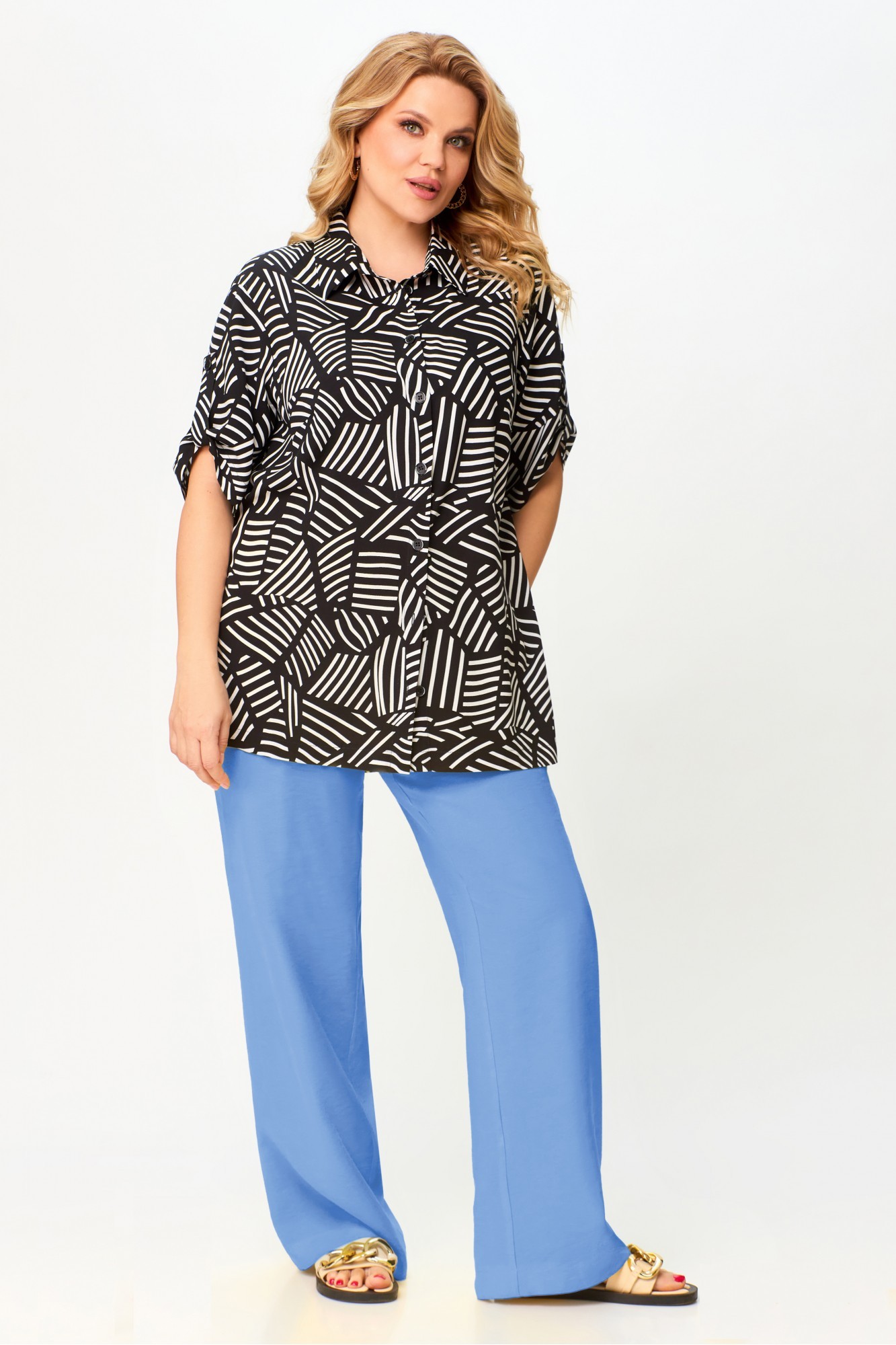 Блузка женская, прямого силуэта, длиной ниже линии бедер, со спущенной линией плеча, с втачными рукавами, с разрезами в боковых швах, с втачным воротником, с центральной сквозной застежкой на 7 петель и 7 пуговиц и 1 пуговицу и 1 петлю на стойке воротника. Детали переда блузки с цельнокроеными планками, с нагрудными вытачками. Деталь спинки блузки по центру со складкой, исходящей от горловины. Рукава втачные одношовные, короткие, с застежкой на «хлястике» на 1 петлю и пуговицу. Воротник сорочечный с отрезной стойкой. Брюки на бедрах, плотно облегающие вверху и прямые к низу, с притачным поясом, в который вставлена эластичная тесьма. На передних половинках брюк в боковых швах обработаны наклонные карманы.