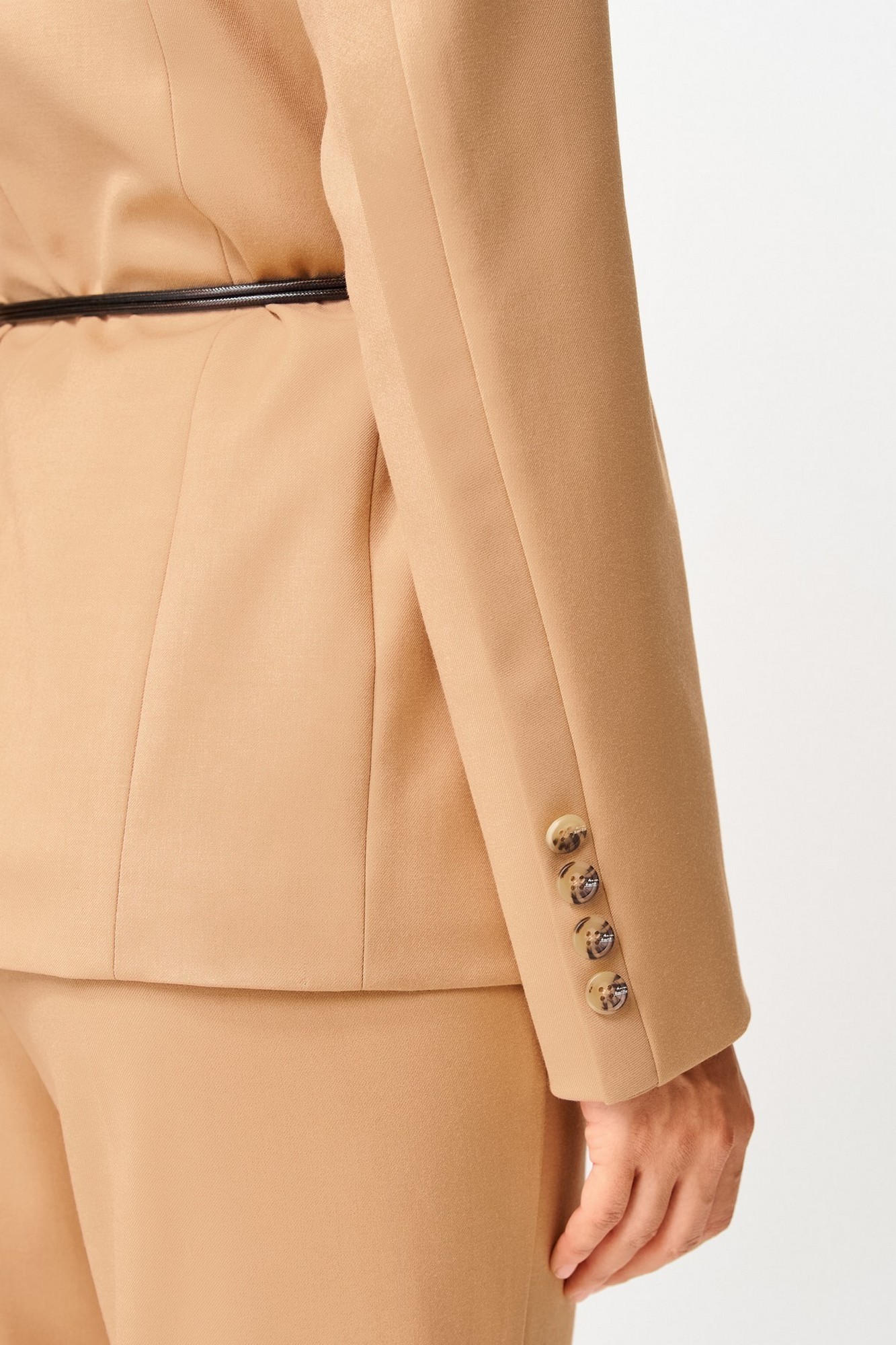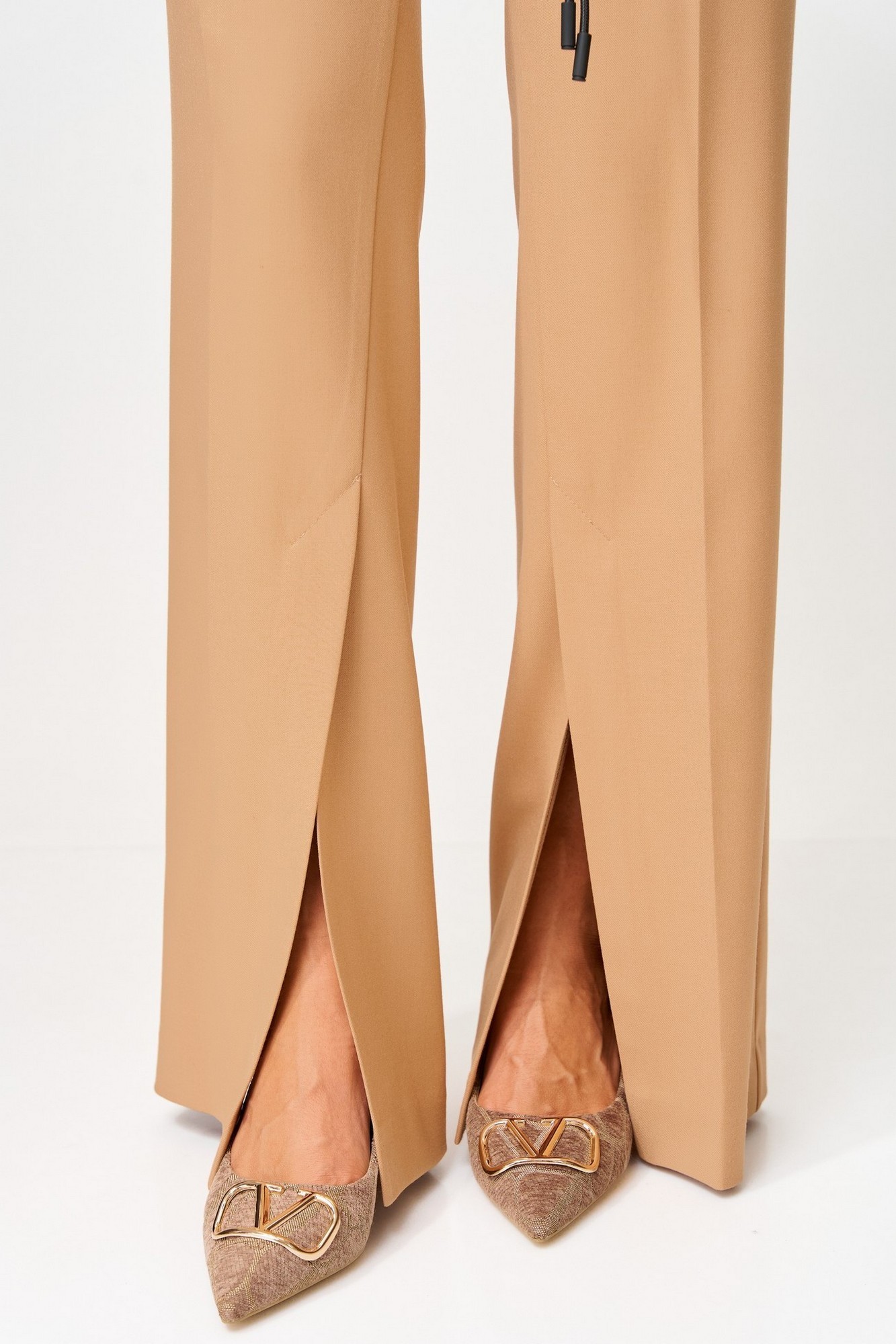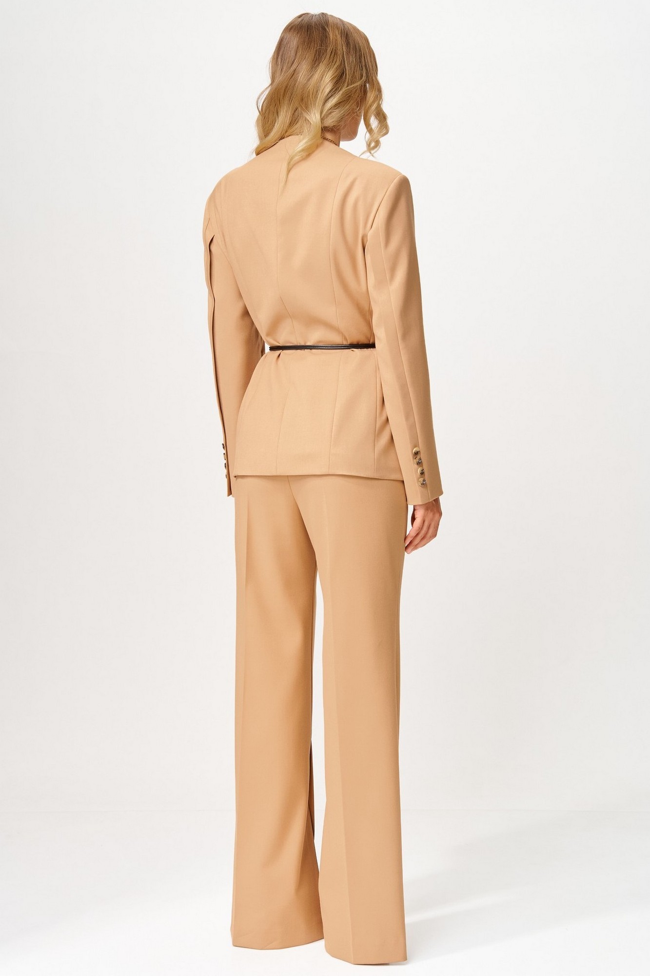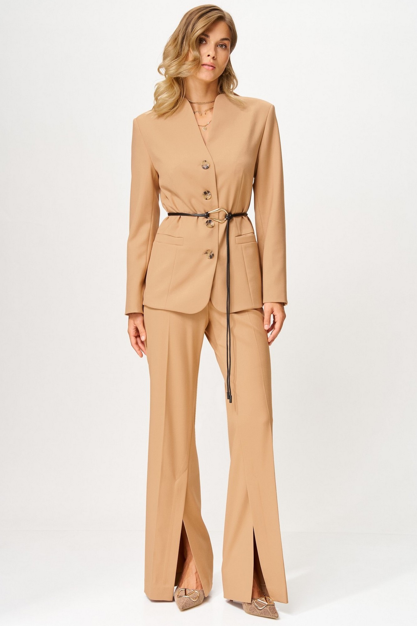 Ультрамодный деловой костюм от LAIKONY, состоящий из жакета и брюк. Жакет полуприлегающего силуэта с центральной застежкой на 4 петли и 4 пуговицы. Вырез горловины жакета фигурной формы. Детали переда жакета с отрезными бочками и вертикальными нагрудными вытачками. Карманы горизонтальные прорезные с листочками с втачными концами. Деталь спинки жакета со средним швом, отрезными бочками и рельефными швами. Рукава втачные двухшовные, по локтевым швам вставлена планка, по низу декоративно прикреплены по 4 пуговицы. Жакет с притачной понизу подкладкой. Съемный пояс в комплекте. Брюки на бедрах, плотно облегающие вверху и расширенные к низу. Пояс притачной, по спинке пояса вставлена эластичная тесьма. Застежка на тесьму-молнию, 1 потайной крючок и 1 потайную петлю и пуговицу. В боковых швах обработаны наклонные карманы, на передних и задних половинках брюк обработаны вытачки и заутюжены «канты». Внизу шаговых швов обработаны шлицы. На поясе прикреплены 5 шлёвок. Декор может отличаться от представленного на фотографии. Наш модный костюм идеально подойдет для деловой встречи и других торжественных мероприятий.