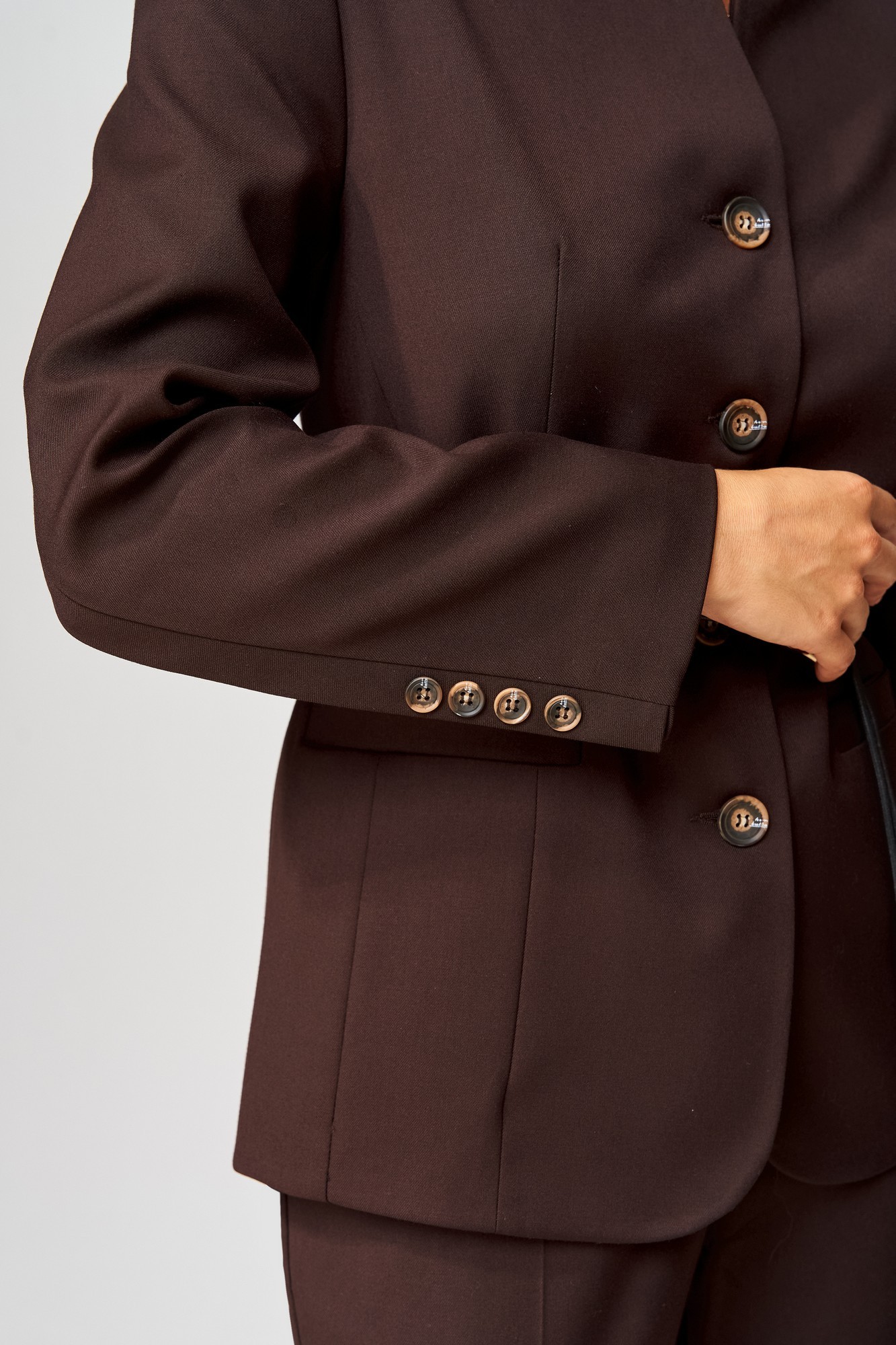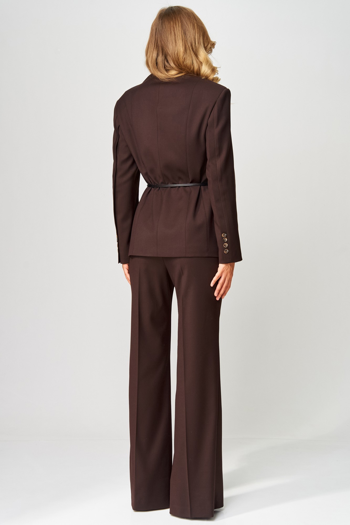 Ультрамодный деловой костюм от LAIKONY, состоящий из жакета и брюк. Жакет полуприлегающего силуэта с центральной застежкой на 4 петли и 4 пуговицы. Вырез горловины жакета фигурной формы. Детали переда жакета с отрезными бочками и вертикальными нагрудными вытачками. Карманы горизонтальные прорезные с листочками с втачными концами. Деталь спинки жакета со средним швом, отрезными бочками и рельефными швами. Рукава втачные двухшовные, по локтевым швам вставлена планка, по низу декоративно прикреплены по 4 пуговицы. Жакет с притачной понизу подкладкой. Съемный пояс в комплекте. Брюки на бедрах, плотно облегающие вверху и расширенные к низу. Пояс притачной, по спинке пояса вставлена эластичная тесьма. Застежка на тесьму-молнию, 1 потайной крючок и 1 потайную петлю и пуговицу. В боковых швах обработаны наклонные карманы, на передних и задних половинках брюк обработаны вытачки и заутюжены «канты». Внизу шаговых швов обработаны шлицы. На поясе прикреплены 5 шлёвок. Декор может отличаться от представленного на фотографии. Наш модный костюм идеально подойдет для деловой встречи и других торжественных мероприятий.