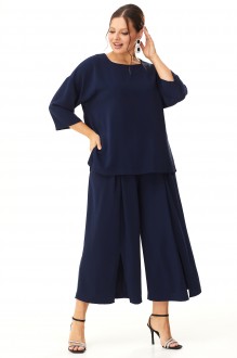 Комплект выполнен из плотной шелковистой ткани. Туника средней длины, свободного силуэта, линия плеча приспущена, по спинке шов и застежка «молния», по боковым швам – разрезы. Рукав 3/4, съёмный пояс подчёркивает линию талии. В этом комплекте именно брюки привлекают внимание: прямые, укороченные, впереди с глубокими встречными вставками и кокетливыми разрезами, силуэтом больше напоминающие юбку. У боковых швов внутренние карманы. Брюки оформлены поясом (по бокам резинки), застежка «молния» + пуговица.