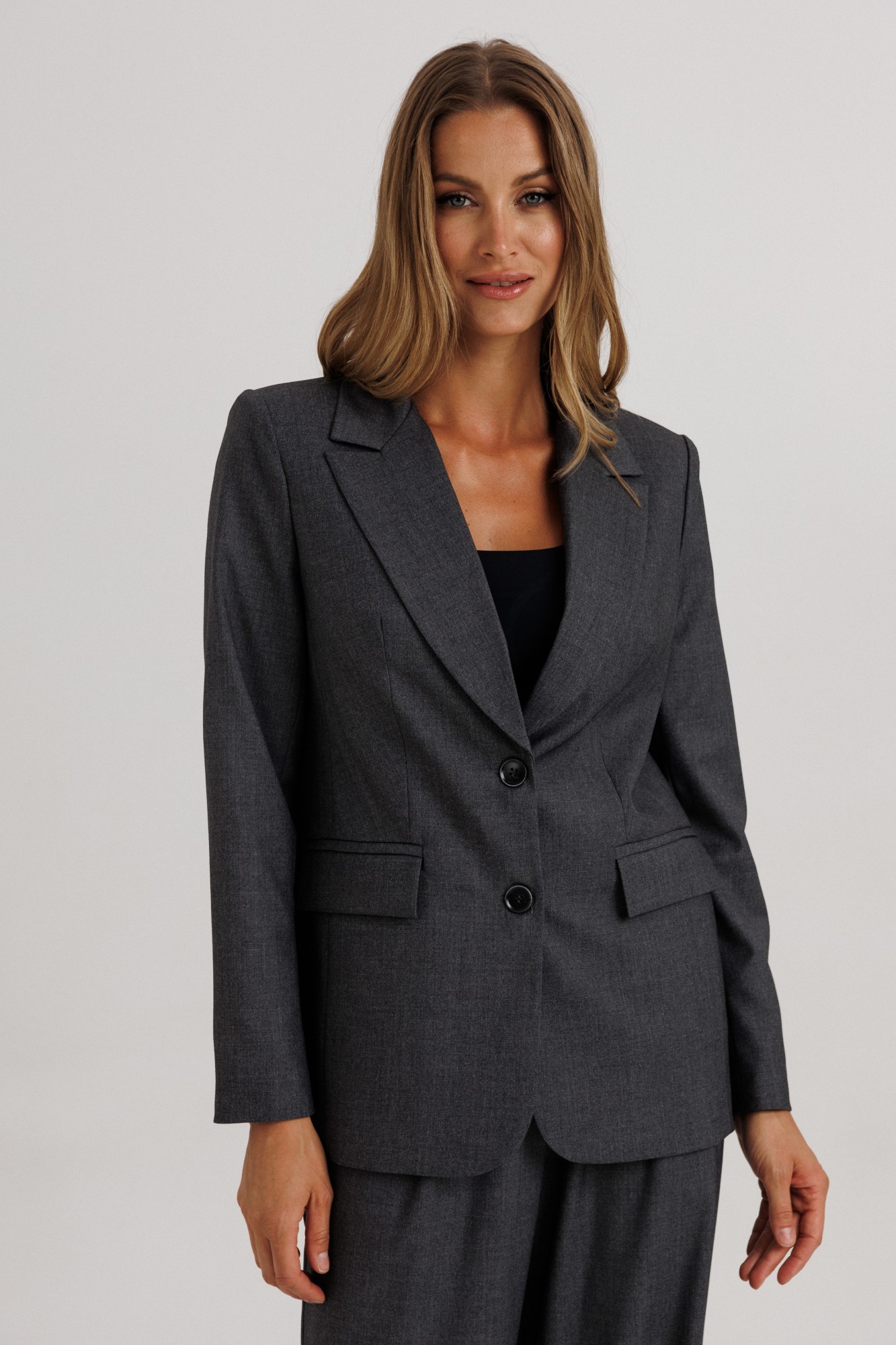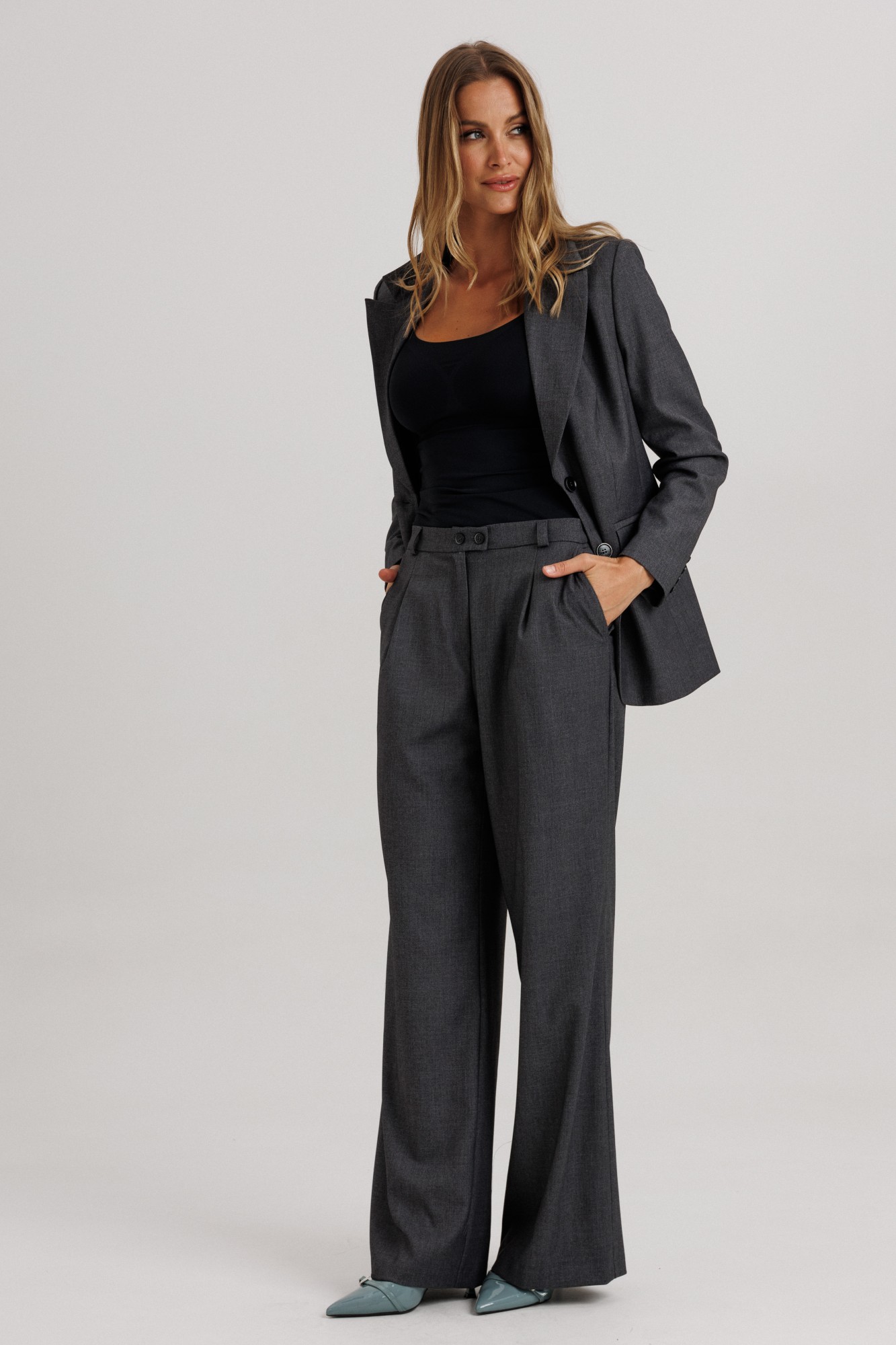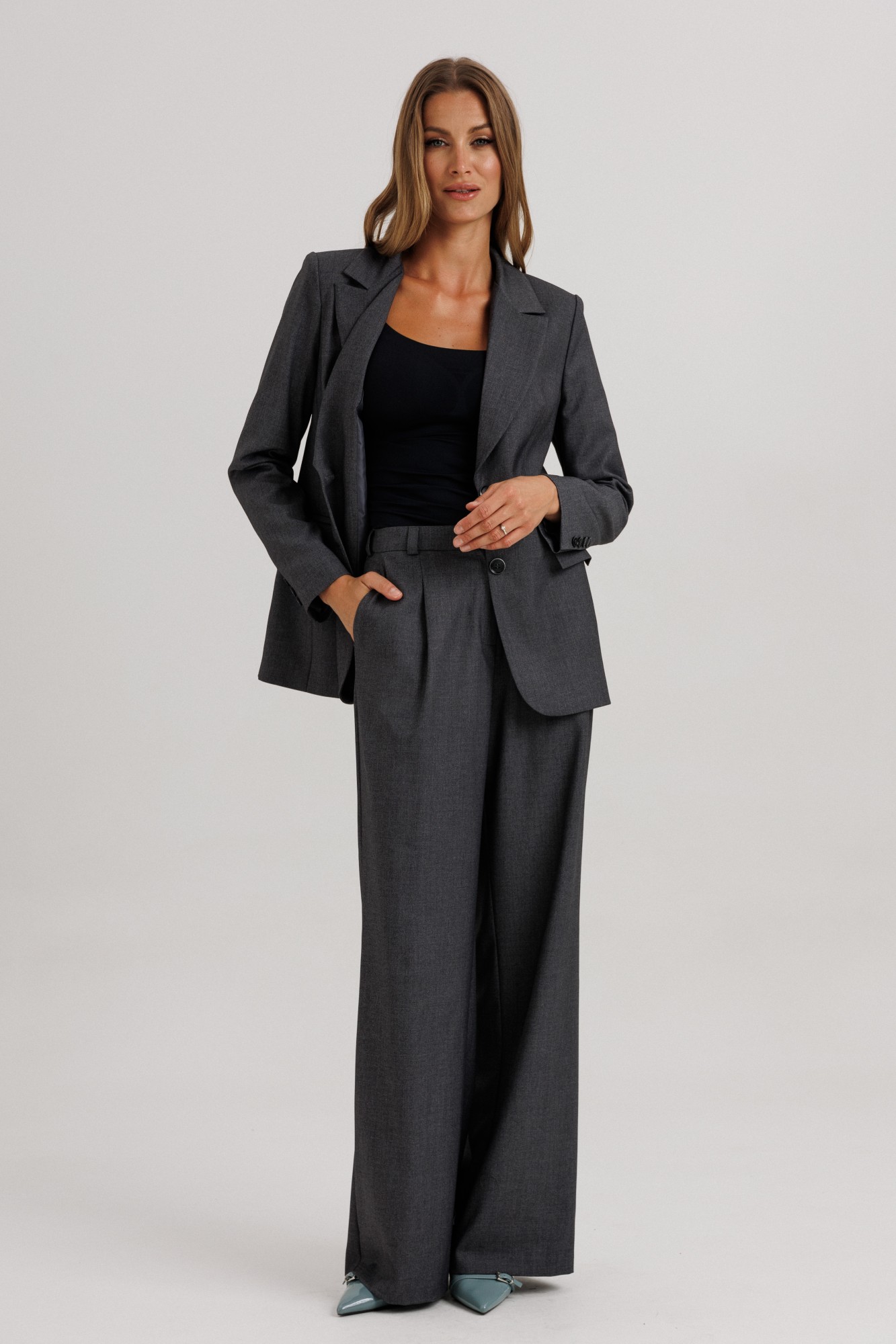 Стильный гармоничный комплект в стиле умеренного оверсайза, состоящий из свободного жакета и широких брюк. Эффектной деталью комплекта выступает высокая открытая шлица на спинке жакета, закрепленная пуговицами. Жакет прямого свободного силуэта на подкладке. На полочке изделия расположены вертикальные выточки и притачные боковые детали. Фронтально горизонтально расположены функциональные прорезные карманы с листочкой и клапаном. Горловина оформлена глубоким английским отложным воротником с лацканами. На спинке жакета расположена открытая высокая шлица (38 см) в среднем шве изделия, которая закреплена нефункциональными пуговицами. Длина изделия жакета по среднему шву жакета 69-71 см (в зависимости от размерного ряда). Рукав двухшовный, длиной 60-61 см. Брюки комплекта созданы в свободном стиле. В пояс брюк по спинке вставлена эластичная тесьма, шириной 3 см. Спереди пояс фиксируется горизонтально на петли/пуговицы и вертикалную закрытую клапан-молнию (гульфик). При желании в пояс можно вставить ремень, так как имеются шлевочные держатели. В боковых швах карманы с наклонным входом, на поясной линии талии переда расположена неглубокая складка для свободы движения, на задних полотнищах линии талии: вытачки. Длина брюк по боковому шву 108 см (без учета высоты пояса). (фурнитура может отличаться от представленной на рекламном фотоматериале). Особые рекомендации: рекомендуется холодная деликатная ручная стирка, без использования отбеливающих СМС, без интенсивного трения. Сушка в вертикальном положении. ВТО с минимальным паром.
