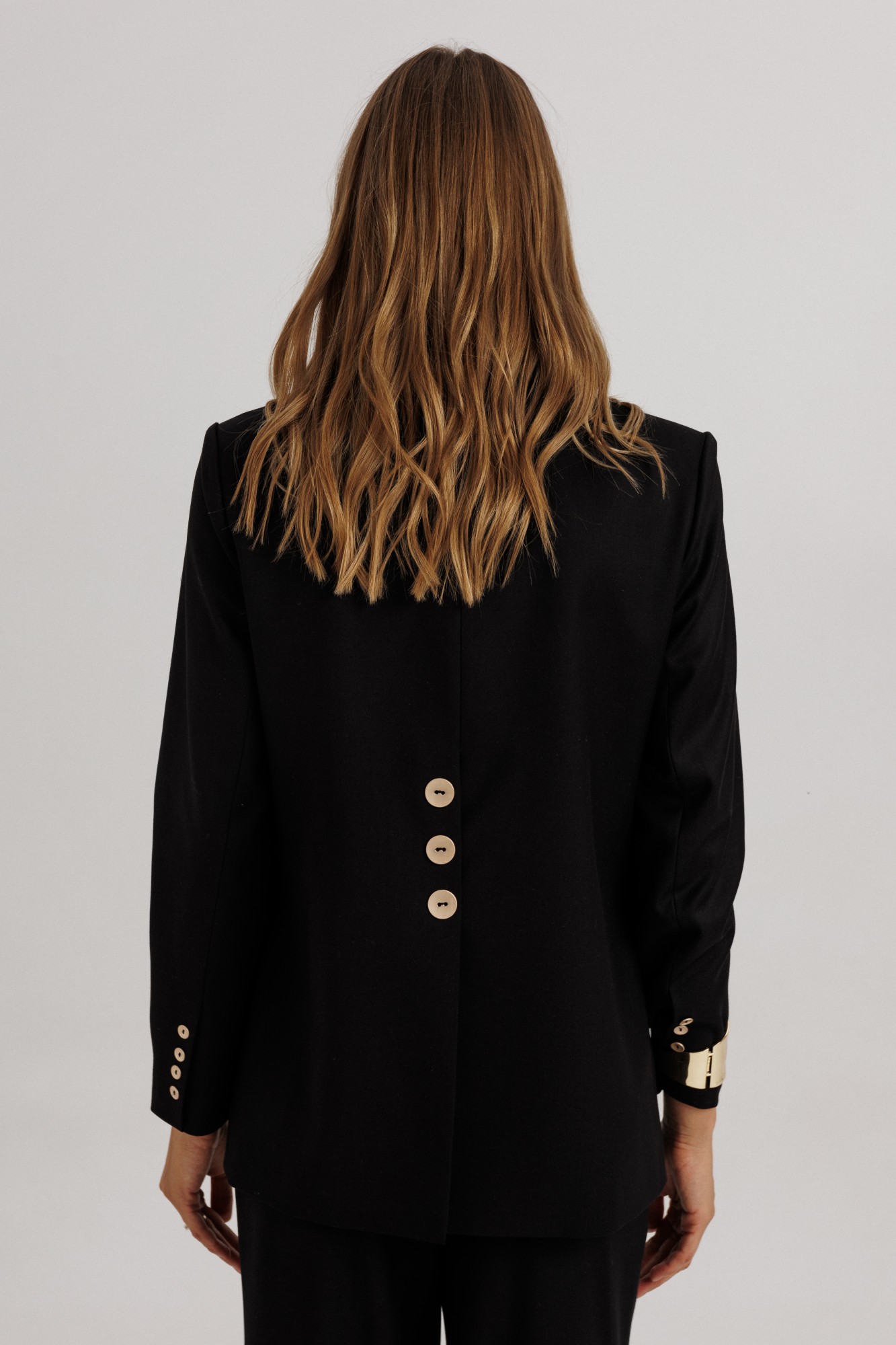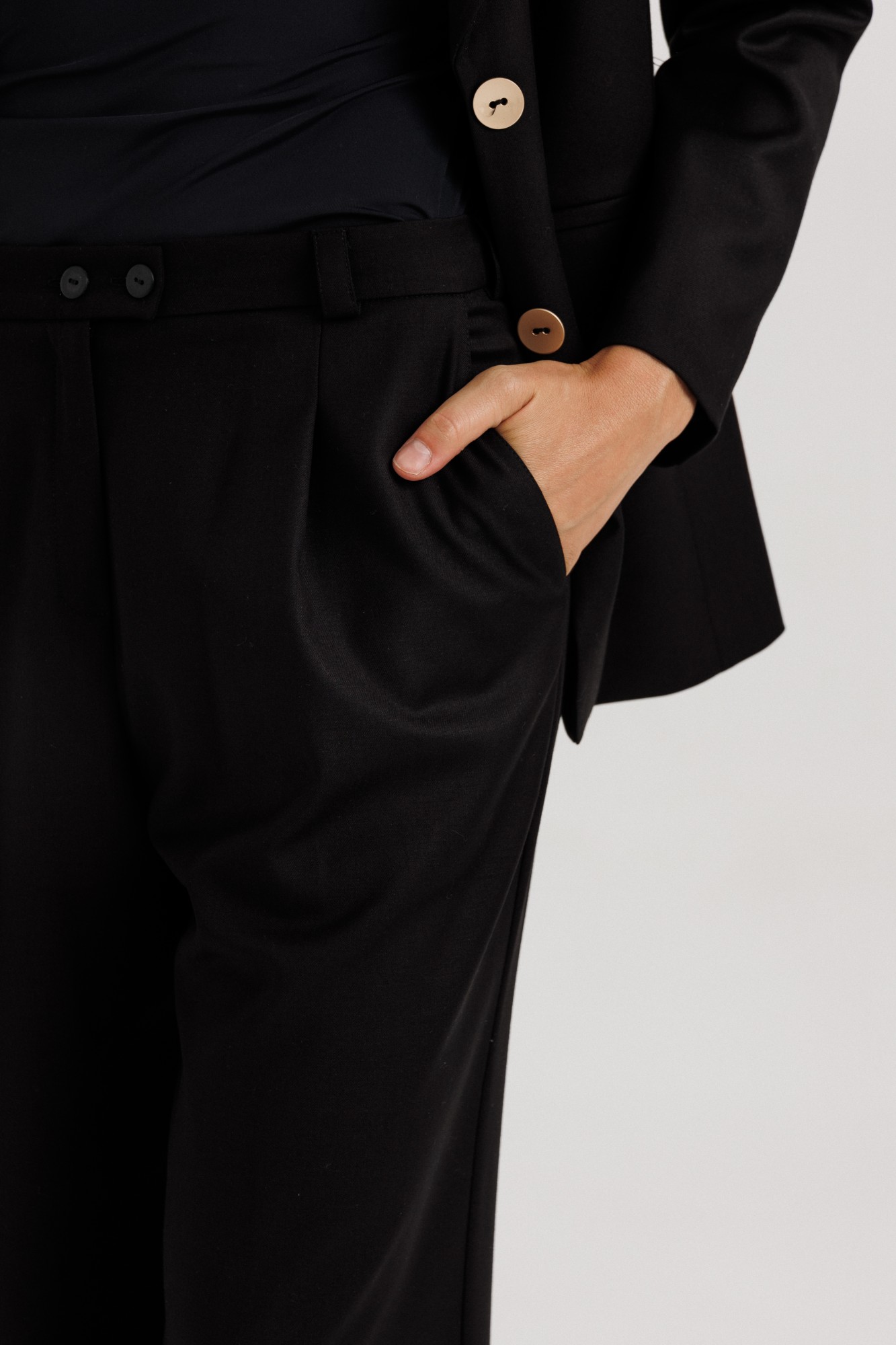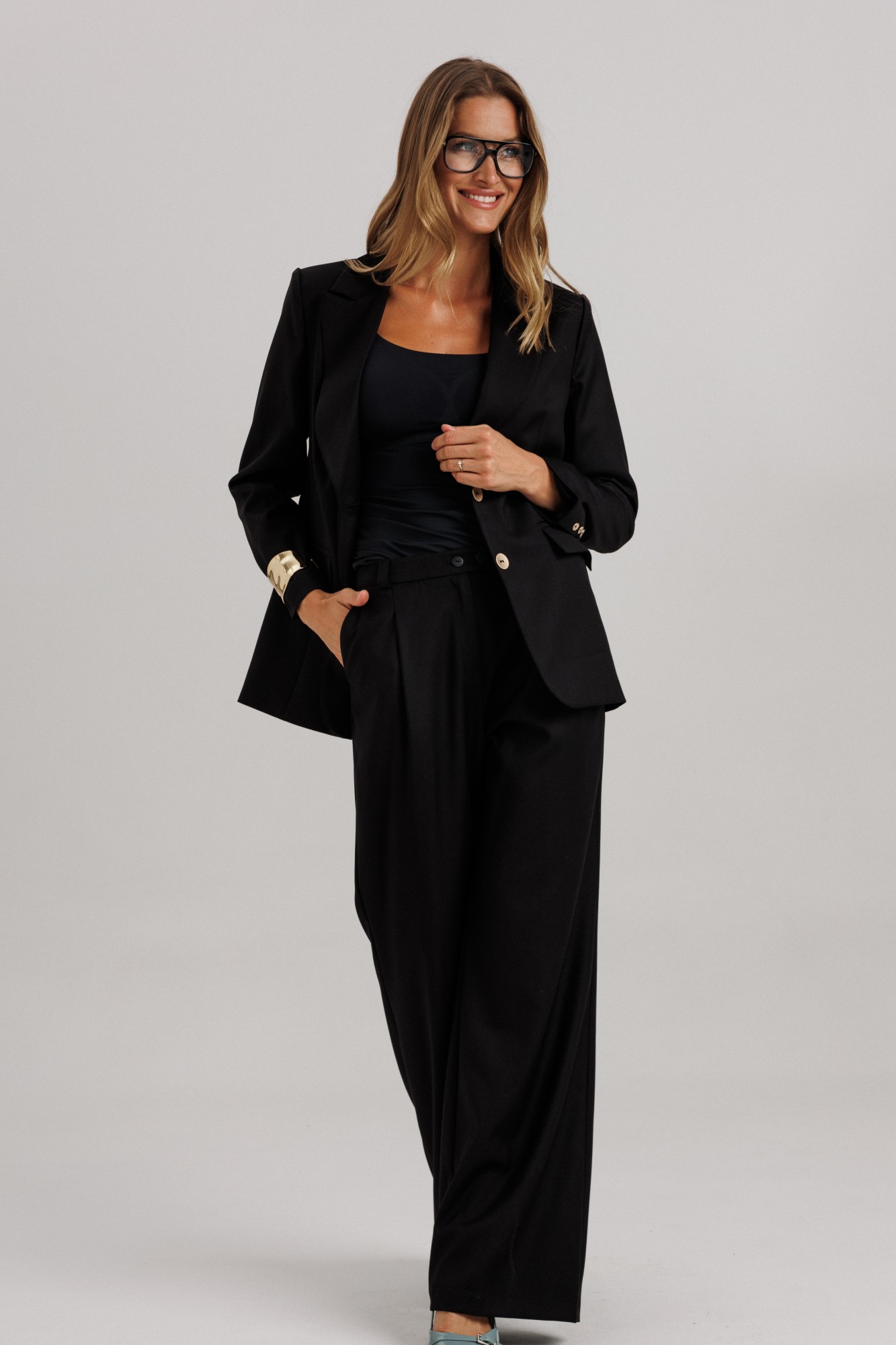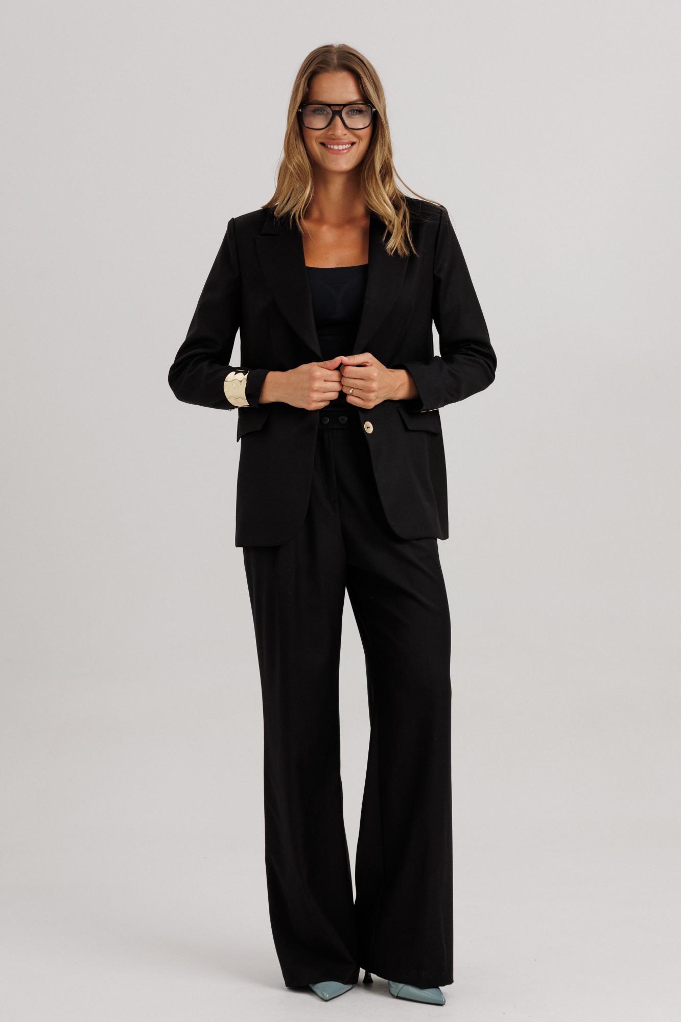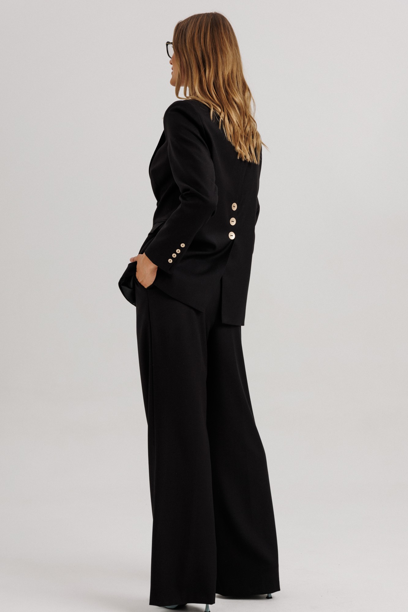 Стильный гармоничный комплект в стиле умеренного оверсайза, состоящий из свободного жакета и широких брюк. Эффектной деталью комплекта выступает высокая открытая шлица на спинке жакета, закрепленная пуговицами. Жакет прямого свободного силуэта на подкладке. На полочке изделия расположены вертикальные выточки и притачные боковые детали. Фронтально горизонтально расположены функциональные прорезные карманы с листочкой и клапаном. Горловина оформлена глубоким английским отложным воротником с лацканами. На спинке жакета расположена открытая высокая шлица (38 см) в среднем шве изделия, которая закреплена нефункциональными пуговицами. Длина изделия жакета по среднему шву жакета 69-71 см (в зависимости от размерного ряда). Рукав двухшовный, длиной 60-61 см. Брюки комплекта созданы в свободном стиле. В пояс брюк по спинке вставлена эластичная тесьма, шириной 3 см. Спереди пояс фиксируется горизонтально на петли/пуговицы и вертикальную закрытую клапан-молнию (гульфик). При желании в пояс можно вставить ремень, так как имеются шлевочные держатели. В боковых швах карманы с наклонным входом, на поясной линии талии переда расположена неглубокая складка для свободы движения, на задних полотнищах линии талии: вытачки. Длина брюк по боковому шву 108 см (без учета высоты пояса). (фурнитура может отличаться от представленной на рекламном фотоматериале). Особые рекомендации: рекомендуется холодная деликатная ручная стирка, без использования отбеливающих СМС, без интенсивного трения. Сушка в вертикальном положении. ВТО с минимальным паром.