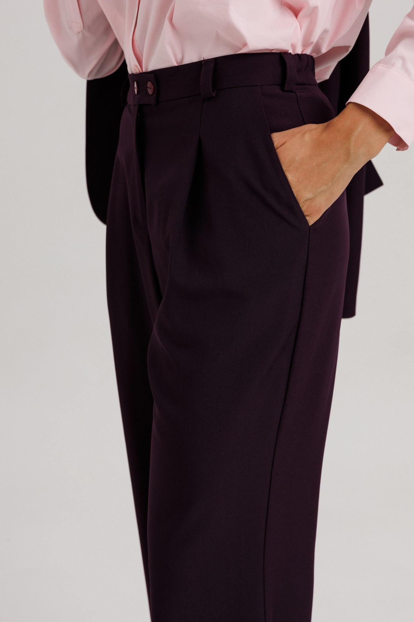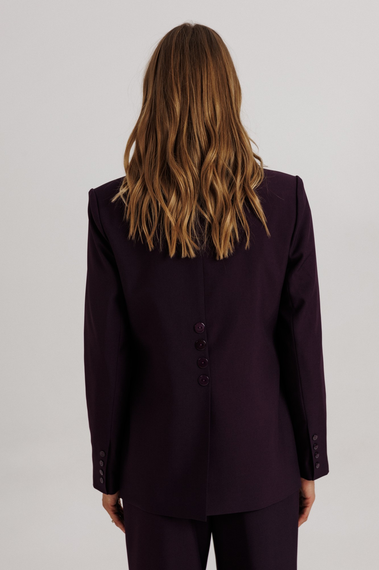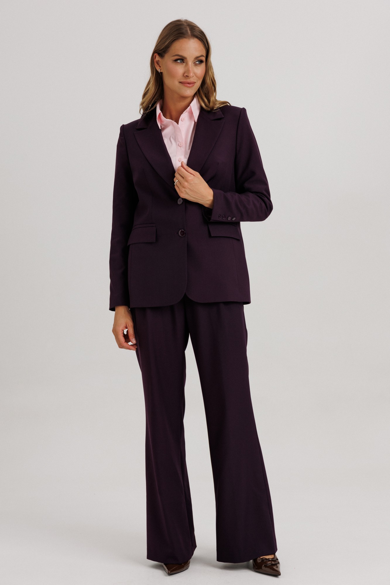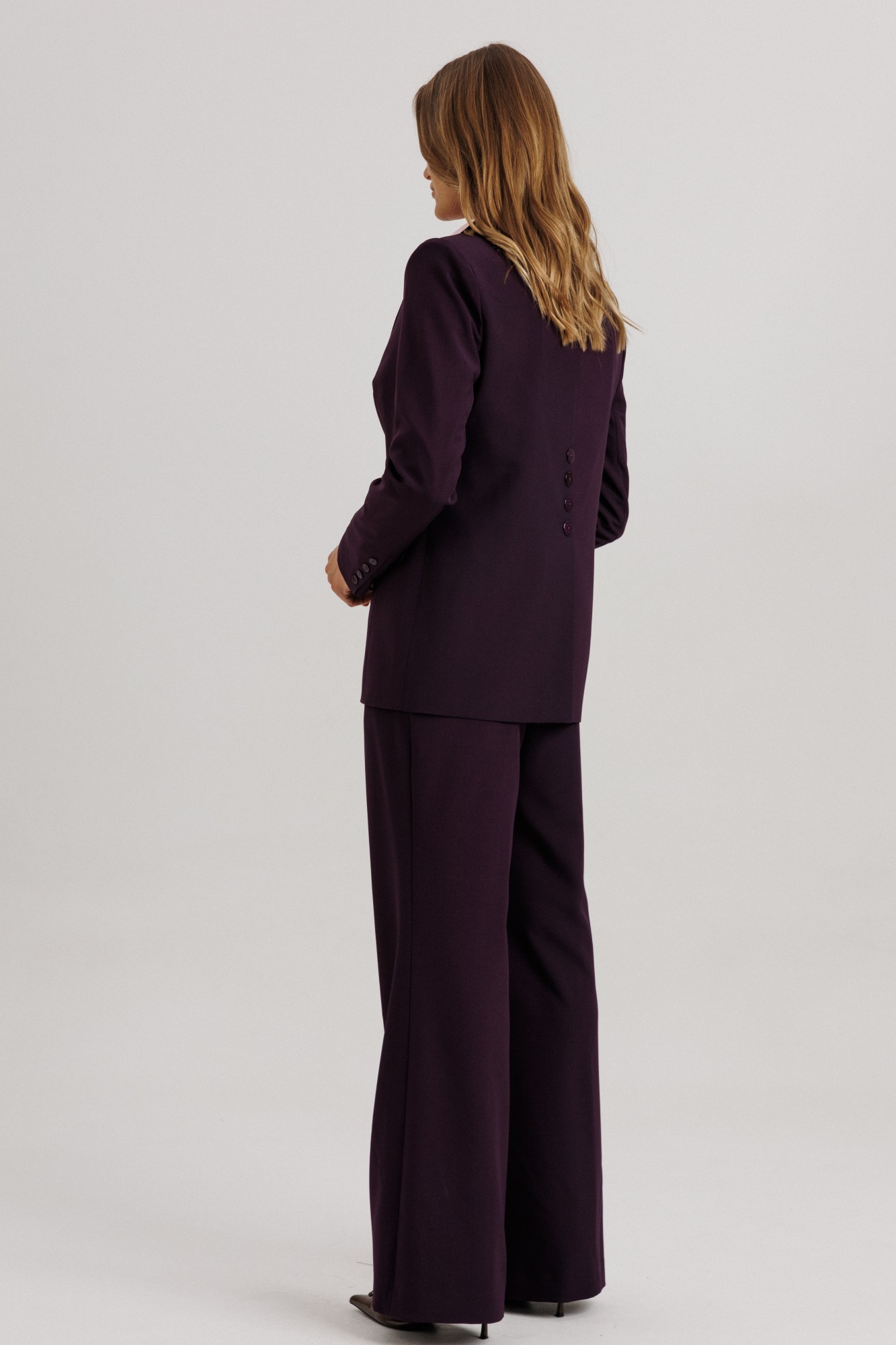 Стильный гармоничный комплект в стиле умеренного оверсайза, состоящий из свободного жакета и широких брюк. Эффектной деталью комплекта выступает высокая открытая шлица на спинке жакета, закрепленная пуговицами. Жакет прямого свободного силуэта на подкладке. На полочке изделия расположены вертикальные выточки и притачные боковые детали. Фронтально горизонтально расположены функциональные прорезные карманы с листочкой и клапаном. Горловина оформлена глубоким английским отложным воротником с лацканами. На спинке жакета расположена открытая высокая шлица (38 см) в среднем шве изделия, которая закреплена нефункциональными пуговицами. Длина изделия жакета по среднему шву жакета 69-71 см (в зависимости от размерного ряда). Рукав двухшовный, длиной 60-61 см. Брюки комплекта созданы в свободном стиле. В пояс брюк по спинке вставлена эластичная тесьма, шириной 3 см. Спереди пояс фиксируется горизонтально на петли/пуговицы и вертикалную закрытую клапан-молнию (гульфик). При желании в пояс можно вставить ремень, так как имеются шлевочные держатели. В боковых швах карманы с наклонным входом, на поясной линии талии переда расположена неглубокая складка для свободы движения, на задних полотнищах линии талии: вытачки. Длина брюк по боковому шву 108 см (без учета высоты пояса). (фурнитура может отличаться от представленной на рекламном фотоматериале). Особые рекомендации: рекомендуется холодная деликатная ручная стирка, без использования отбеливающих СМС, без интенсивного трения. Сушка в вертикальном положении. ВТО с минимальным паром.