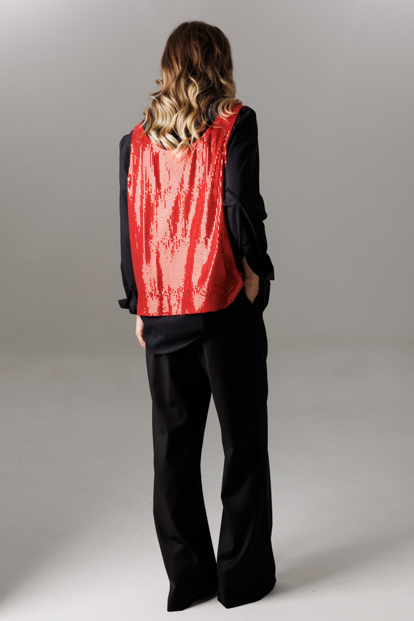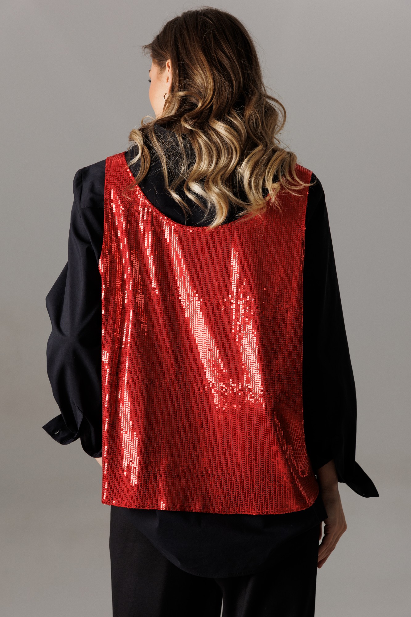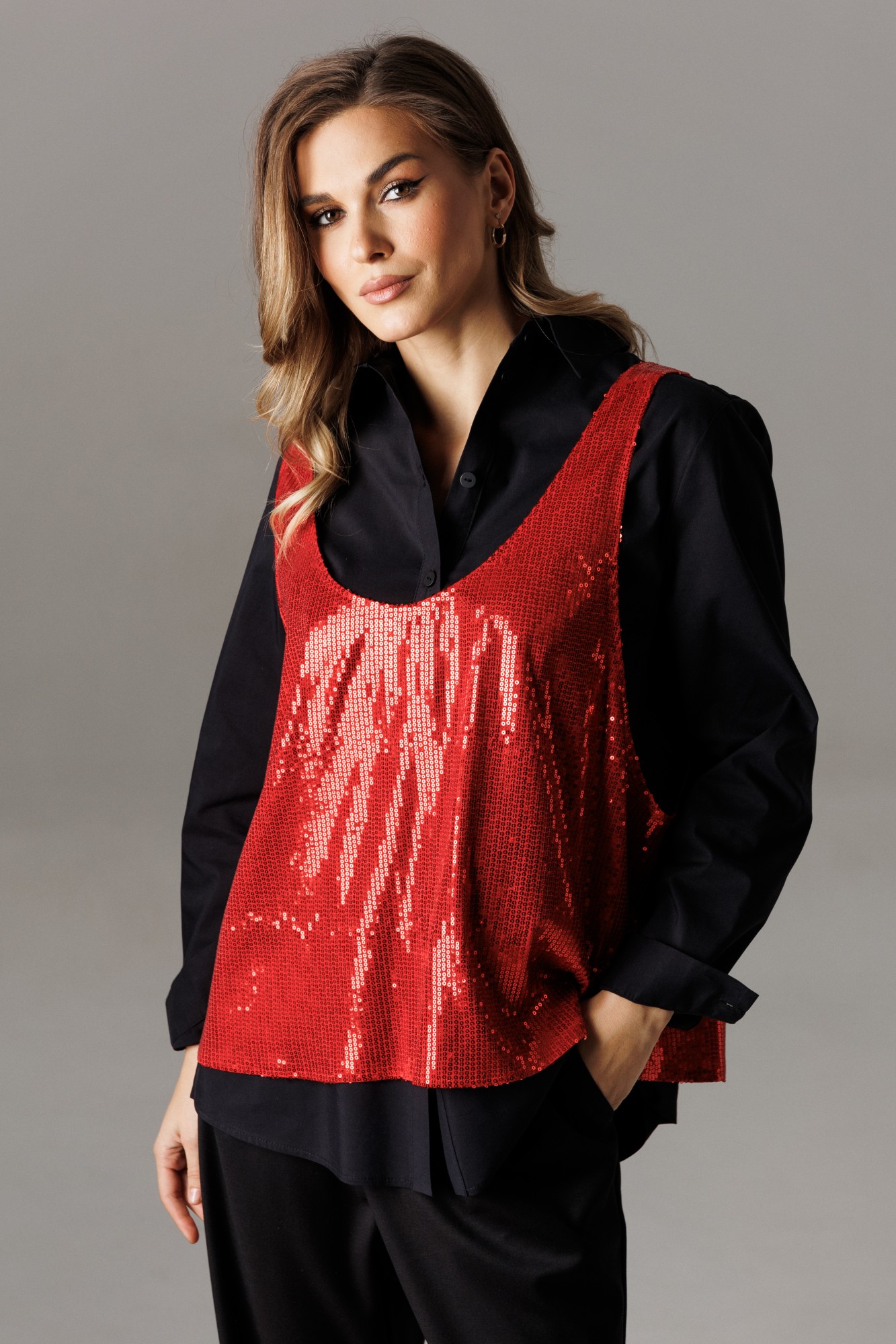 Майка выполнена из трикотажного полотна с пайетками свободного прямого силуэта в стиле оверсайз. Спереди и сзади имеет глубокие овальные вырезы и удлиненную линию проймы. Майка съемная.
