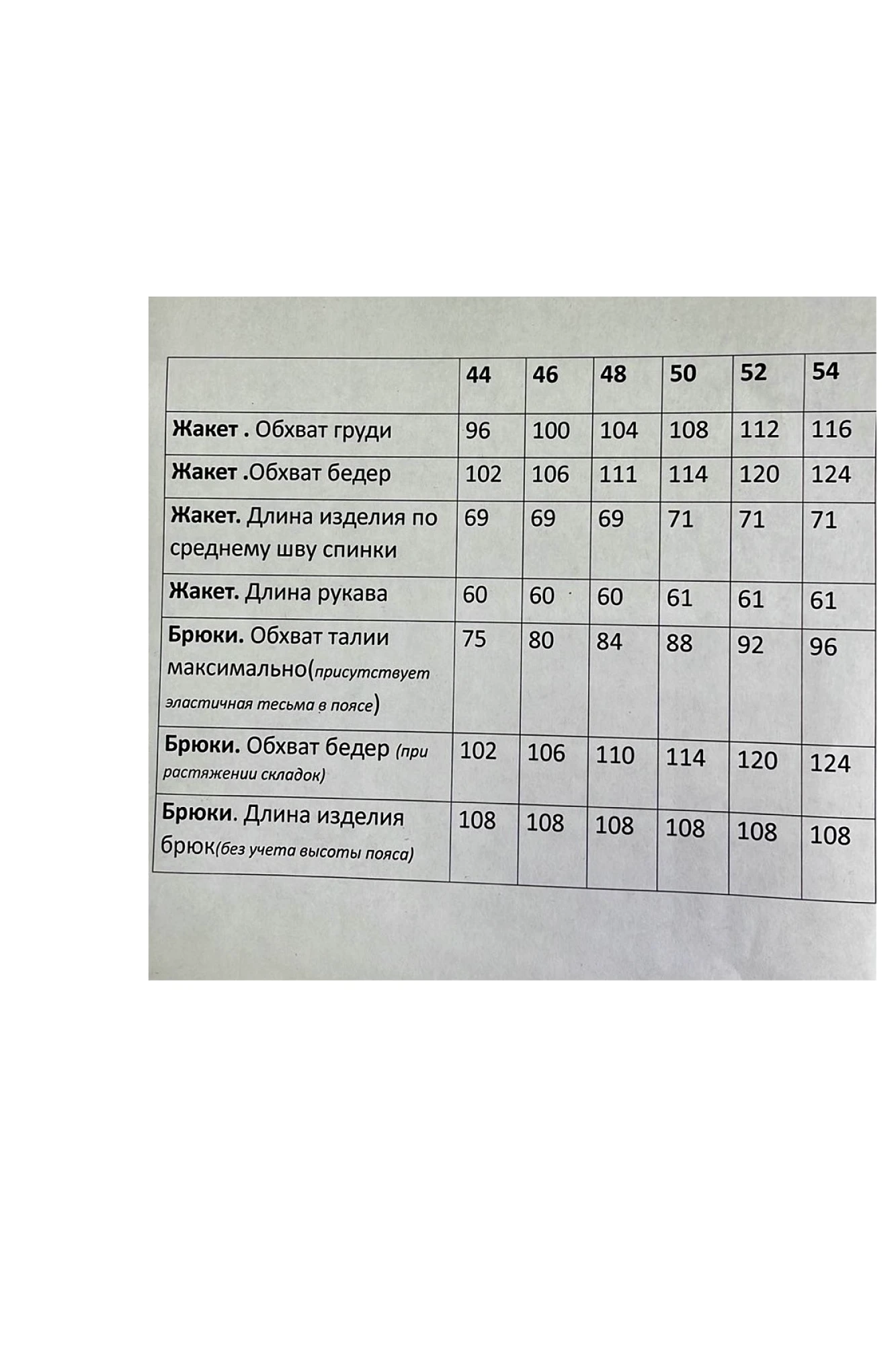 Таблица размеров