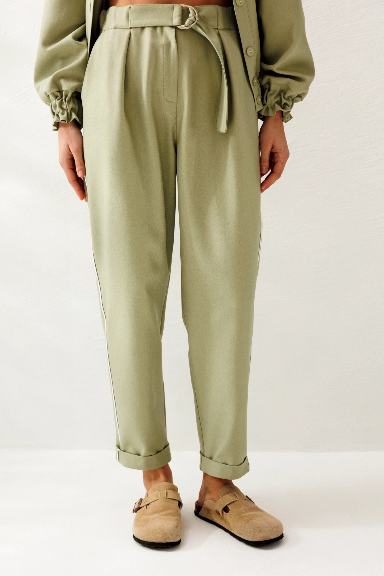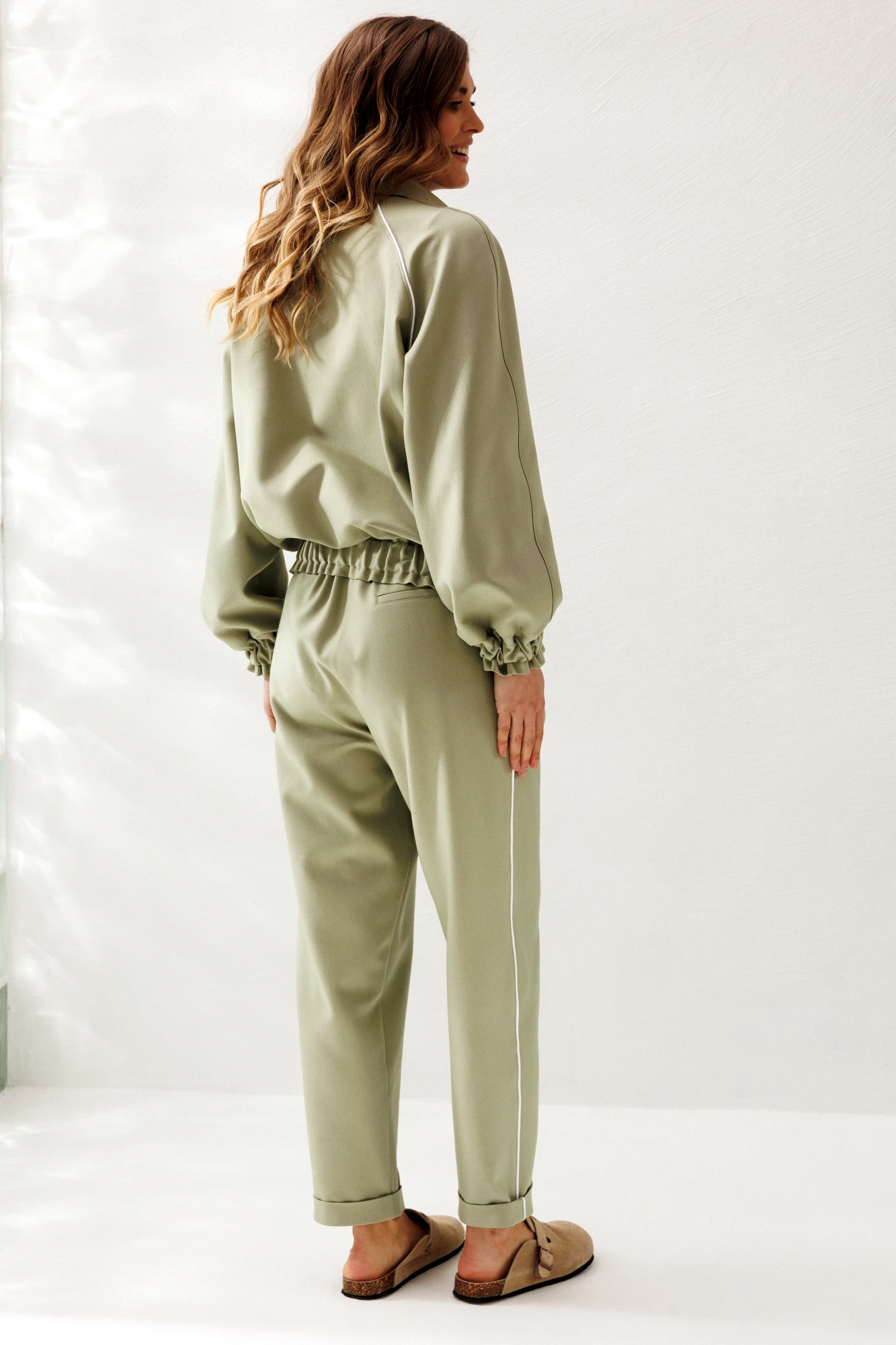 Элегантный комплект-двойка, состоящий из свободного блузона в стиле бомбер без подкладки, с рукавом реглан и брюками-бананами, зауженными к низу. Блузон прямого свободного силуэта на притачном поясе с эластичной тесьмой внутри. Рукав: двухшовный реглан, к низу которого притачен манжет с эластичной тесьмой внутри, которая создает эффект сборки в стиле буф. Длина рукава с плечевой линией и манжетом 75-78 см (в зависимости от размерного ряда). По линии притачивания рукава (спинка и полочка) вставлен кант контрастного тона, который зафиксирован отделочной строчкой. Спереди блузона притачены вертикальные планки для функциональной застежки на петли/пуговицы, шириной по 3 см. Горловина изделия округлая, с отложным рубашечным воротником на стойке. Длина изделия по спинке 62-64 см. Брюки современного силуэта, в стиле «бананы». Карманы-хулиганы расположены в боковых швах. На задней части брюк расположен ложный карман-листочка. В качестве отделки в боковые швы вставлен кант, который зафиксирован отделочной строчкой. Фронтальная застежка на клапан-молнию (гульфик) и пуговицу. Для дополнительной фиксации объема талии спереди расположены полупояса с пряжкой из полуколец. На линии талии переда, также расположены складки-защипы для свободы входа в карман. Оканчиваются брюки деликатным отворотом, шириной 2,5 см. Длина брюк по боковому шву с отворотом 96-98 см. Представленная фурнитура может отличаться от представленной на фото/видео материале. Особые рекомендации: рекомендуется холодная деликатная ручная стирка, без использования отбеливающих СМС, без интенсивного трения. Сушка в вертикальном положении. ВТО с минимальным паром.