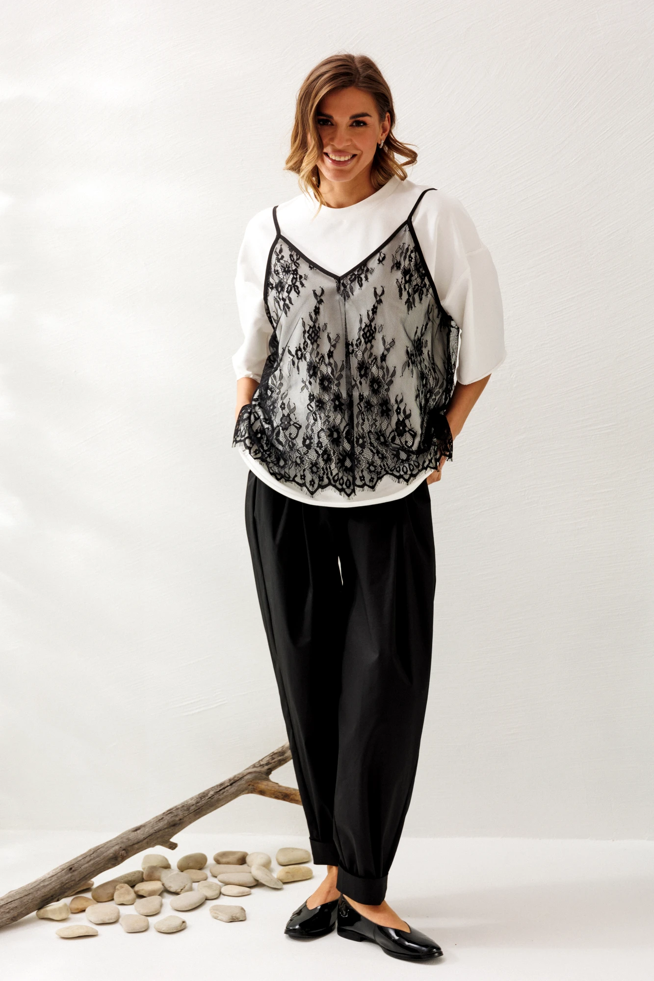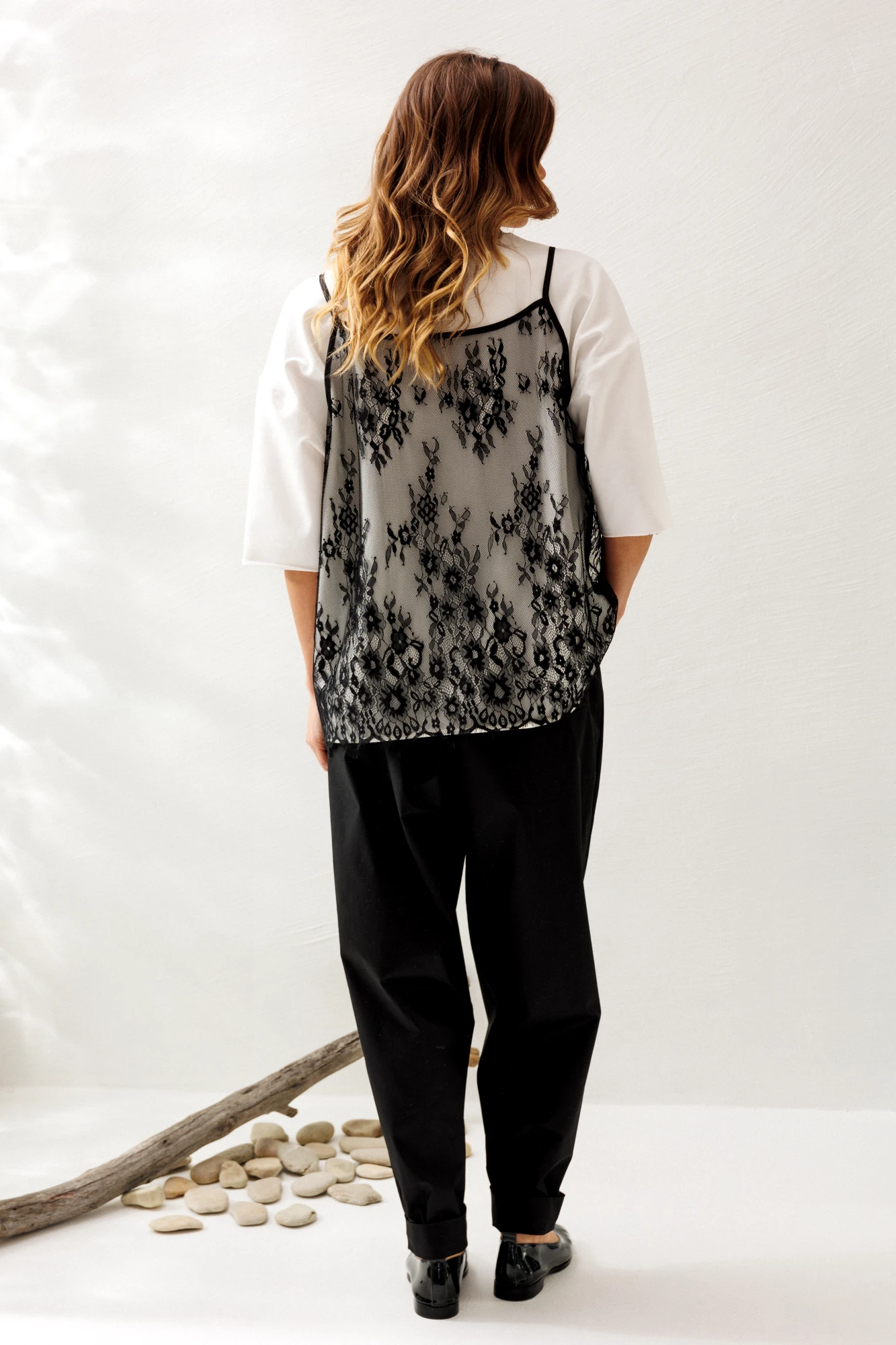 Стильный комплект-тройка: блузон, состоящий из тандема: футболка +майка в стиле оверсайз и свободных брюк-бананов, зауженных к низу. Блузон свободного силуэта, состоящий из футболки со спущенной линией проймы и укороченным втачным рукавом, длиной 26 см. Горловина округлая, оформлена планкой 2,5 см. Длина блузона по спинке 68 см. Низ изделия и рукавов обработаны открытым срезом с проложенной строчкой и ажурной майкой на бретелях. Срезы майки обработаны окантовочной тесьмой 0,7 см. Длина ажурной майки 65 см. Брюки современного свободного силуэта с заужением к низу, в стиле «бананы». Карманы-хулиганы расположены в боковых швах. Спереди на линии талии расположены неглубокие модельные складки. В боковых швах вставлены по всей длине вертикальные планки-лампасы, шириной 4 см. Пояс притачной, с эластичной тесьмой внутри и Дополнительным шнуром для изменения объема талии. Высота пояса 5,5 см. Оканчиваются брюки легкой сборкой и притачным манжетом-отворотом. Длина брюк по боковому шву с отворотом и высотой пояса 100 см. Особые рекомендации: рекомендуется холодная деликатная ручная стирка, без использования отбеливающих СМС, без интенсивного трения. Сушка в вертикальном положении. ВТО с минимальным паром.