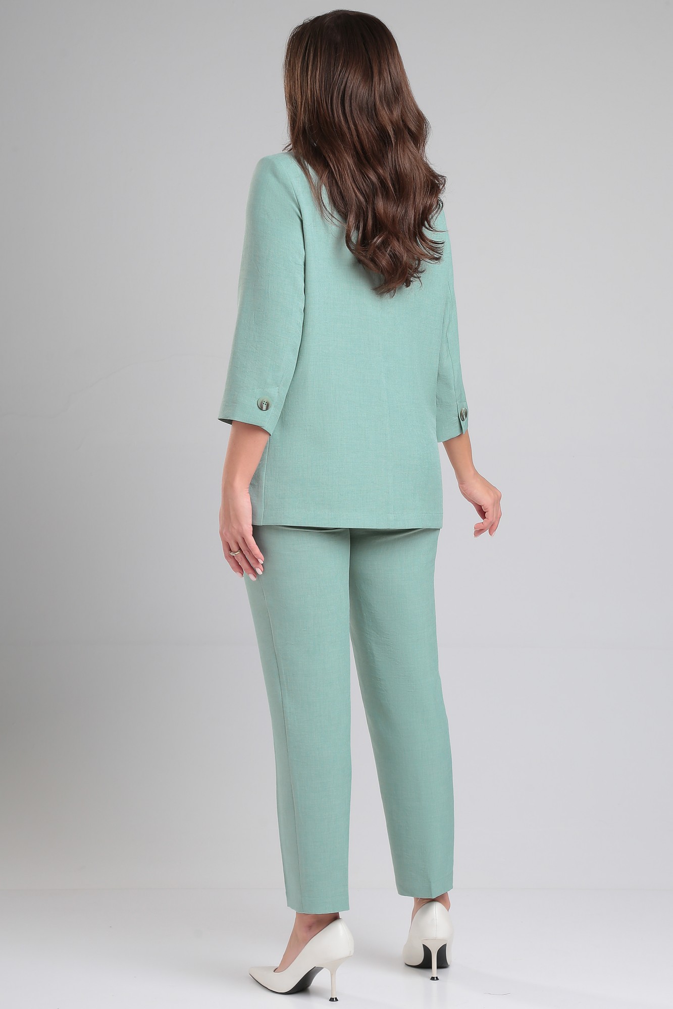 Комплект женский состоящий из жакета и брюк. Жакет прямого силуэта, перед на хлопковой подкладке, средний шов спинки окантован. По переду отрезной бочок, нагрудная вытачка, функциональные карманы в рамку . Спинка со средним швом и рельефами из проймы. Воротник пиджачного типа. Застежка центральная бортовая застегивающаяся на 1 декоративную пуговицу. Рукав втачной, двухшовный, длиной 3/4 по низу короткая шлица с 1 пуговицей. Брюки прямые слегка зауженные к низу, на притачном поясе, без застёжки, по спинке в пояс вставлена резинка. По переду расположены функциональные боковые карманы-хулиганы и заутюжена стрелка.