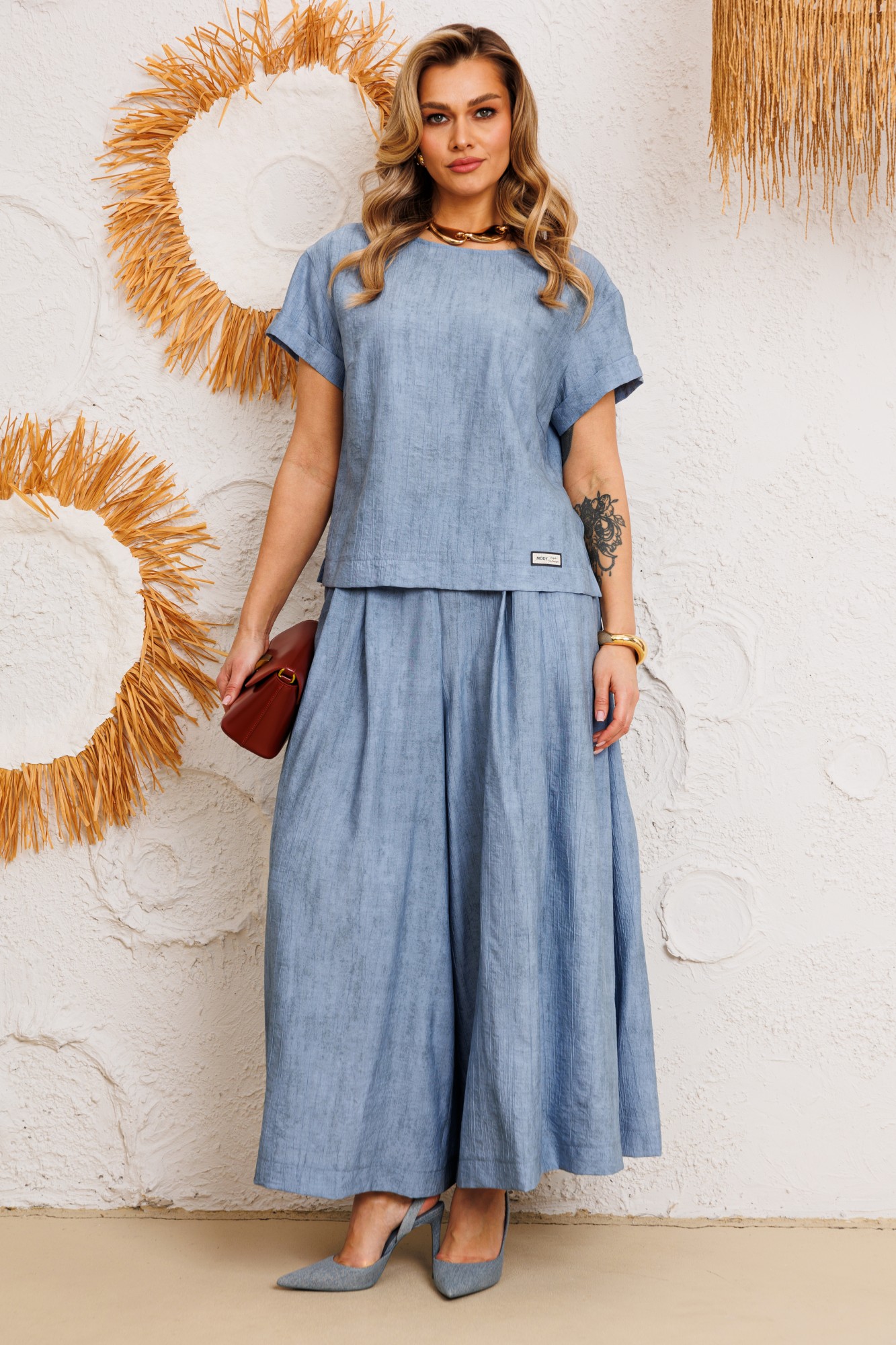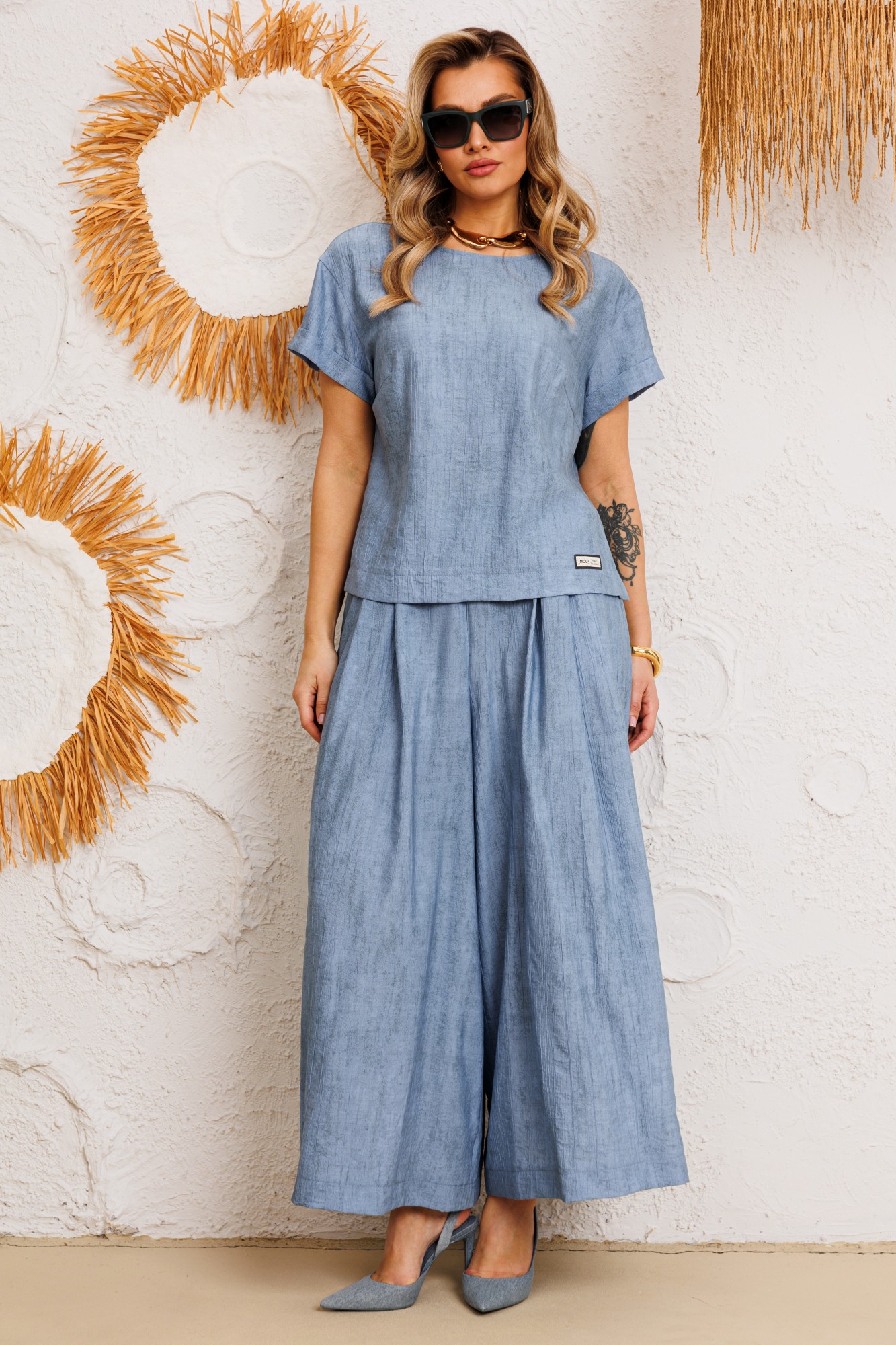 Стильный женский комплект, состоит из блузы и брюк-юбки. Блуза прямого силуэта, выполнена из вискозной ткани с добавлением хлопка с эффектом жатки, что придаёт изделию особый стиль. Блуза с нагрудными выточками, спущенным рукавом с манжетой, по бокам с небольшими разрезами (разрез 9 см). Перед блузки декорирован пришивной дизайнерской нашивкой. Брюки юбка прямые, со складками по переду и спинке, выполнены из вискозной ткани с добавлением хлопка с эффектом жатки. Брюки-юбка на поясе, по бокам с резинкой, по спинке с застежкой на потайную молнию и пуговицу.