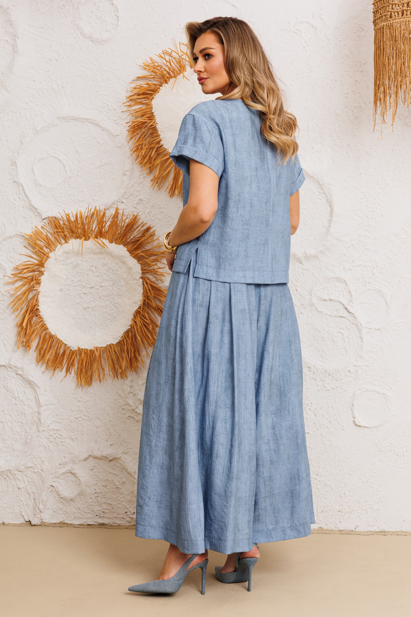 Стильный женский комплект, состоит из блузы и брюк-юбки. Блуза прямого силуэта, выполнена из вискозной ткани с добавлением хлопка с эффектом жатки, что придаёт изделию особый стиль. Блуза с нагрудными выточками, спущенным рукавом с манжетой, по бокам с небольшими разрезами (разрез 9 см). Перед блузки декорирован пришивной дизайнерской нашивкой. Брюки юбка прямые, со складками по переду и спинке, выполнены из вискозной ткани с добавлением хлопка с эффектом жатки. Брюки-юбка на поясе, по бокам с резинкой, по спинке с застежкой на потайную молнию и пуговицу.