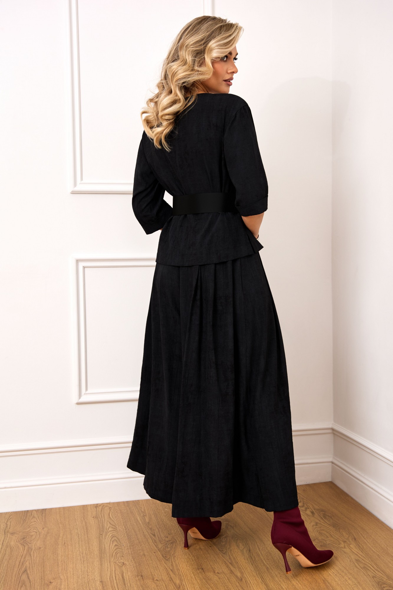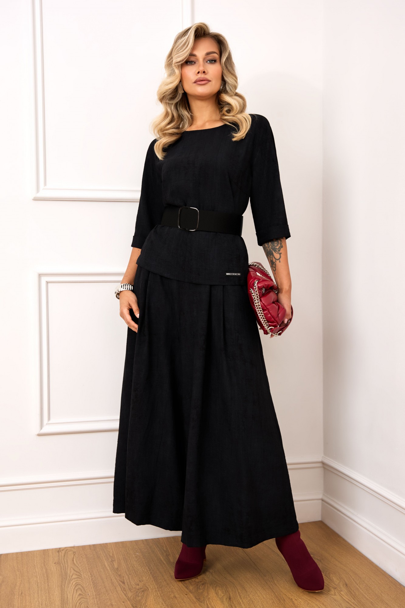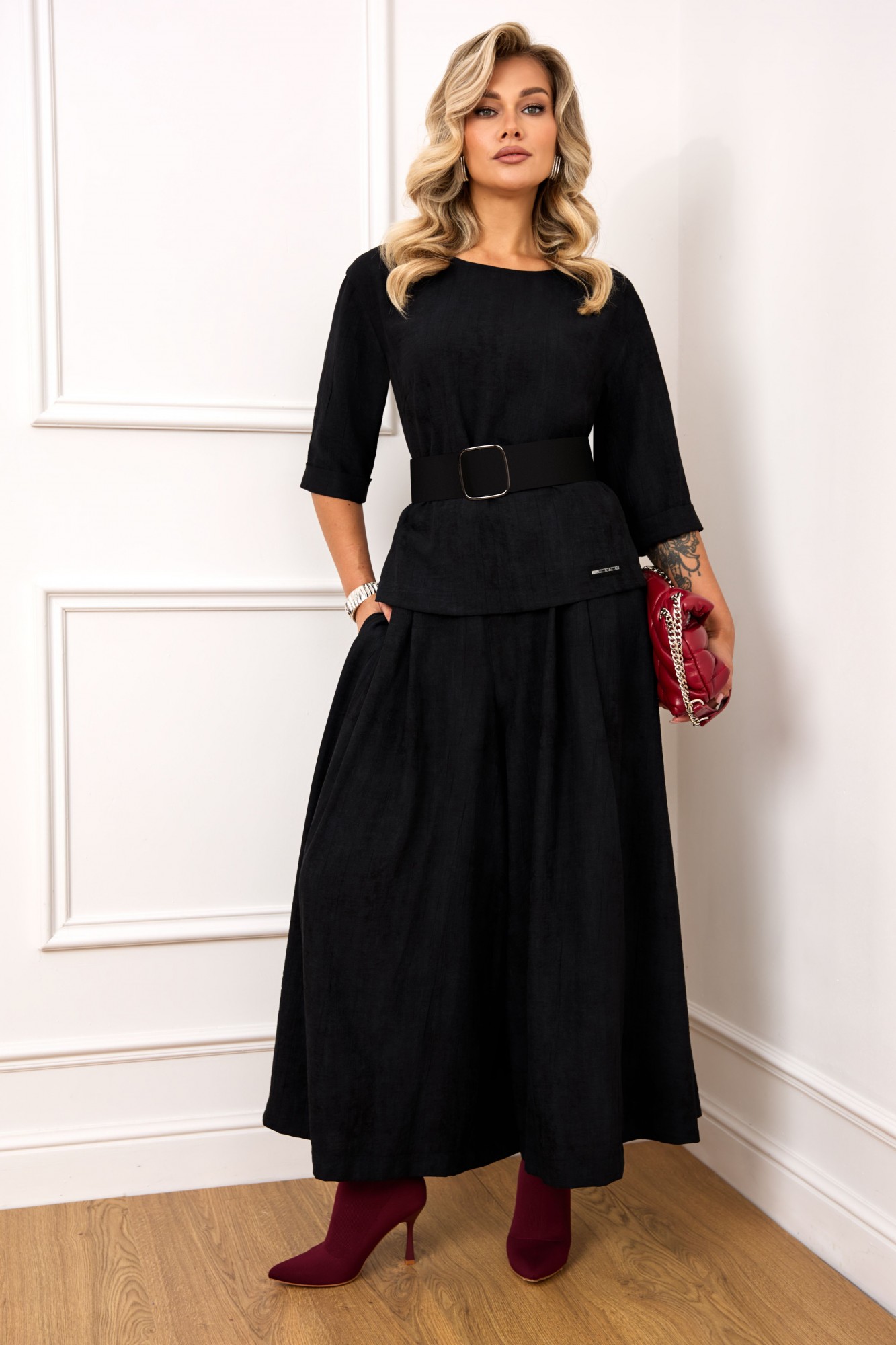 Стильный женский комплект, состоит из блузы и брюк-юбки. Блуза прямого силуэта с эффектом жатки, что придаёт изделию особый стиль. Блуза с нагрудными выточками, рукав длиной ¾, с манжетой, по бокам с небольшими разрезами (разрез 9 см). Перед блузки декорирован пришивной дизайнерской нашивкой. Брюки-юбка прямые, со складками по переду и спинке с эффектом жатки. Брюки-юбка на поясе, по бокам с резинкой, по спинке с застежкой на потайную молнию и пуговицу. В комплекте идет съемный кожаный пояс.