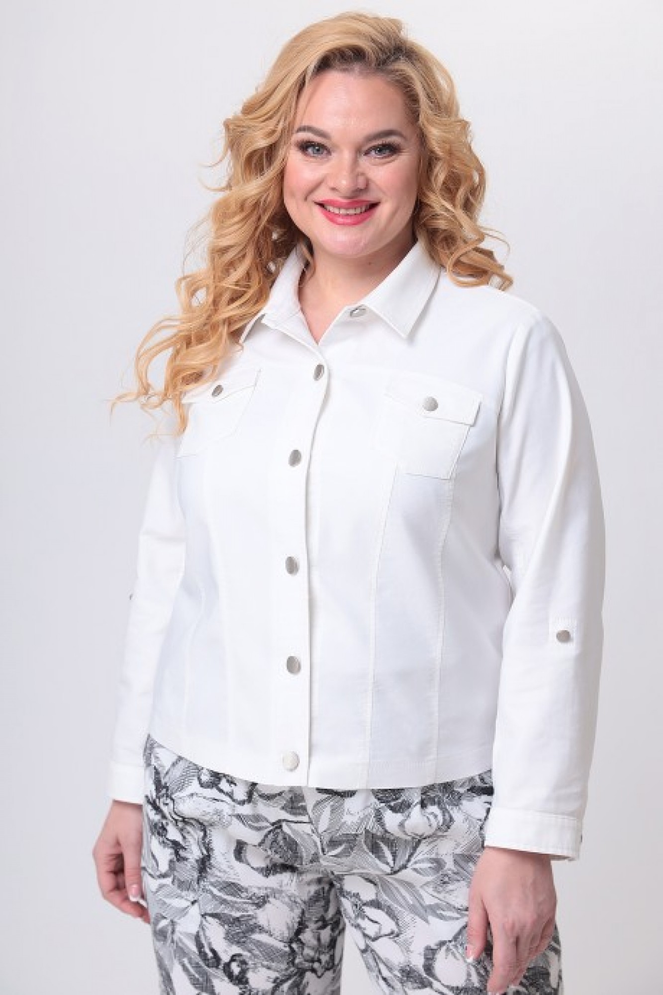 Стильный вариант для красивого женского образа – сочетание белого джинсового жакета с брюками-бананами, из принтованной ткани, и контрастной майкой. Жакет-куртка прямого кроя с рельефными швами и кокетками по переду и спинке, накладные карманы с клапанами и декоративные металлизированные пуговицы - узнаваемые нотки вневременной джинсовой мелодии. В рукавах предусмотрены паты с пуговицей, что позволяет сделать рукава короче. Майка с рукавом «крылышко», горловина углубленная V-образной формы. Брюки-бананы с боковыми карманами, передние половинки со складками, пояс на резинке.