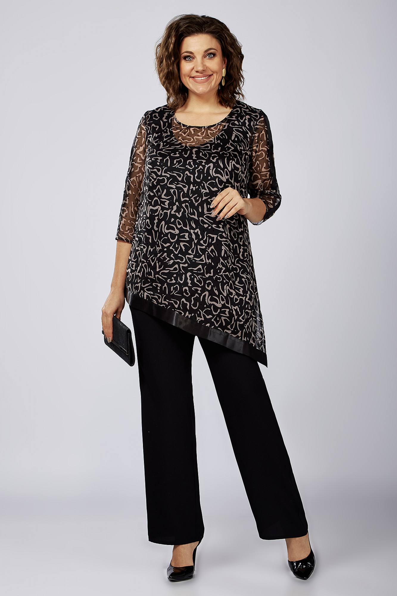 Мягкий, красивый стильный и очень комфортный женский костюм большого размера, состоящий из блузы и брюк прямого силуэта. Брюки выполнены из костюмно-плательной ткани, пояс на резинке. Блуза выполнена из шифона на трикотажной подкладке. Блуза сложного геометрического кроя с удлиненным боковым швом и разрезом. Низ изделия обработан отделочной тканью. Рукава длиной чуть ниже локтя. Необычное дизайнерское решение на стыке безупречной женственности и стиля с динамикой и новаторством подчеркнет изысканный вкус обладательницы, не лишив комфорта и функциональности. Подойдет как офисная одежда, вечерний наряд, а также как праздничный или для вечернего выхода. В больших размерах легкий оверсайз.