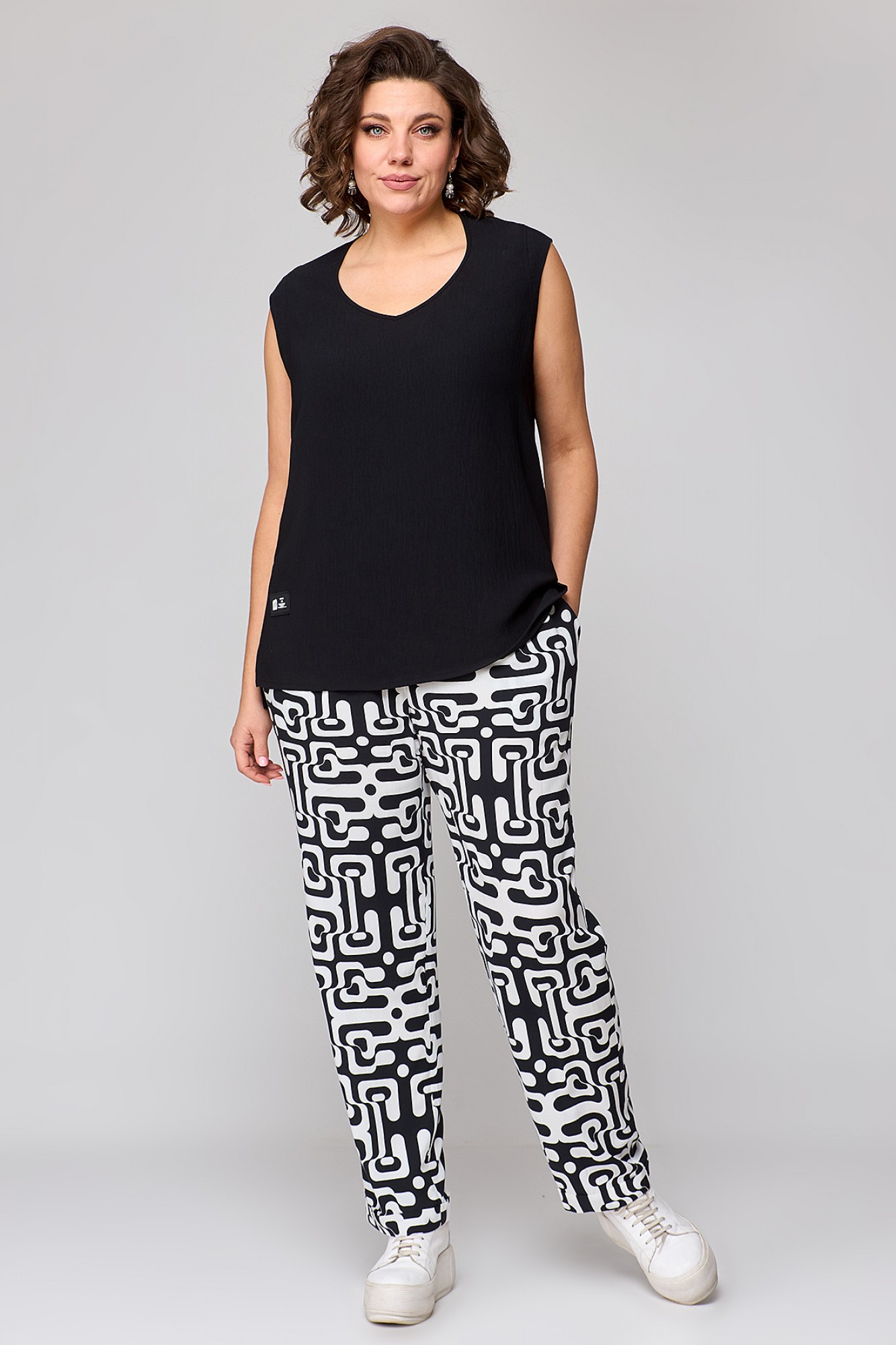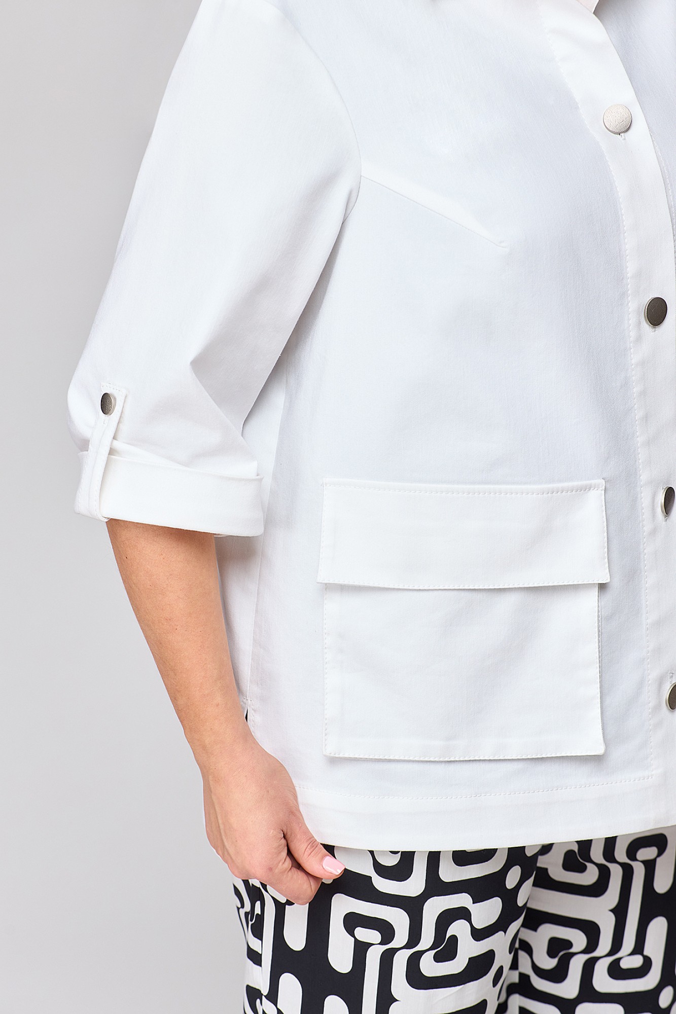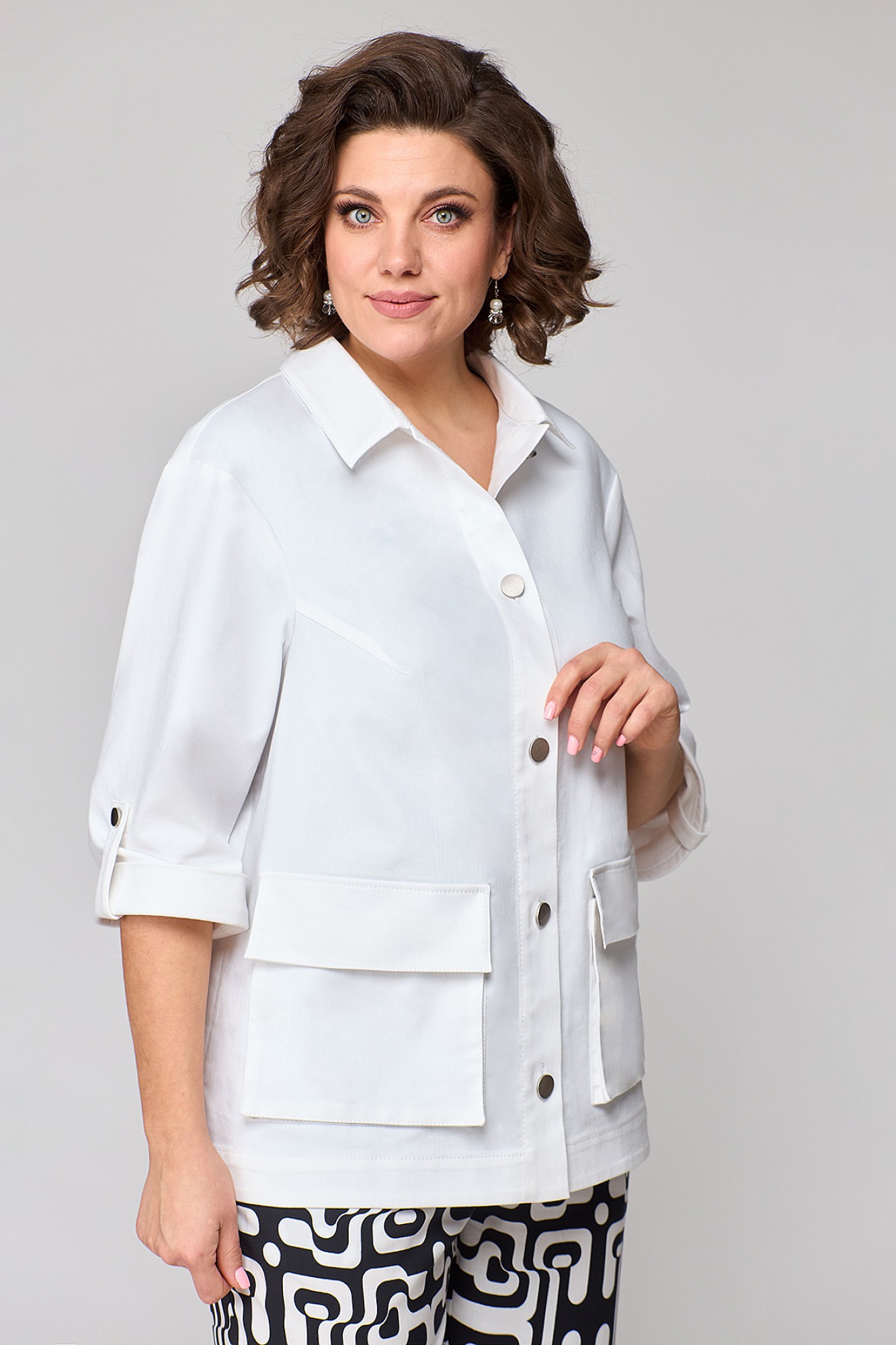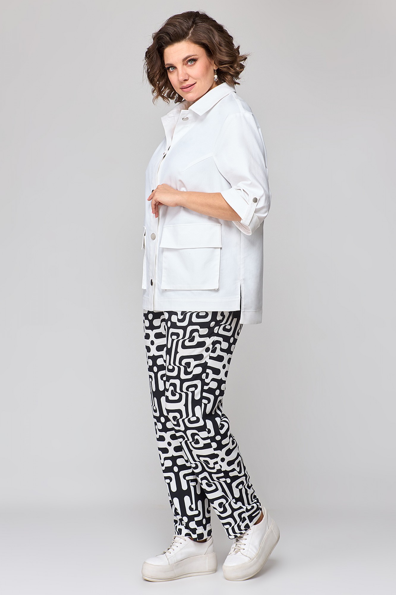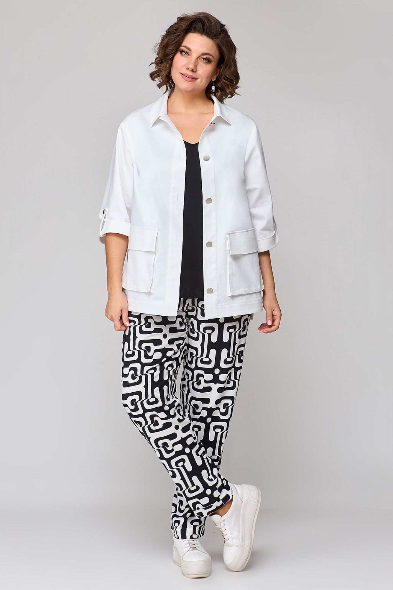 Стильный, современный, трендовый комплект с брюками для повседневной носки, торжественного мероприятия, в офис, школу или на прогулку. Приобретая один комплект, Вы покупаете несколько образов, каждая единица которого универсальна, поэтому может сочетаться со многими вещами из Вашего гардероба. Стильный вариант для красивого женского образа – сочетание белого джинсового жакета с брюками бананами из принтованной ткани и контрастной майкой. Жакет-куртка прямого кроя с рельефными швами и кокетками по переду и спинке, накладные карманы с клапанами и декоративные металлизированные пуговицы - узнаваемые нотки вневременной джинсовой мелодии. В рукавах предусмотрены паты с пуговицей, что позволяет сделать рукава короче. Жакет просто необходим при создании как романтического, так и спортивного образа. Майка с рукавом «крылышко», горловина углубленная V-образной формы. Брюки бананы с боковыми карманами и поясом частично на резинке. Не упустите возможность приобрести брючный комплект с большим выбором размеров и ощутить комфорт в носке качественной и стильной одежды!