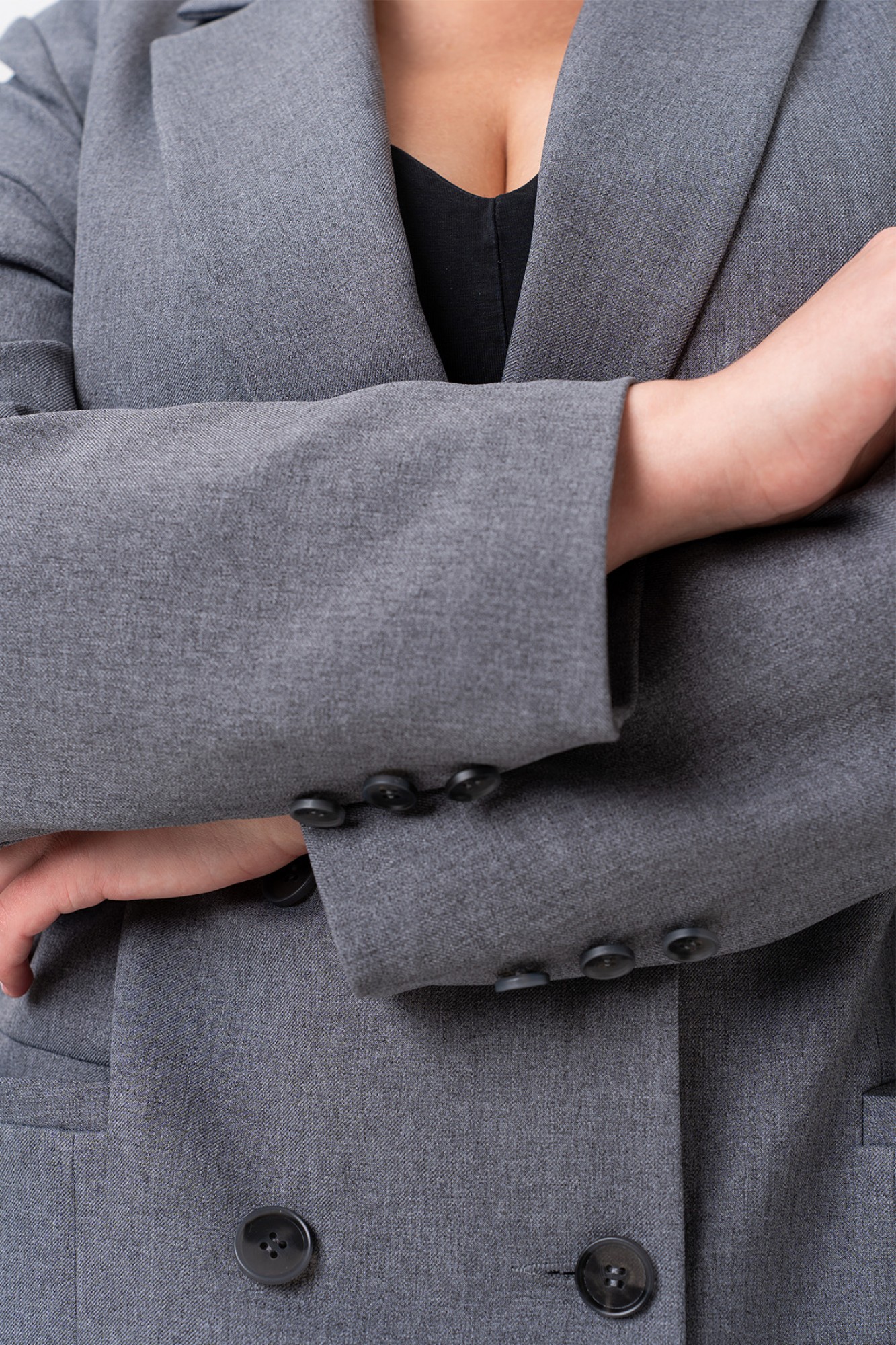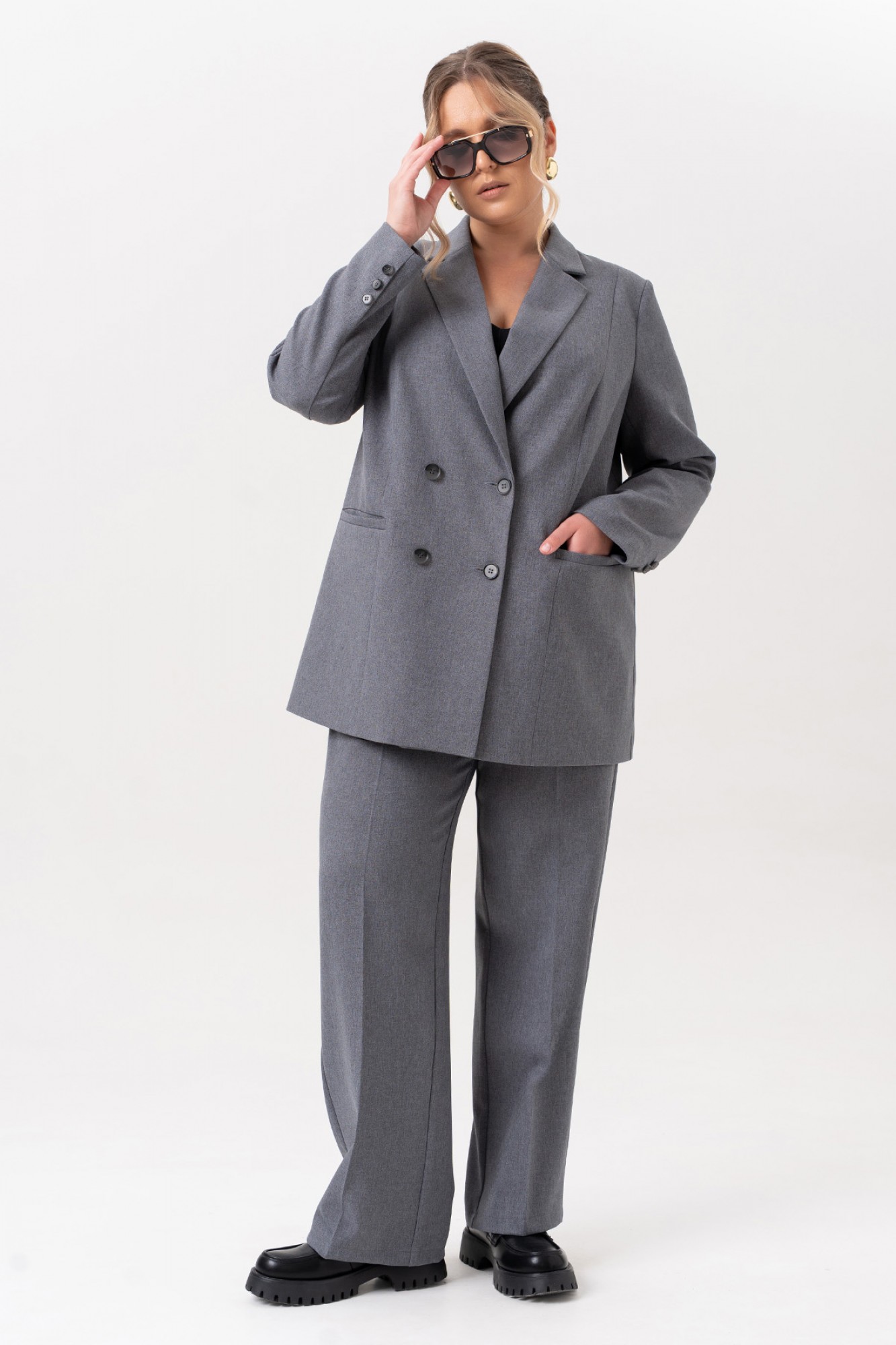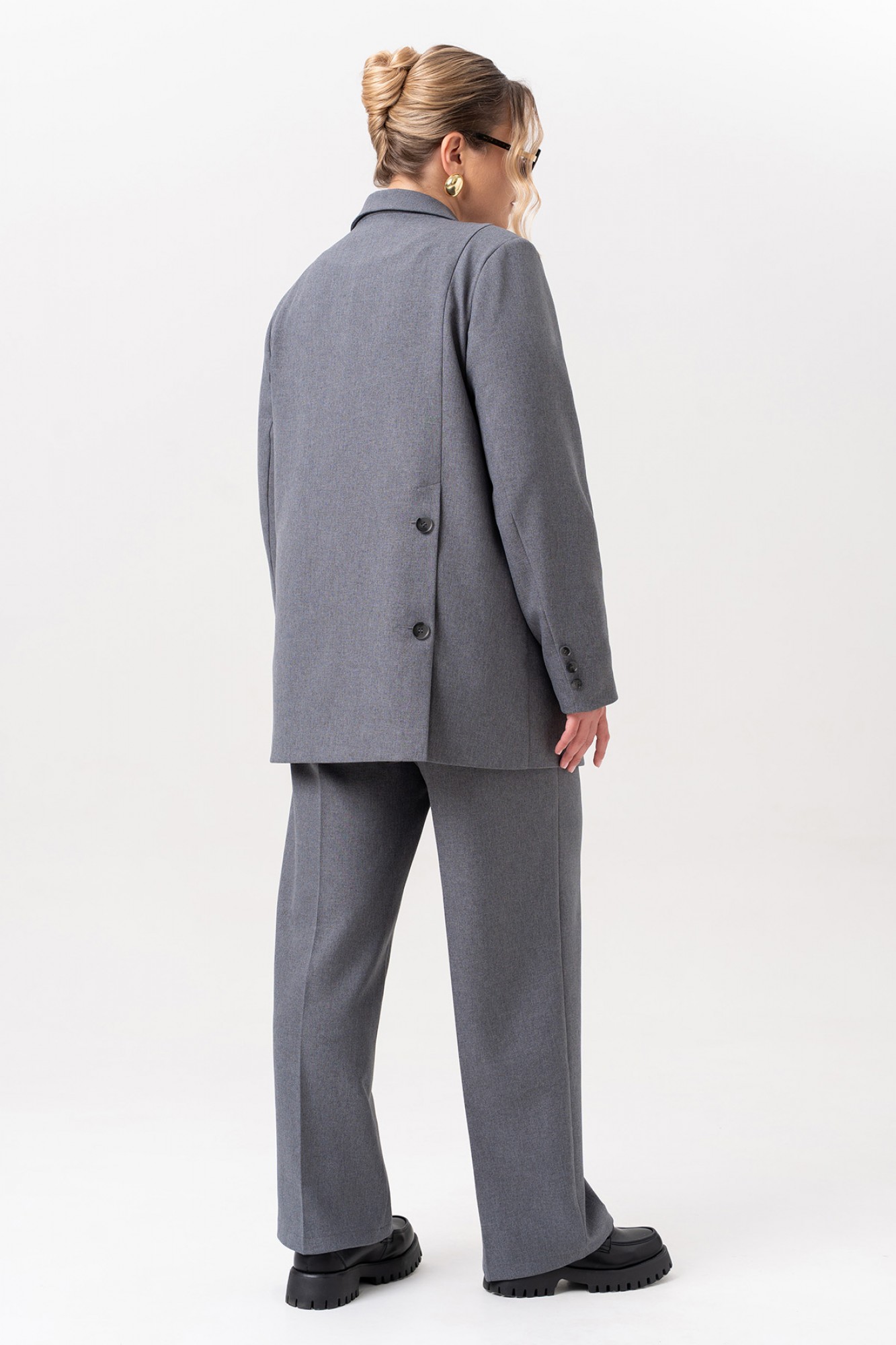 Элегантный женский костюм, в котором классика встречается с современными акцентами. Жакет выполнен в двубортном исполнении с выразительным пиджачным воротником, подчеркивающим строгость и стиль. Рельефы на полочках от плечевого шва придают силуэту структурность, а прорезные карманы в листочку добавляют практичности и утонченности. Особое внимание привлекает спинка: асимметричный рельеф на правой части, переходящий в шлицу, оформленную декоративными пуговицами — неожиданный и эффектный штрих. Втачные двухшовные рукава завершены аккуратными шлицами с тремя пуговицами, что добавляет костюму благородства и внимания к деталям. Брюки — лаконичные, с функциональными карманами и гульфиком на молнии. Удобный пояс с эластичной тесьмой по бокам делает посадку комфортной, не нарушая внешней строгости образа. Этот костюм — идеальное сочетание женственности, силы и комфорта. Он подойдет как для деловой встречи, так и для повседневного выхода, где важна уверенность и стиль.