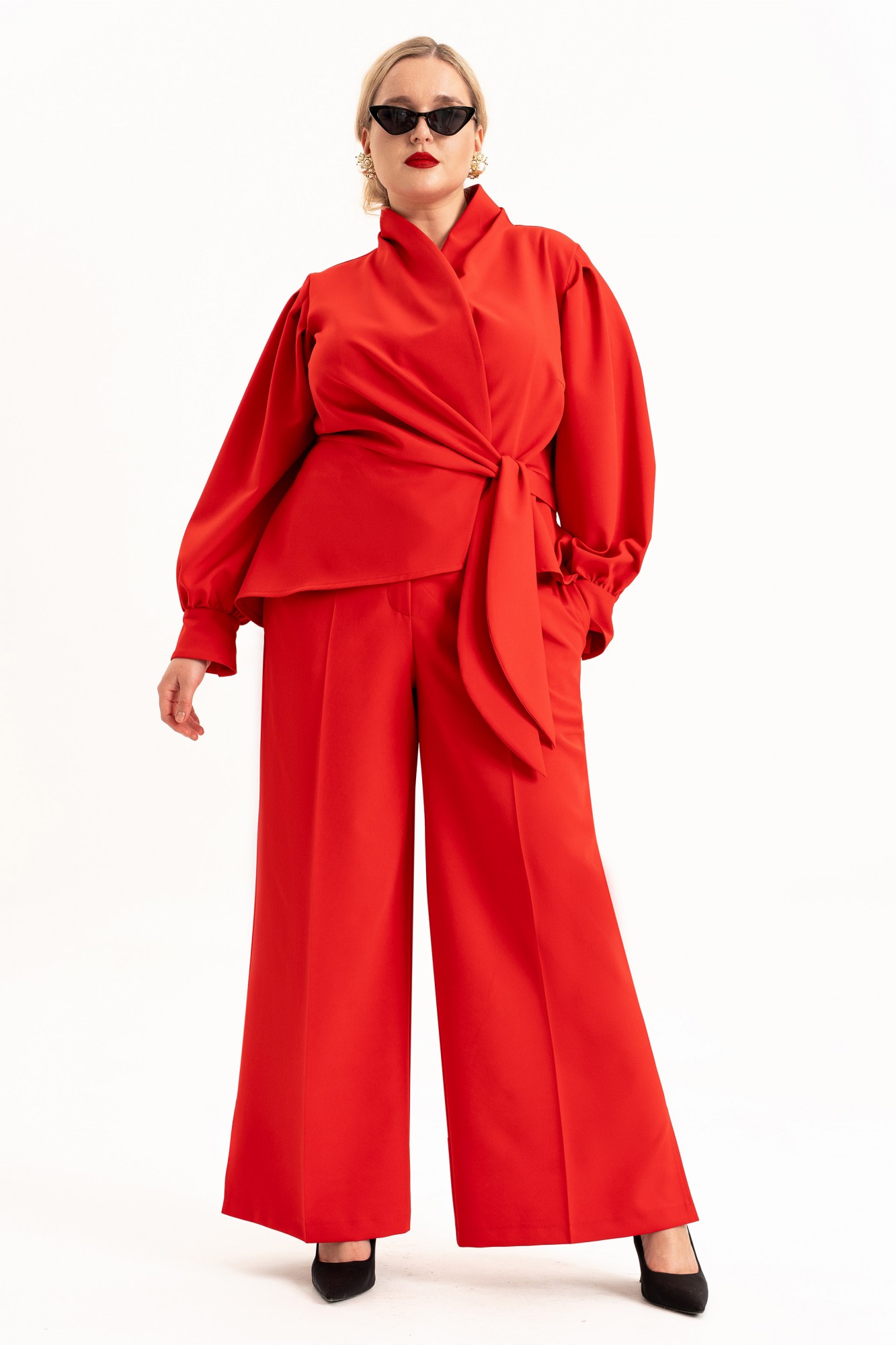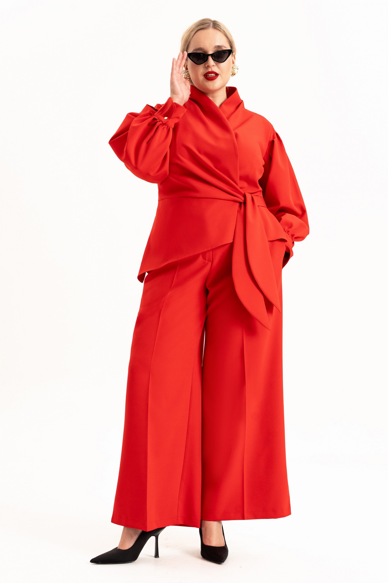 Элегантный женский костюм из ткани «марчано» стильный и универсальный наряд для различных мероприятий. Модель двойка сочетает в себе современные тенденции 2025-26 года с классическими акцентами. Подходит как для офиса, так и для особых случаев ( новый год, корпоративы, свадьбы или дни рождения) обеспечивая комфорт и уверенность в себе. Брюки с широкими штанинами палаццо выгодно подчеркивают женственные формы, а свободный крой обеспечивает удобство в любой ситуации. Этот костюм больших размеров идеально подойдет для прохладного времени года благодаря легкому материалу и возможности сохранить тепло. Текстура ткани добавляет изысканности и роскоши, делая образ особенно привлекательным на особых событиях. Благодаря универсальному дизайну, костюм можно успешно сочетать с различными элементами гардероба, создавая разнообразные стили от официального до повседневного. На брюках обработаны карманы в боковых швах, по талии пояс с застежкой на молнию и частично на резинке. Жакет с отрезной баской и воротником стойкой переходящей в борта. Застежка на потайную петлю и пуговицу и на завязки. Рукав длинный, втачной на манжете. По окату рукава обработаны складки. Доступен в различных размерах, в том числе и для женщин пышных форм, этот костюм позволит каждой леди подобрать идеальный вариант. Красный цвет костюма подчеркнут вашу индивидуальность и хороший вкус. Независимо от того, выберите ли вы его для офиса или вечера, этот костюм станет верным спутником в создании вашего стильного образа.