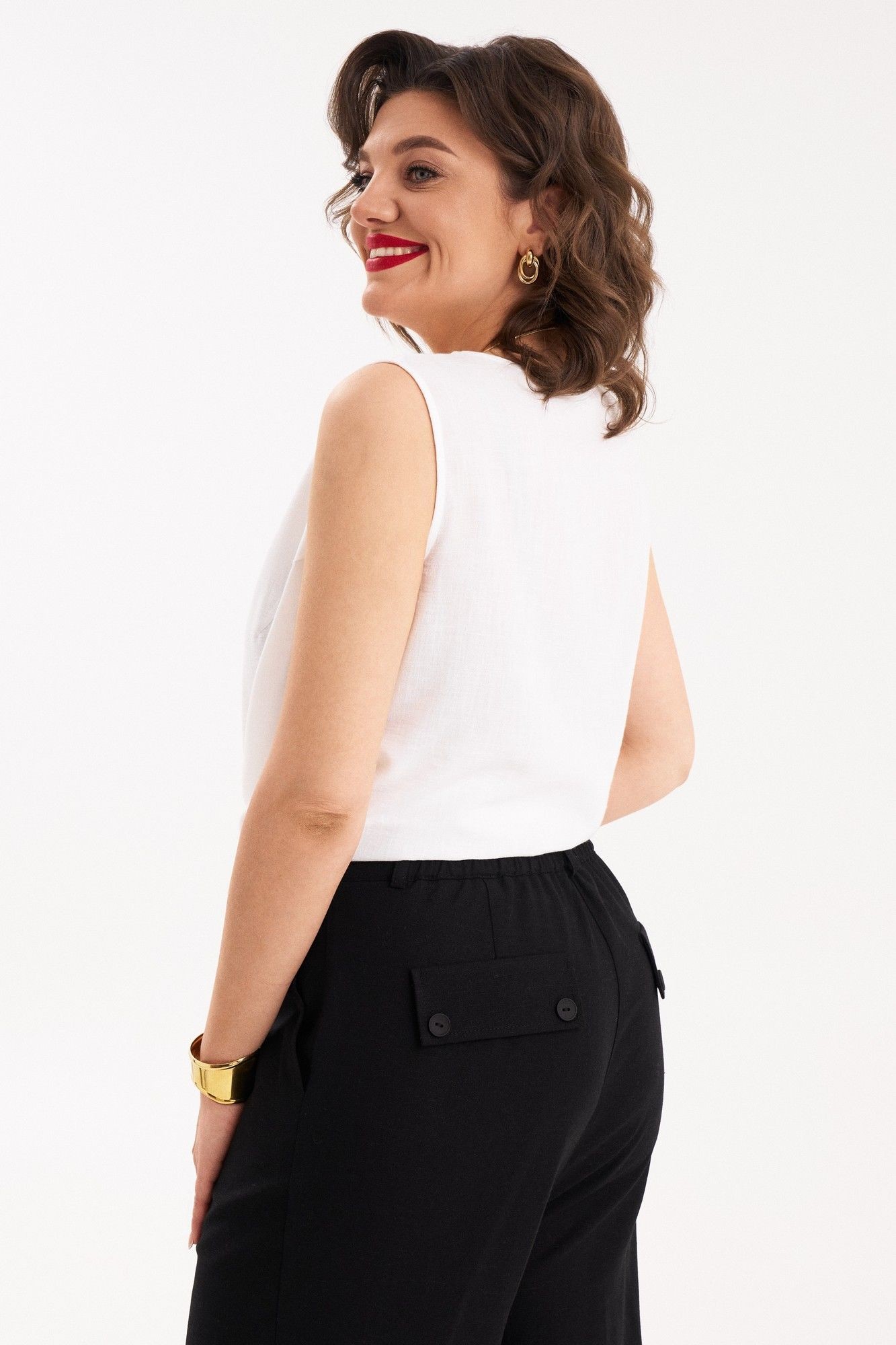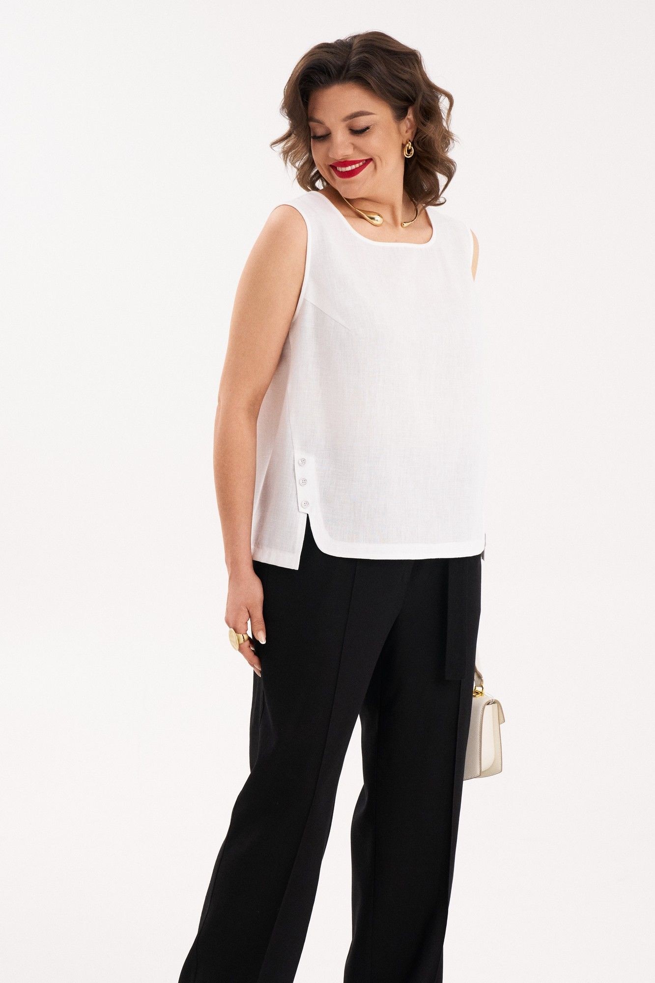 Стильный, легкий комплект состоит из брюк и топа. В комплекте топ - блузка без рукавов с интересным фигурным низом, разной длиной переда и спинке. Стильные, удобные брюки станут идеальным базовым предметом вашего гардероба. Брюки прямые, широкие. По переду защипы, на застежке, в боковых швах внутренние карманы. На задних половинках брюк декоративные клапаны. По линии талии притачной пояс со шлевками и резинкой сзади. По переду оригинальная застежка на пояс полукольцами. Брюки отлично смотрятся на любом типе фигуры и удачно сочетаются как с рубашкой, блузой так и с жакетом. Каждую вещь комплекта можно носить, как самостоятельную.