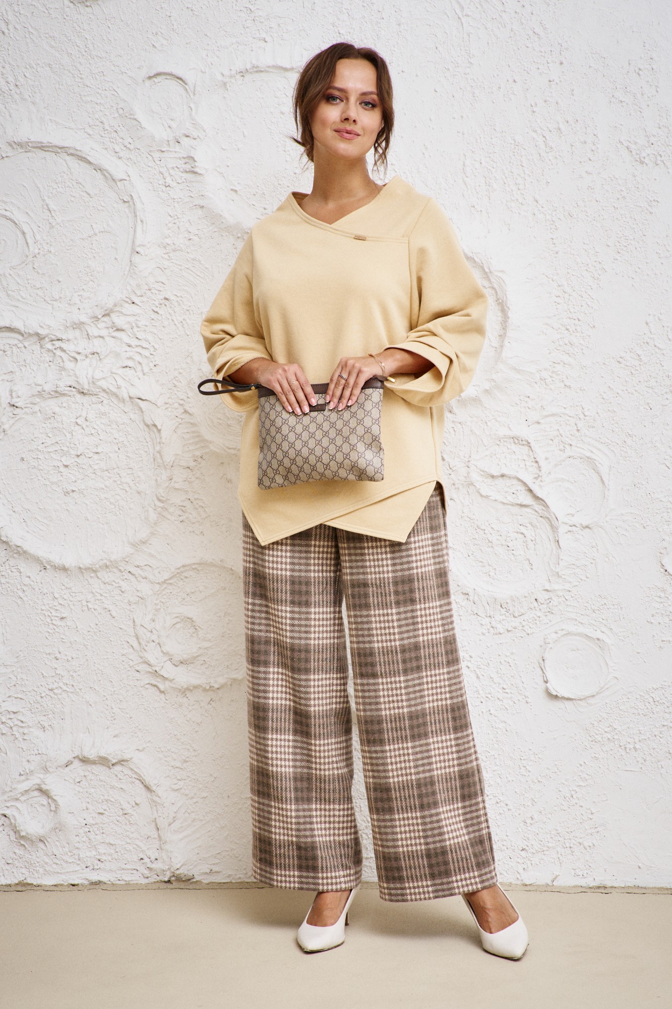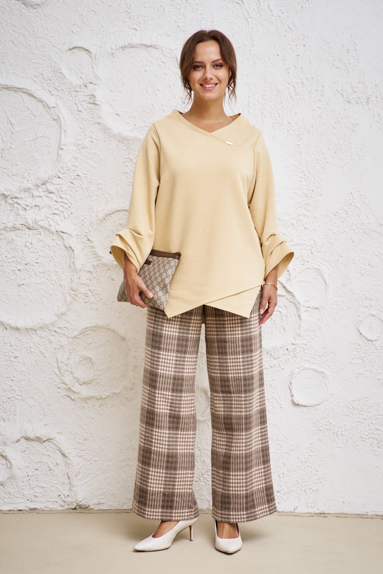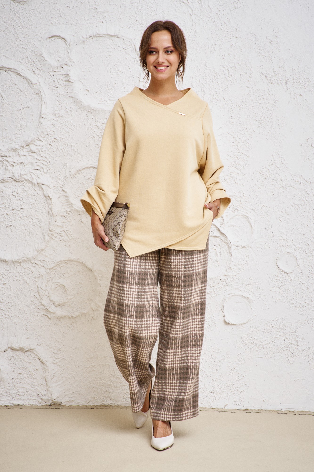 Бренд белорусской женской одежды больших размеров Anastasia представляет комплект двойку. Комплект женский 2-х предметный (блузка, брюки) станет отличным дополнением к Вашему гардеробу. Подойдет как для повседневной носки (работа, офис, прогулки), так и для праздничных выходов. Достаточно дополнить его соответствующими аксессуарами. Предметы комплекта легко будут сочетаться с вещами из Вашего гардероба. Блузка женская из трикотажного полотна футер. Модель прямого силуэта, рукав углублённый, рубашечного типа. Перед идет с запахом, низ блузы асимметричный, по полочке углы, спинка закруглённая, удлинённая. По рукаву идут защипы. В качестве декора-логотип фирмы на горловине. Брюки из текстильной ткани в клетку, прямые. Пояс на резинке, по бокам карманы. Благодаря своему крою и фасону костюм подчеркивает женственные формы и скрывает то, что должно быть незаметным. Это повседневный вариант на каждый день для занятий в школе или для офиса, на работу или на прогулку. Наденьте его на деловую встречу, официальное мероприятие, школьное торжество. Модель подойдёт для образа в университет или колледж, на любое праздничное мероприятие. Если Вы ищете наряд для корпоратива, вечеринки, свадьбы, на последний звонок или выпускной вечер – это идеальный вариант. Этот предмет одежды подчеркнет вашу элегантность и сделает образ более женственным. Одежда для женщин больших размеров и не только, по отличным ценам и высокого качества - это Anastasia! Добавляете нас в любимые бренды и вы всегда будете в курсе всех акций и новинок! Новинка осень 2024! Хороших покупок от «Анастасия».