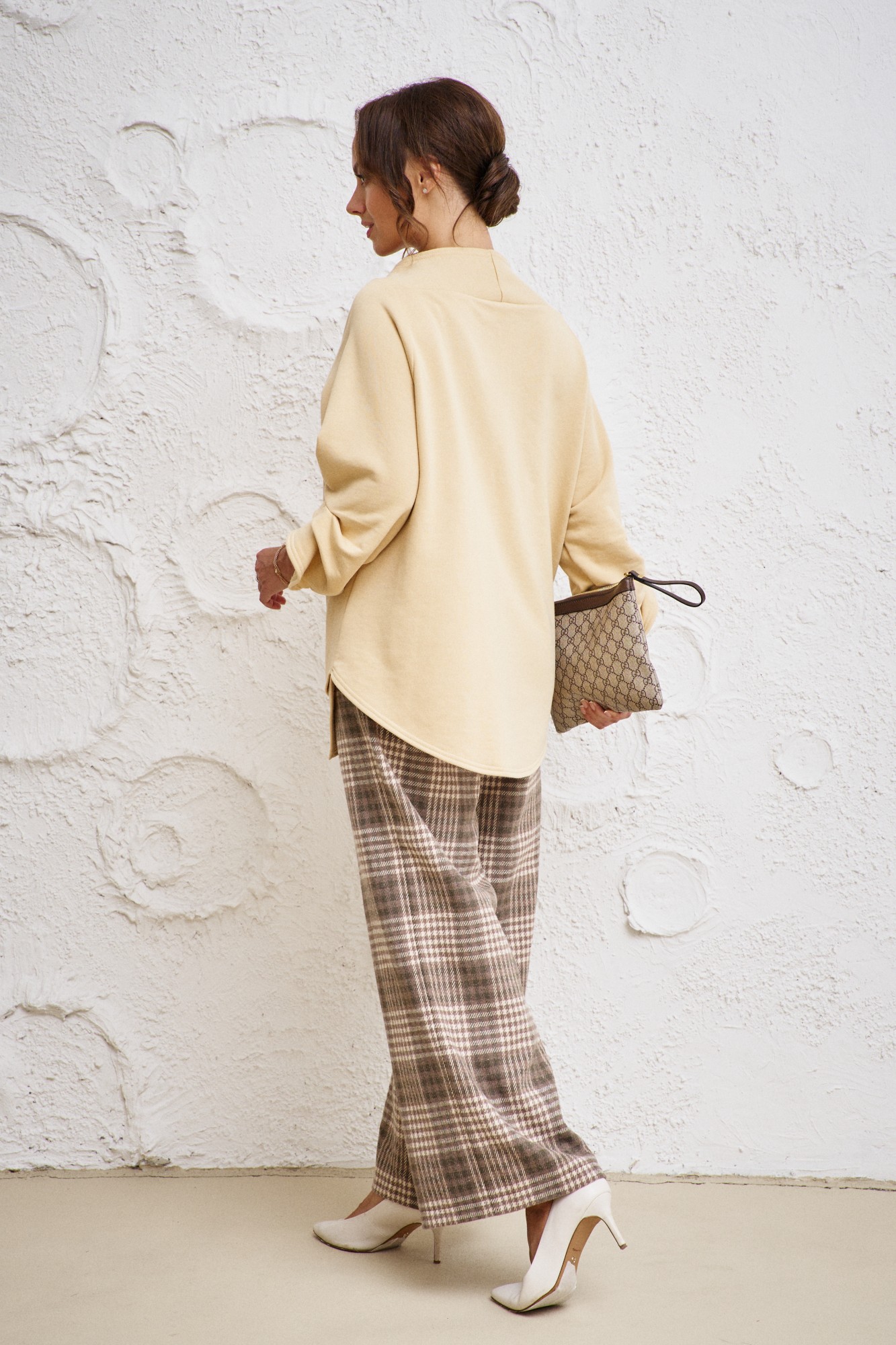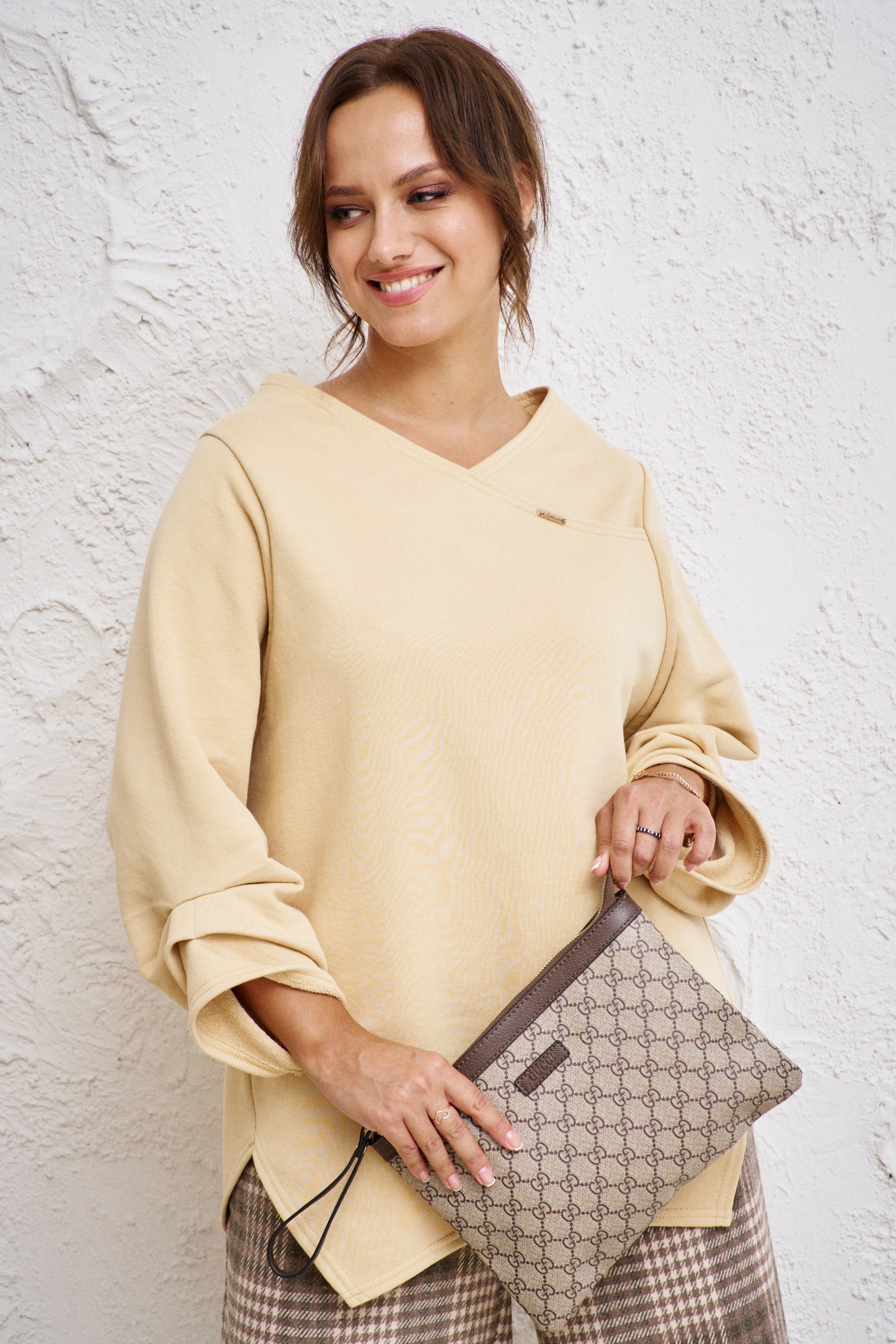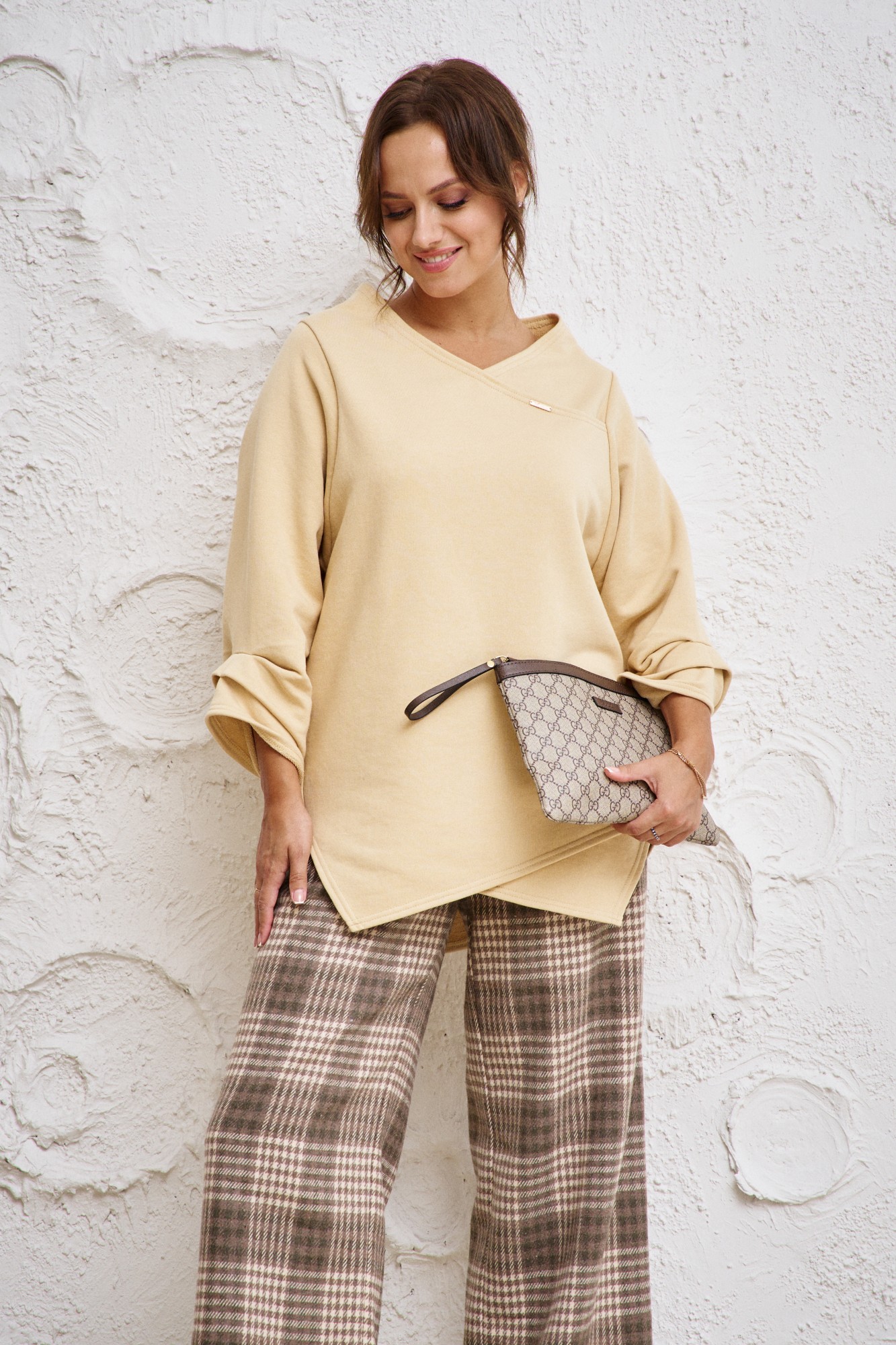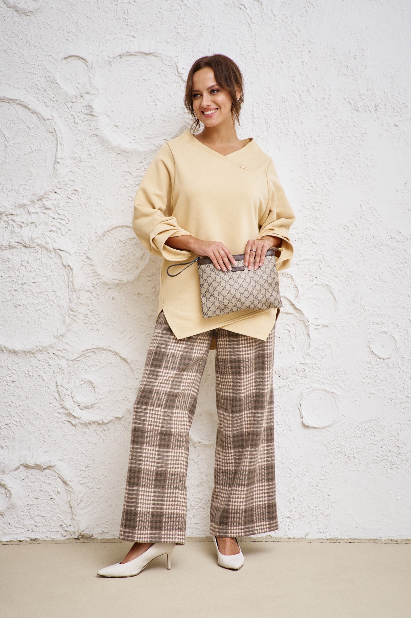 Бренд белорусской женской одежды больших размеров Anastasia представляет комплект двойку. Комплект женский 2-х предметный (блузка, брюки) станет отличным дополнением к Вашему гардеробу. Подойдет как для повседневной носки (работа, офис, прогулки), так и для праздничных выходов. Достаточно дополнить его соответствующими аксессуарами. Предметы комплекта легко будут сочетаться с вещами из Вашего гардероба. Блузка женская из трикотажного полотна футер. Модель прямого силуэта, рукав углублённый, рубашечного типа. Перед идет с запахом, низ блузы асимметричный, по полочке углы, спинка закруглённая, удлинённая. По рукаву идут защипы. В качестве декора-логотип фирмы на горловине. Брюки из текстильной ткани в клетку, прямые. Пояс на резинке, по бокам карманы. Благодаря своему крою и фасону костюм подчеркивает женственные формы и скрывает то, что должно быть незаметным. Это повседневный вариант на каждый день для занятий в школе или для офиса, на работу или на прогулку. Наденьте его на деловую встречу, официальное мероприятие, школьное торжество. Модель подойдёт для образа в университет или колледж, на любое праздничное мероприятие. Если Вы ищете наряд для корпоратива, вечеринки, свадьбы, на последний звонок или выпускной вечер – это идеальный вариант. Этот предмет одежды подчеркнет вашу элегантность и сделает образ более женственным. Одежда для женщин больших размеров и не только, по отличным ценам и высокого качества - это Anastasia! Добавляете нас в любимые бренды и вы всегда будете в курсе всех акций и новинок! Новинка осень 2024! Хороших покупок от «Анастасия».