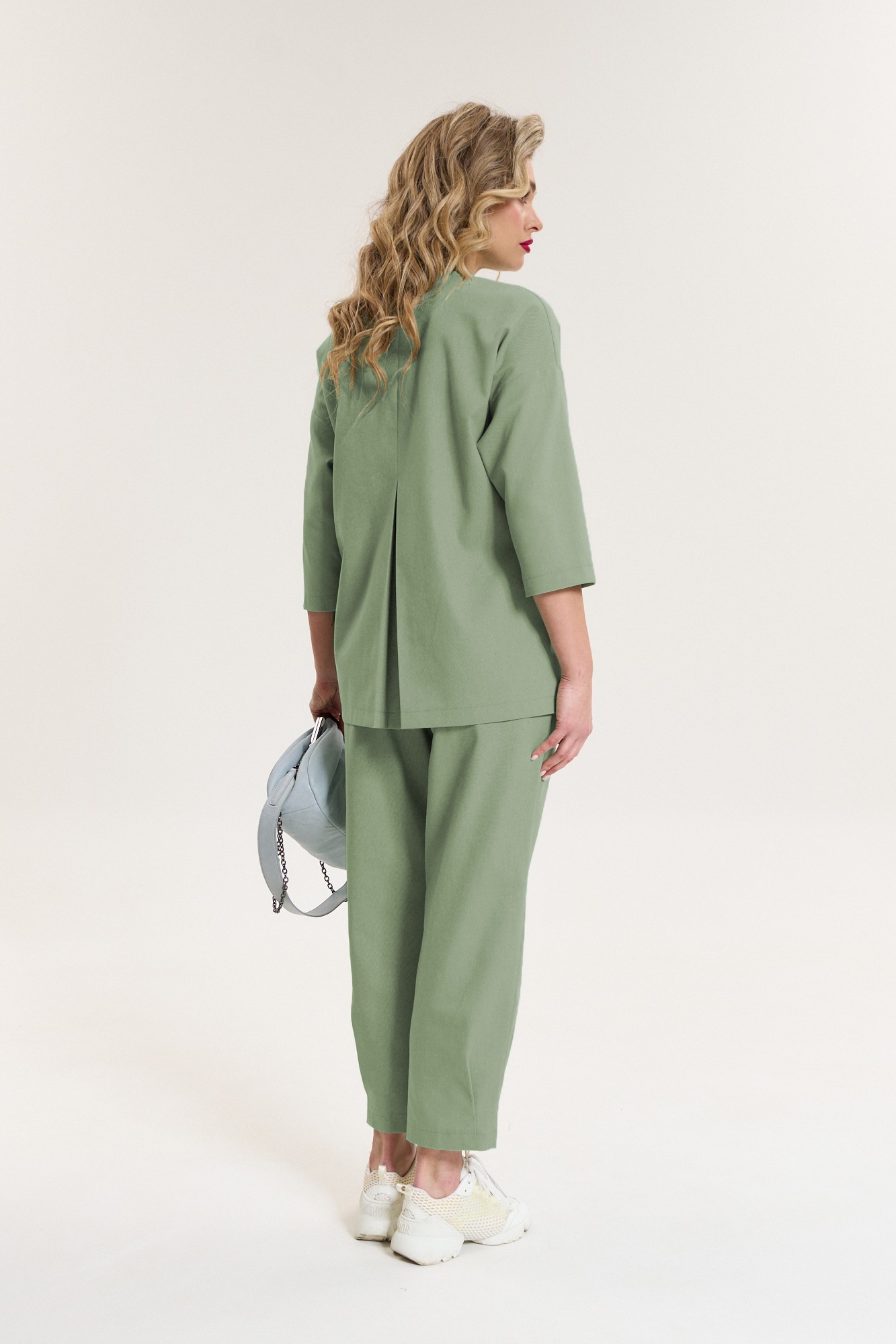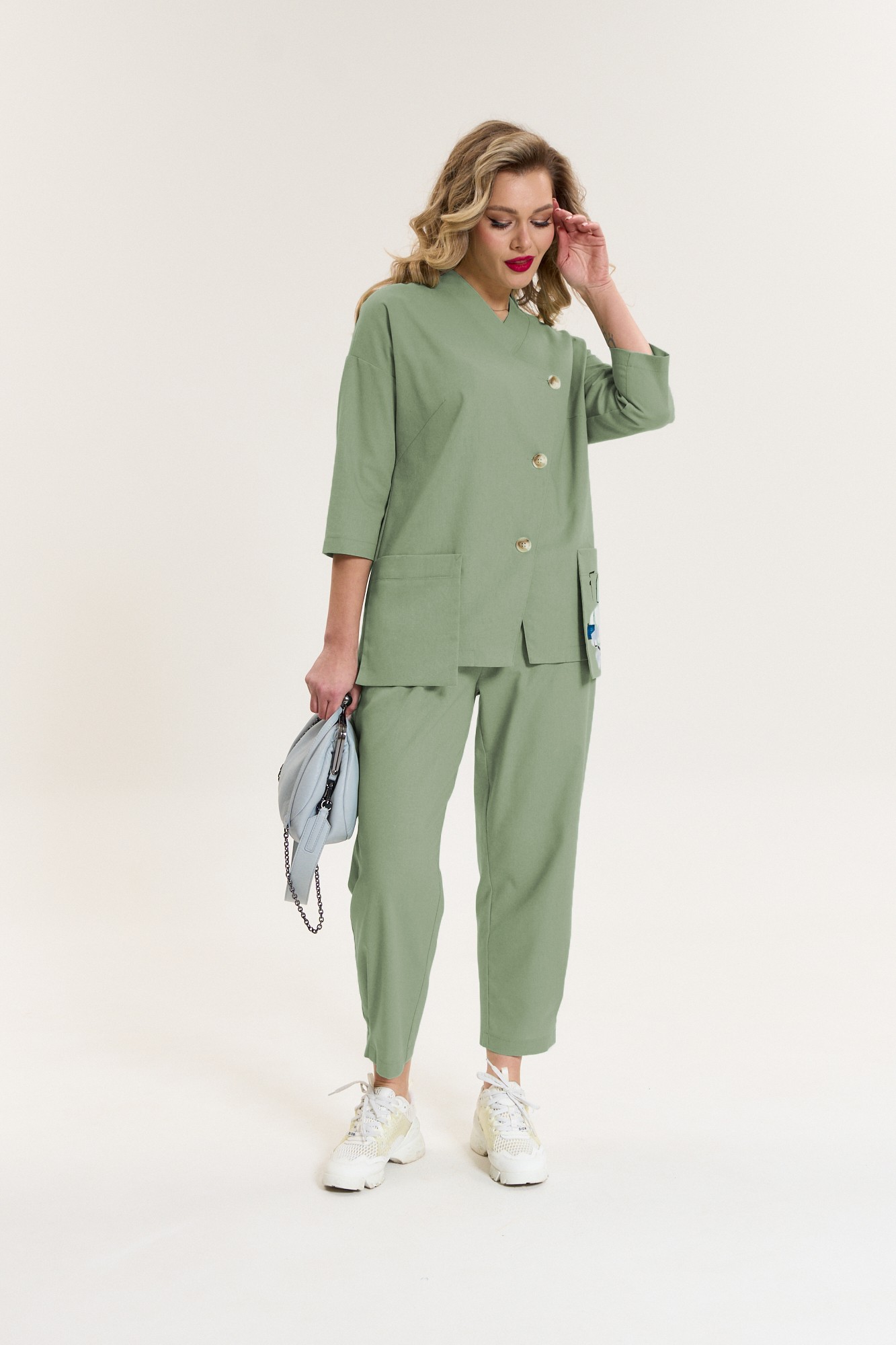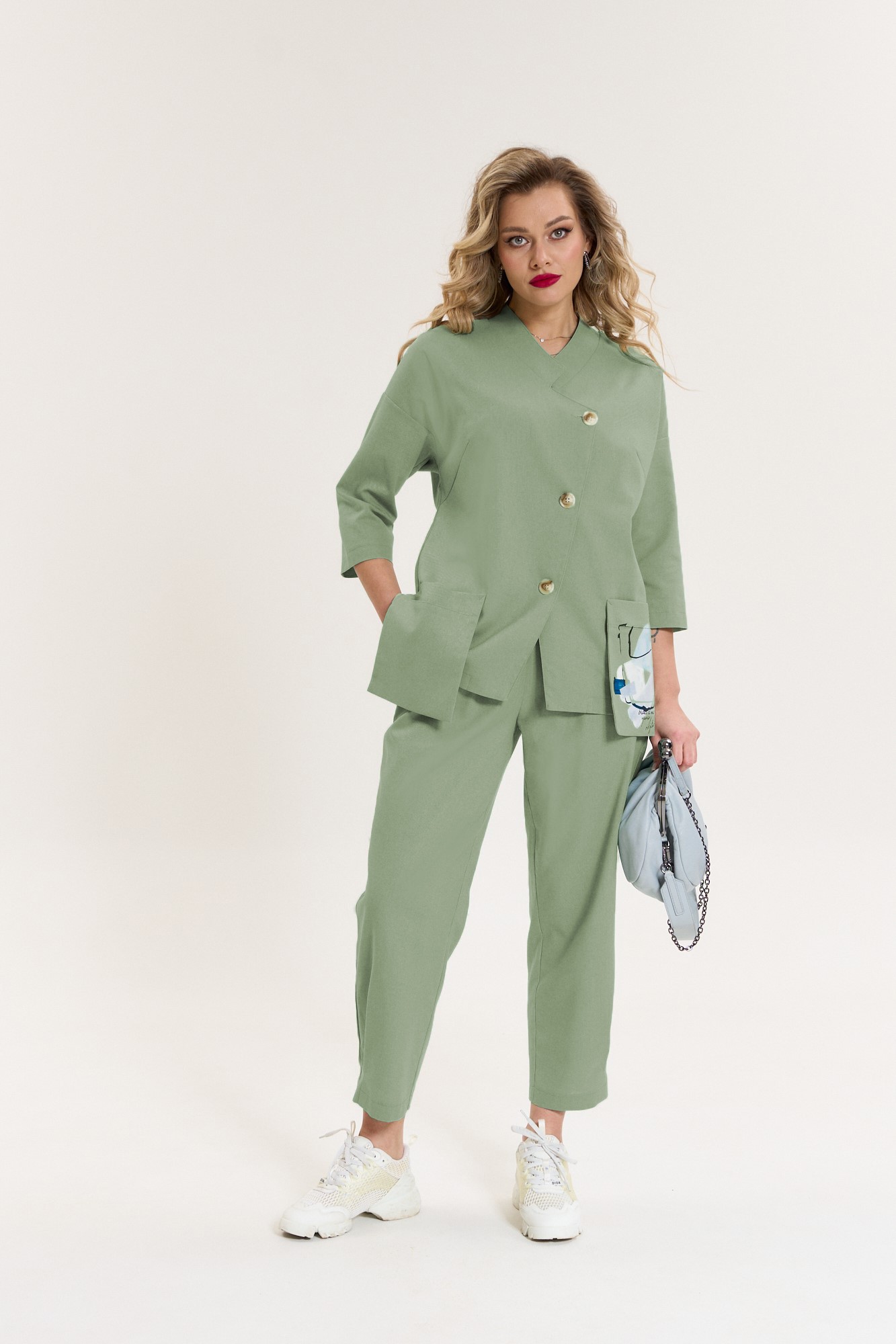 Женский брючный костюм — это идеальное сочетание стиля, комфорта и универсальности, которое станет вашим верным спутником как на деловых встречах, так и при повседневной носке. Изготовленный из высококачественной ткани, этот костюм обеспечивает легкость и приятные ощущения при носке. Костюм женский 2-хпредметный (жакет и брюки). Жакет из текстильной ткани прямого силуэта со спущенным плечом. По полочке идут грудовые выточки из бокового шва. Застежка ассиметричная. Воротник стойка. По спинке встречная складка. Рукав 3/4. По полочке идут отлетные накладные карманы с декором (термонаклейка). Брюки прямые, зауженные к низу за счет защипов. Пояс на резинке, по бокам карманы.