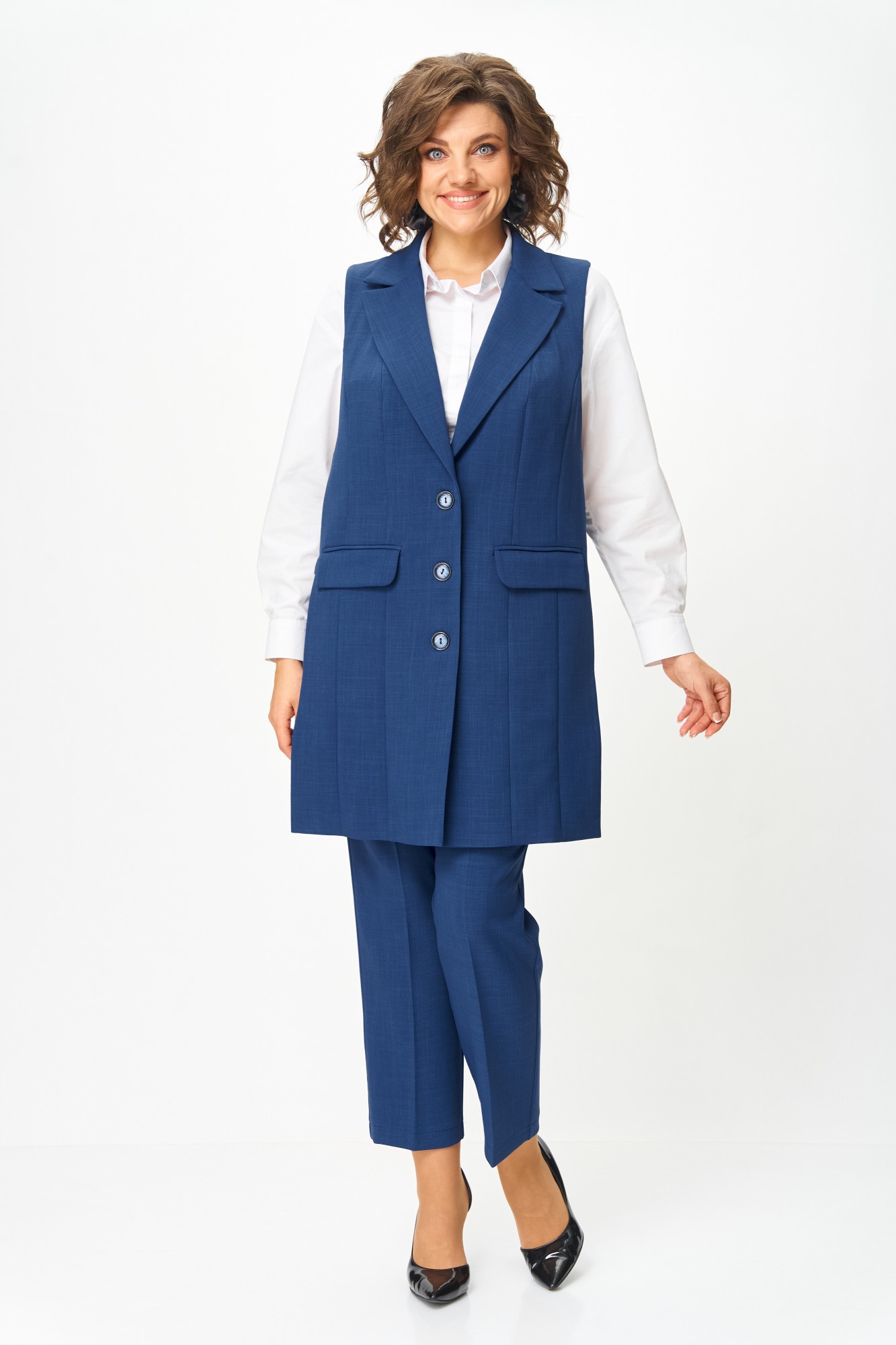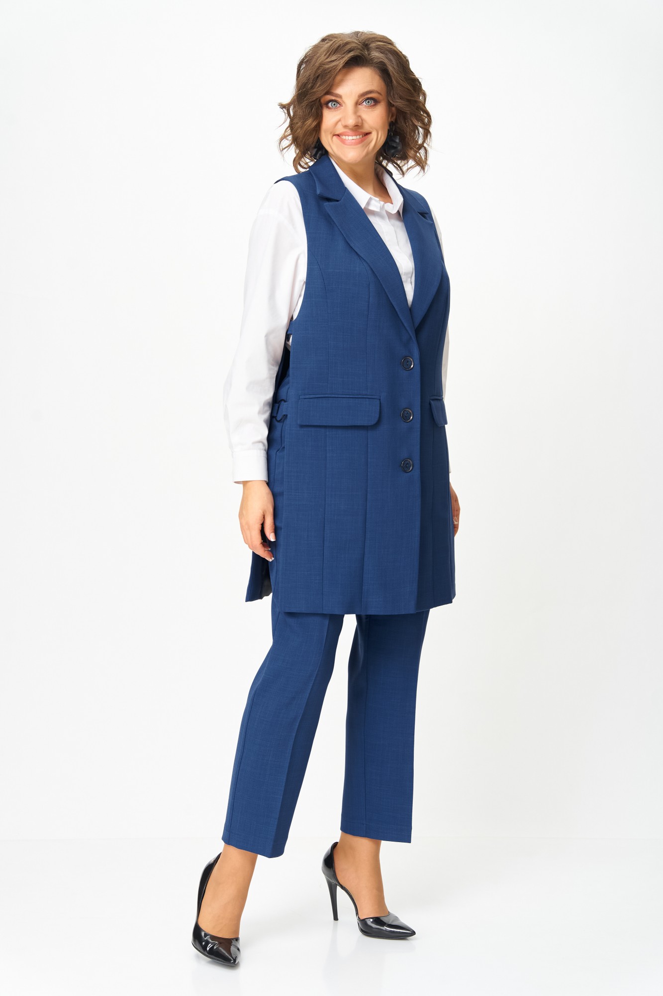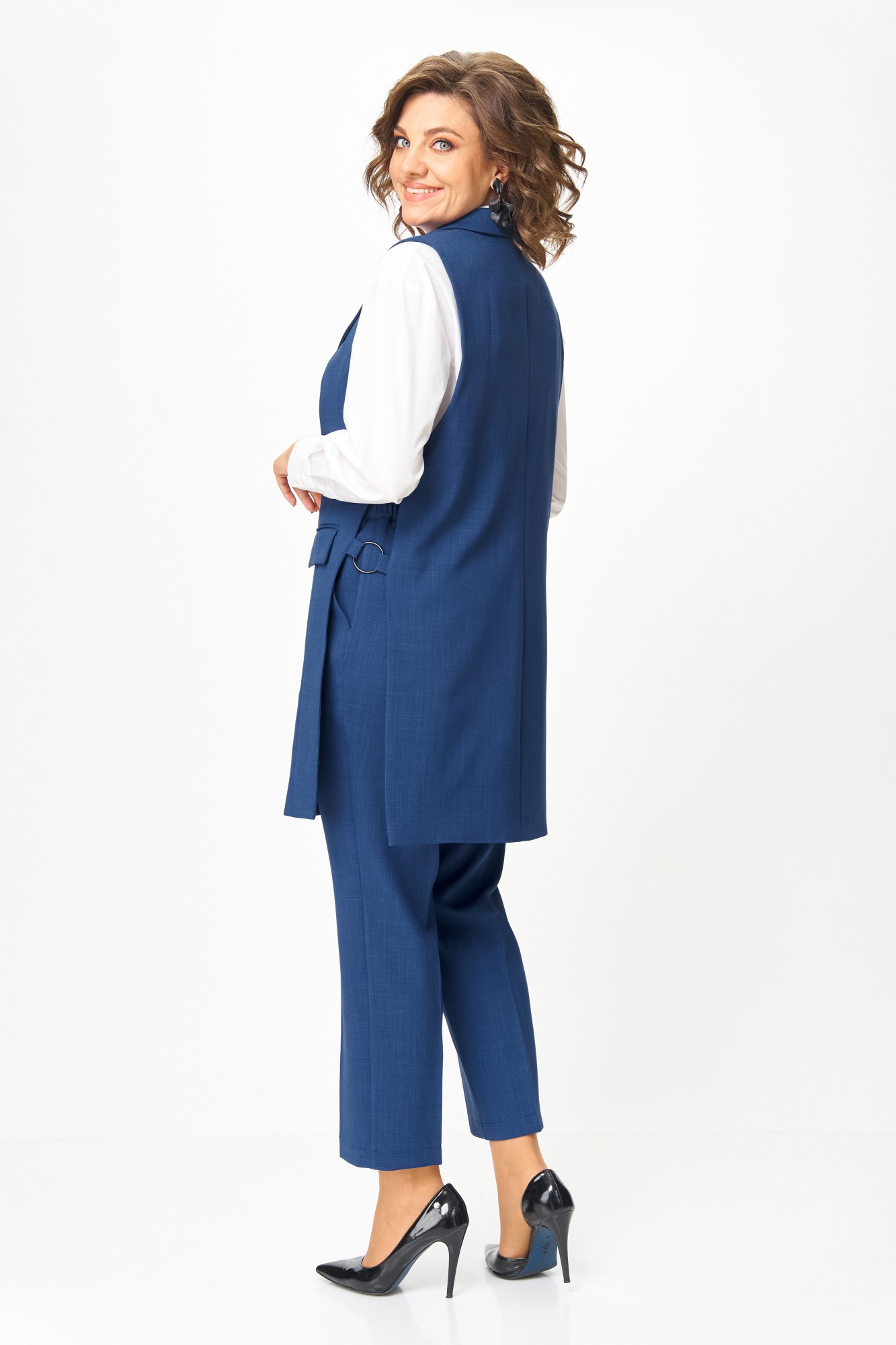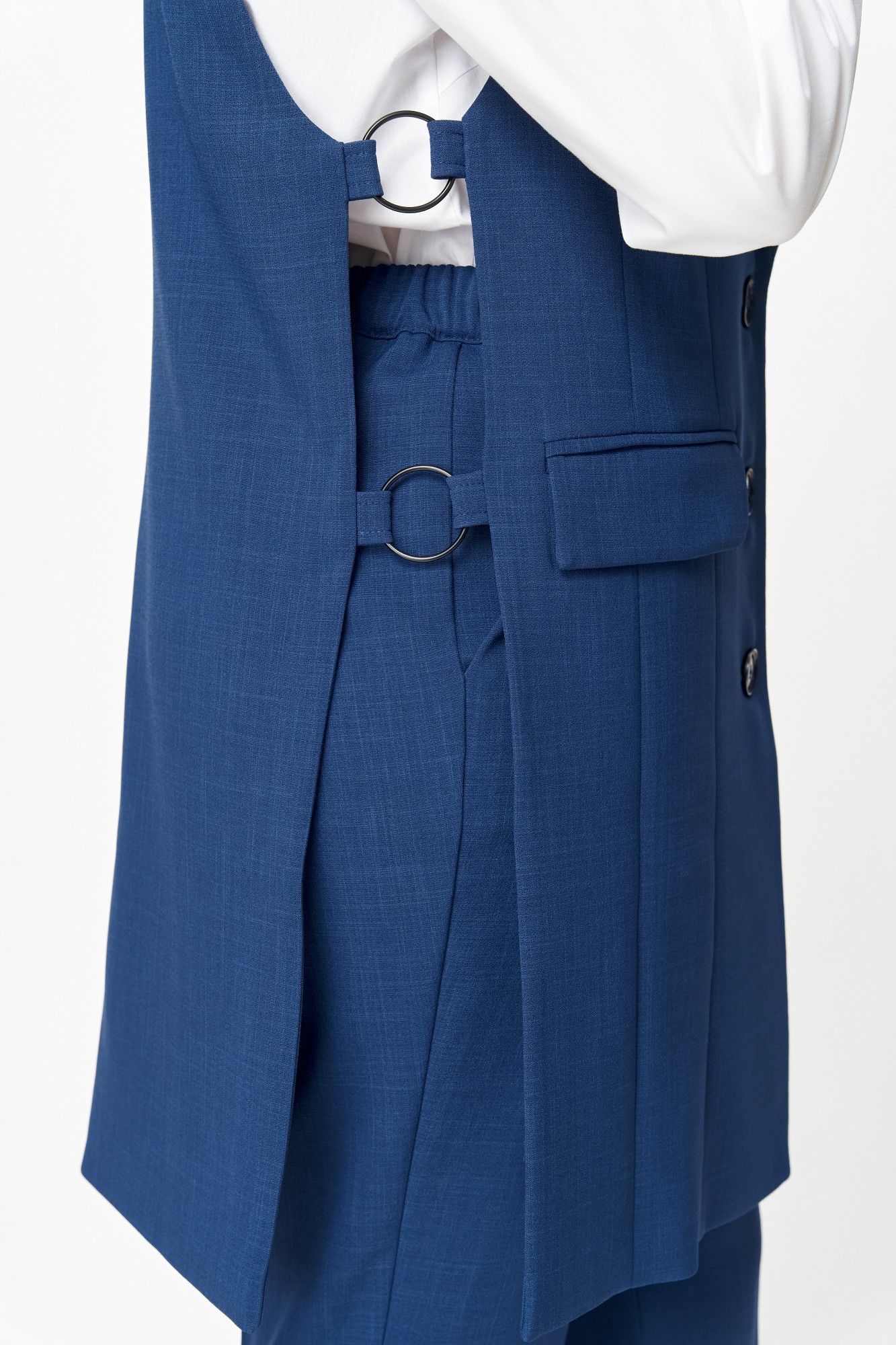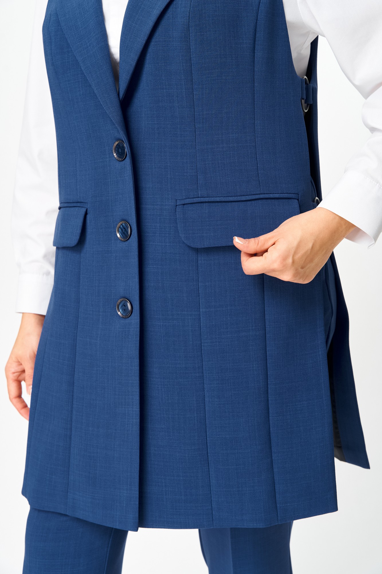 Костюм состоит из жилета и брюк. Костюм выполнен из однотонной ткани, жилет на подкладке. Жилет прямого силуэта, удлиненный. Полочка жилета с центральной застежкой на петли и пуговицы, вертикальными рельефами и прорезными карманами с клапанами. Горловина V-образной формы с отложными лацканами и воротником пиджачного типа. Спинка со средним швом. В боковых швах выполнен декоративный элемент в виде металлических колец крепящихся на петлях. Брюки классические, длиной до косточки, со стрелками. Брюки прилегающие в области бедер и свободные в колене и по низу. По передним половинкам выполнены наклонные карманы, в среднем шве обработана застежка на молнию. По задним половинкам обработаны таллиевые вытачки. Брюки на притачном поясе с эластичной тесьмой и застежкой на петлю и пуговицу.