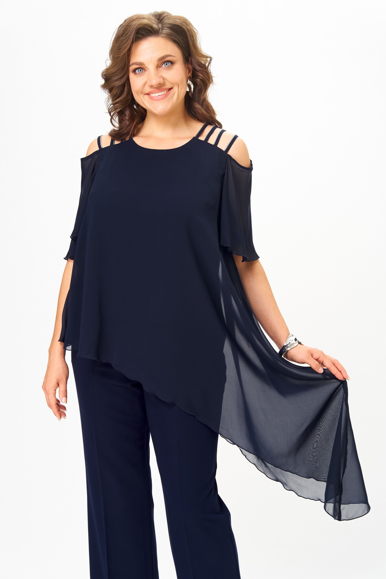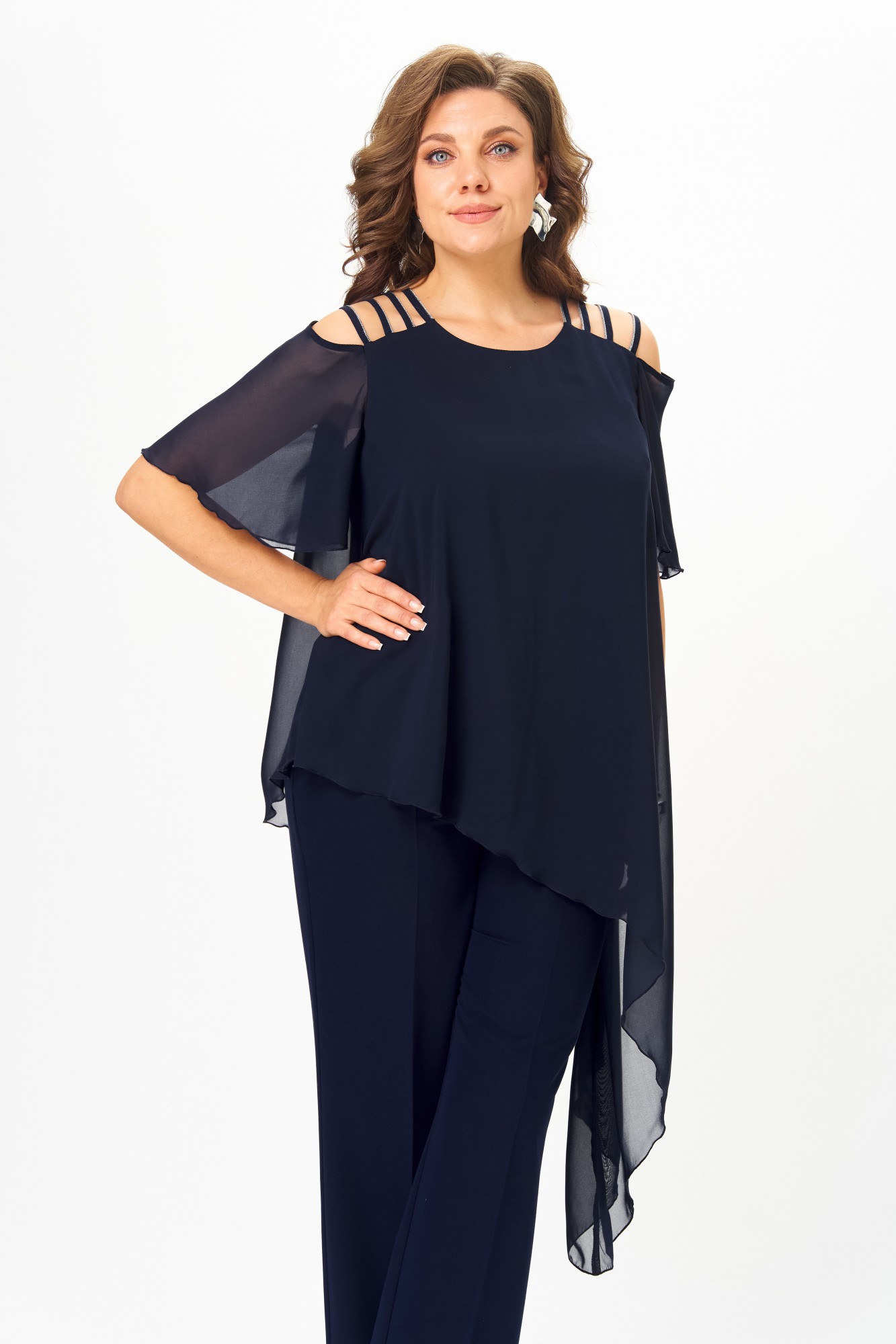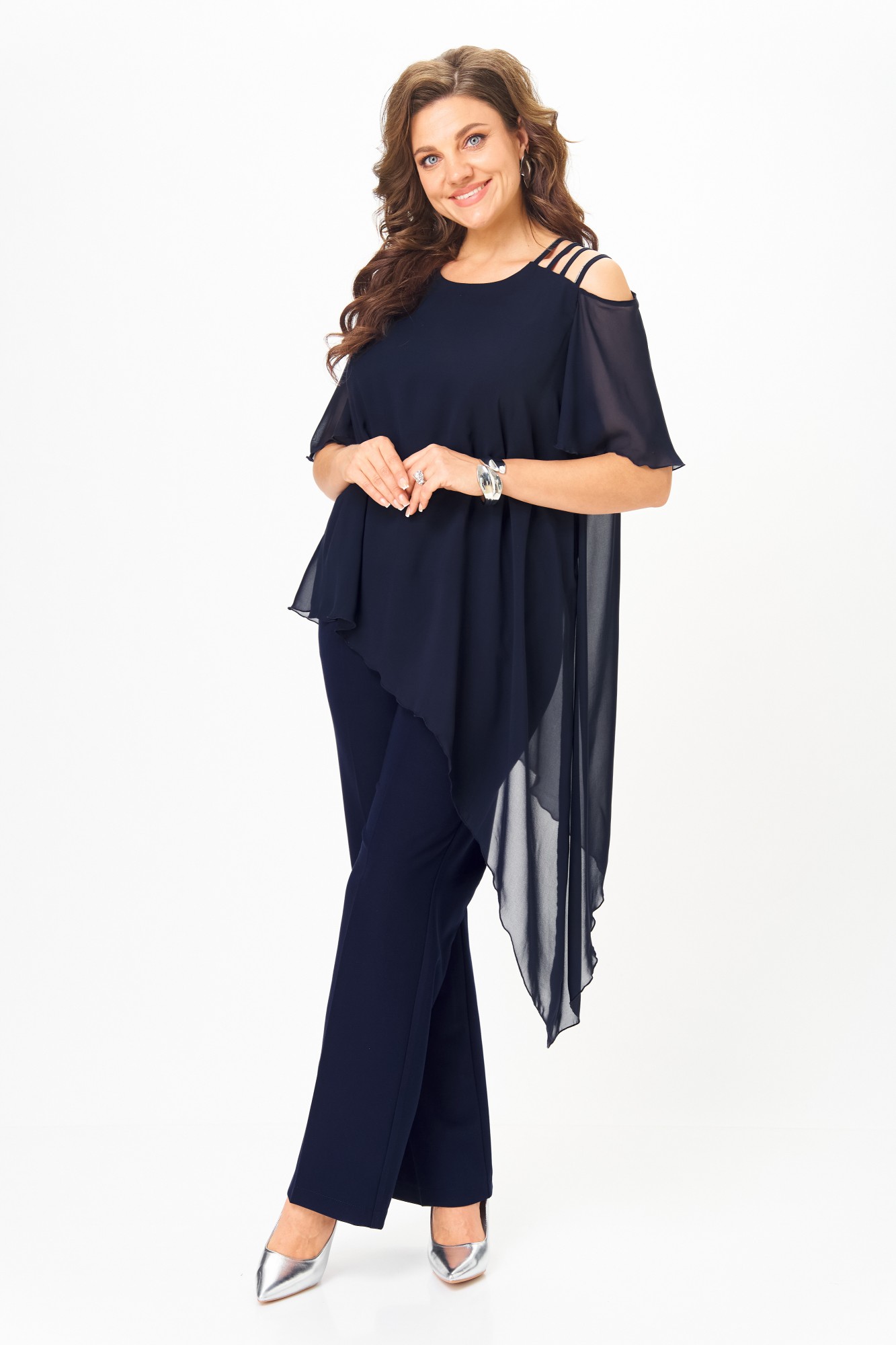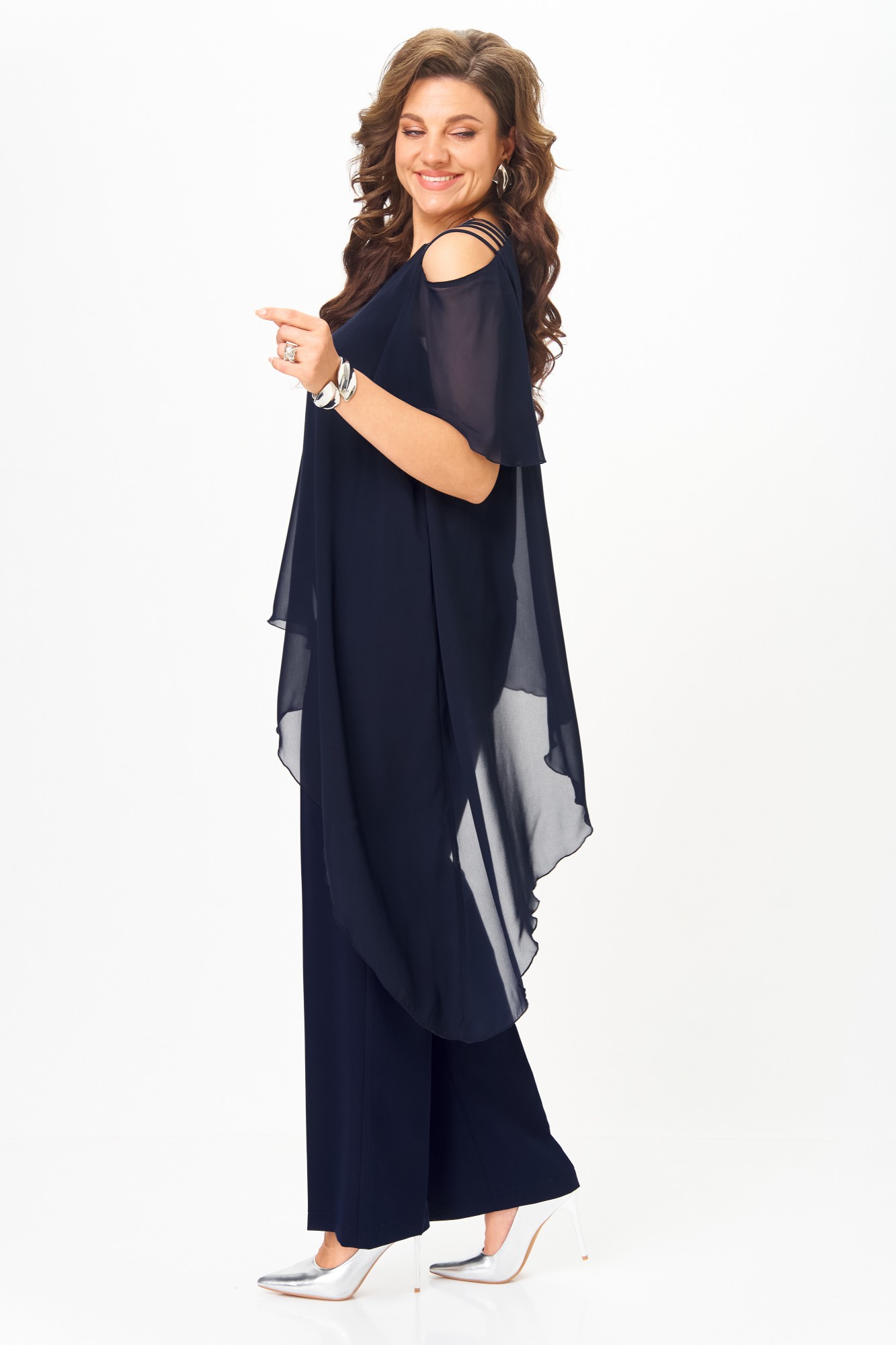 Комплект состоит из туники и брюк. Туника двухслойная, выполнена из однотонного полупрозрачного струящегося шифона (верхняя часть) и трикотажного однотонного полотна (нижняя часть). Брюки выполнены из костюмной однотонной ткани. Ткань брюк имеет механическое растяжение благодаря содержанию в ней эластана. Брючный костюм идеальный вариант на торжественные мероприятия. Туника А-образного силуэта с ассиметричным низом. Верхняя часть туники из шифона, полочка и спинка цельные, с круглой горловиной. Плечевой пояс на бретелях с декором из тесьмы с люрексом. Рукав в виде волана, длиной до локтя. Нижняя часть туники из трикотажного полотна, полочка с нагрудными вытачками, спинка цельная. Брюки полной длины, прилегающие в области бедер и свободные в колене и по низу. Брюки со стрелками. По передним половинкам выполнены наклонные карманы. В среднем шве передней половинки обработана застежка на молнию. По задней половинке обработаны таллиевые вытачки. По талии брюки на притачном поясе с эластичной тесьмой и застежкой на петлю и пуговицу. По поясу брюк обработаны шлевки под ремень.