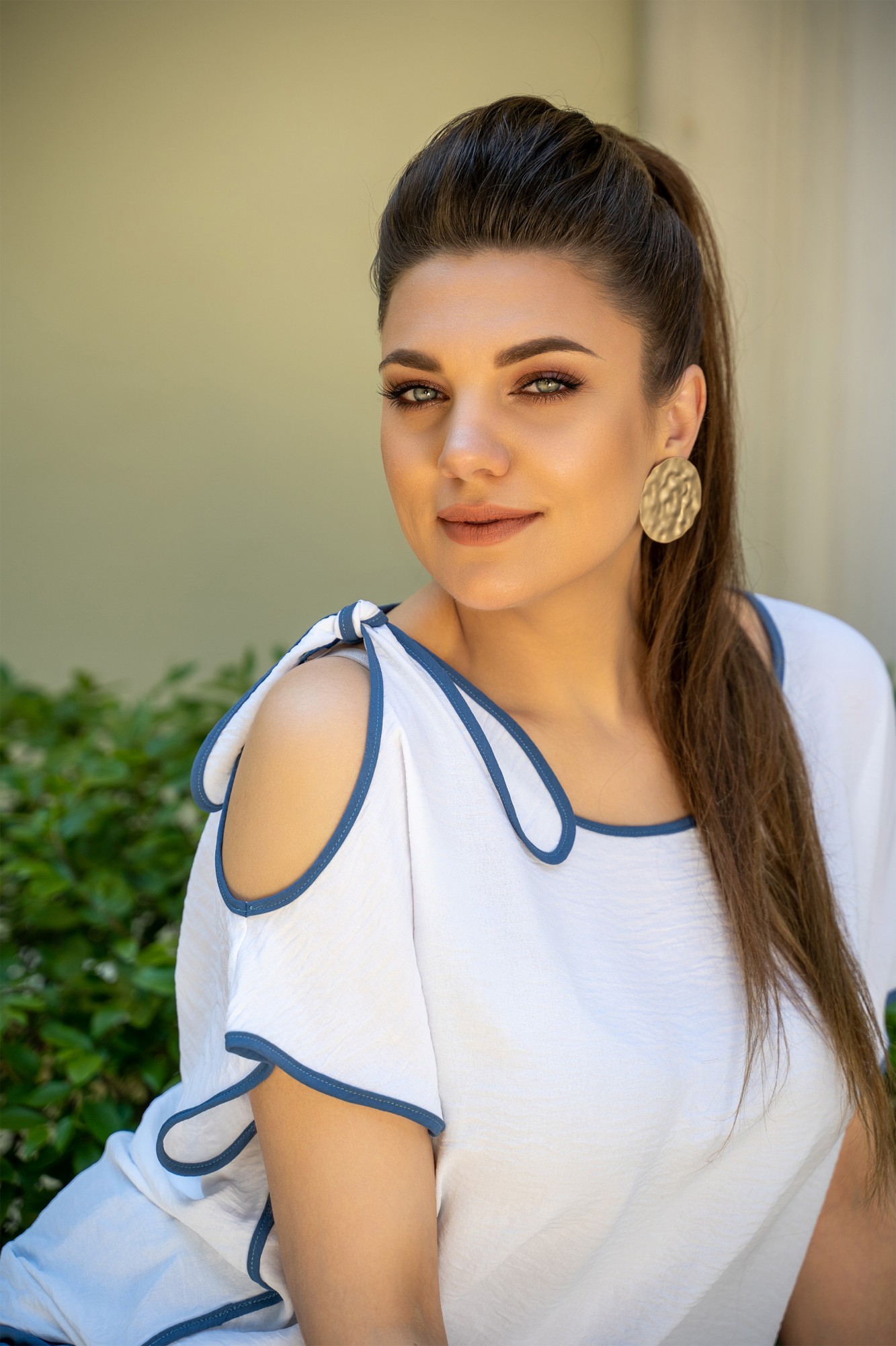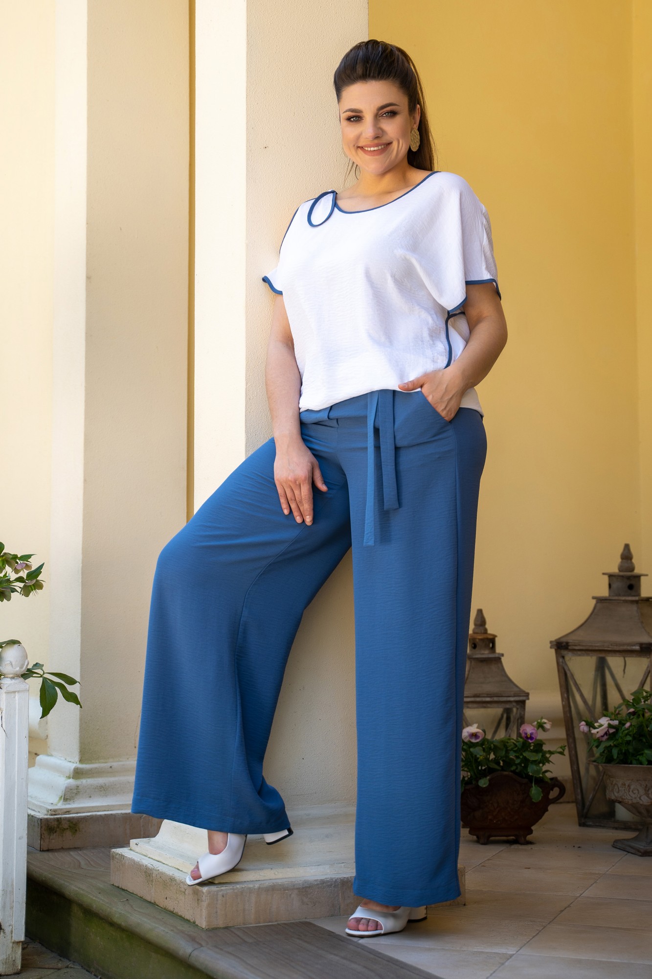 Костюм женский брючный. блузка прямого силуэта, с асимметричными спущенными плечами, с контрастной окантовкой. Брюки женские повседневные свободного кроя , на притачном поясе со шлевками по переду и поясом завязкой, пояс по спинке с резинкой, Передние половинки с боковыми наклонными карманами. Задние половинки с талевыми вытачками.