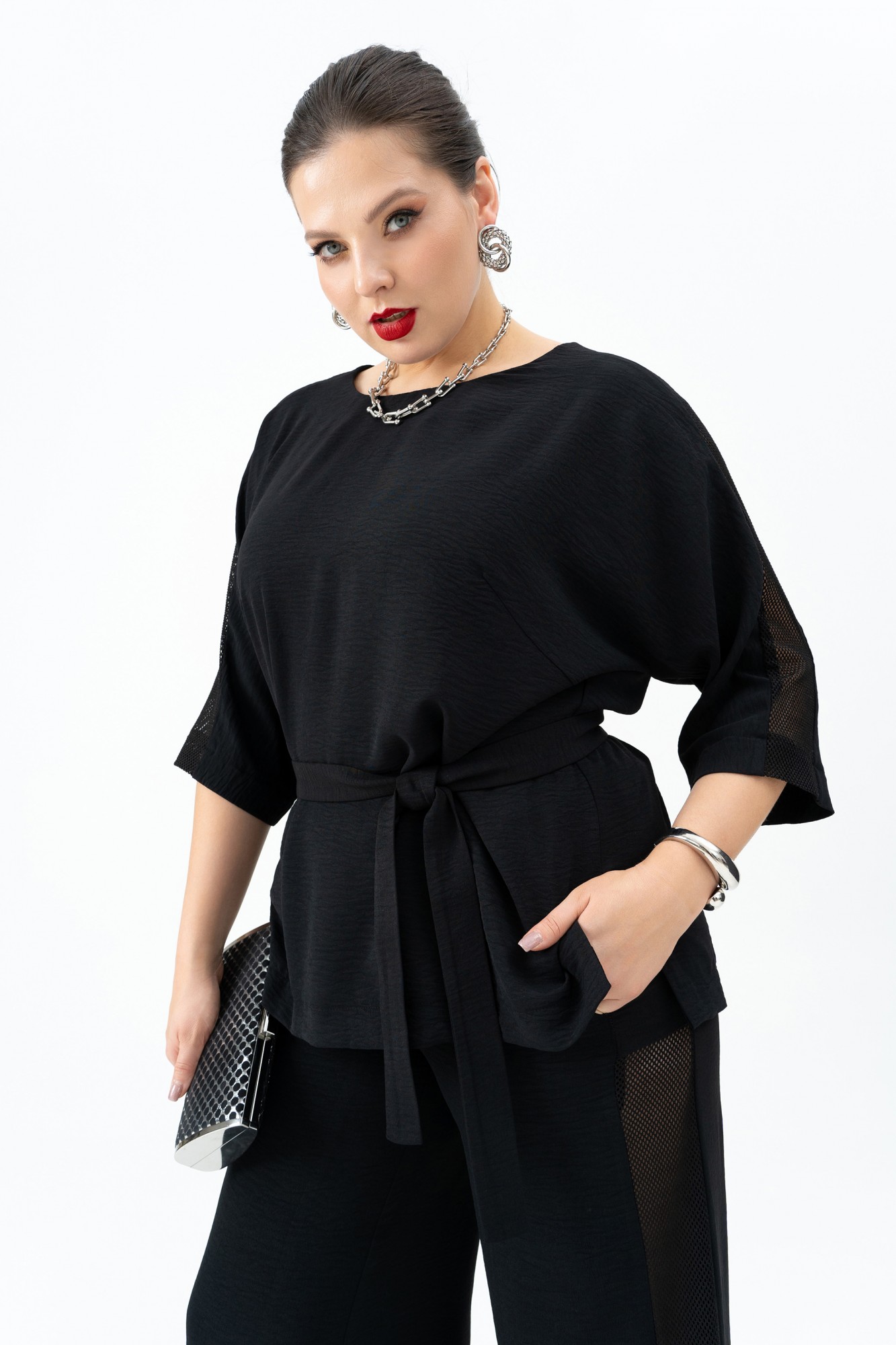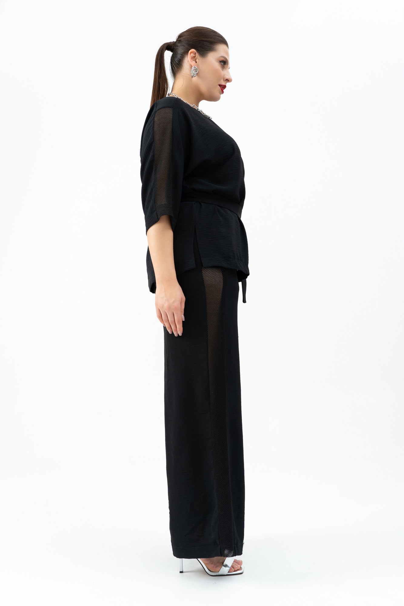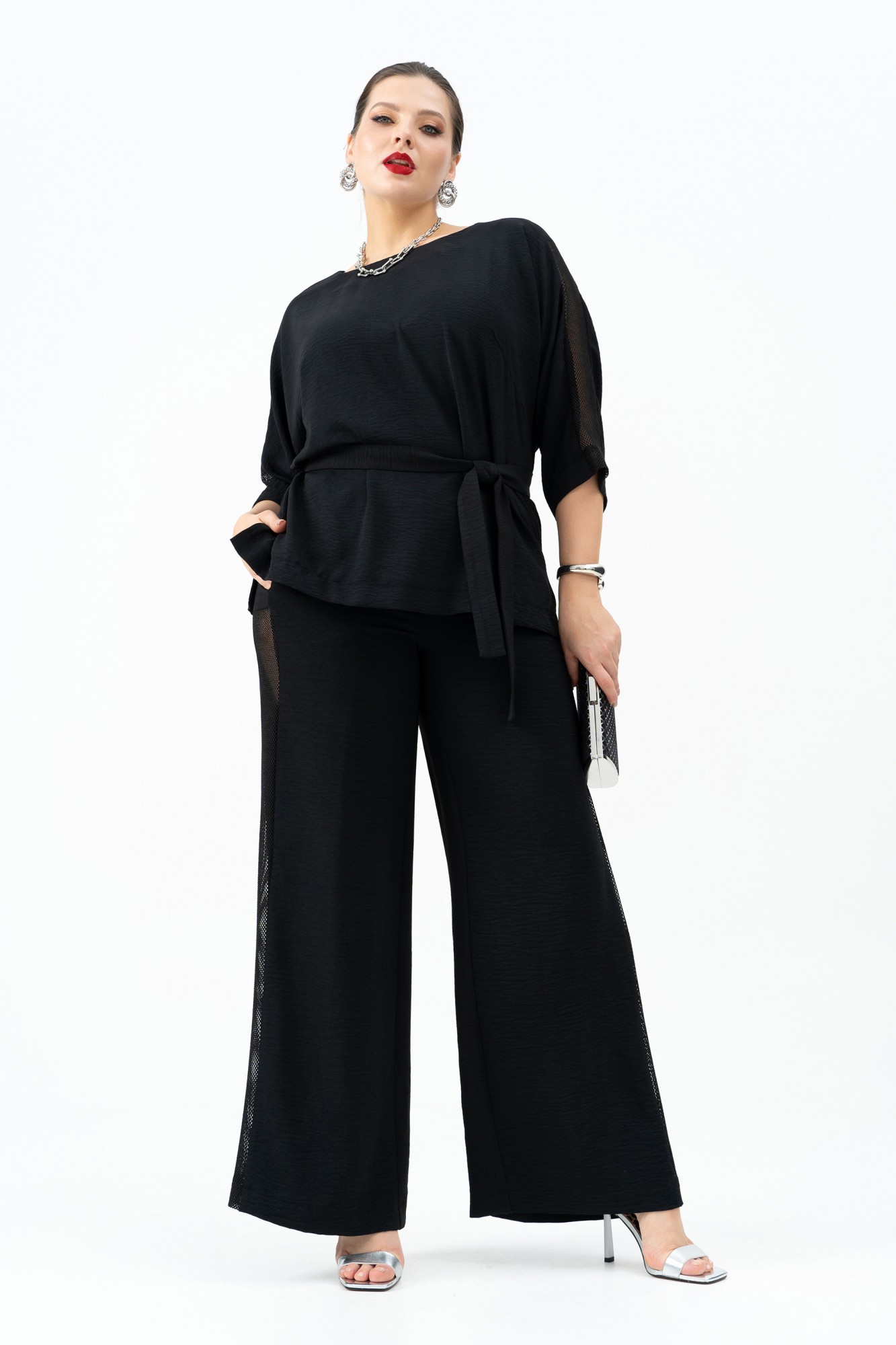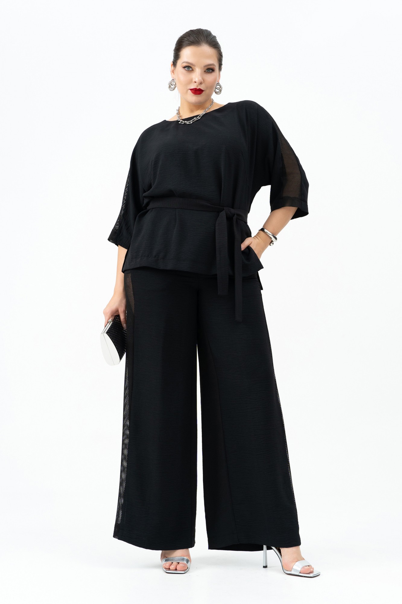 Костюм женский брючный классика для любого мероприятия . Туника прямого силуэта, с круглым вырезом горловины, с нагрудными вытачками, со вставками из сетки по рукавам, с боковыми разрезами, со съёмным поясом. Брюки женские прямого кроя, на притачном поясе по переду и с резинкой по спинке. Передние половинки с карманами в швах. Брюки по боковым швам со вставкой из сетки.