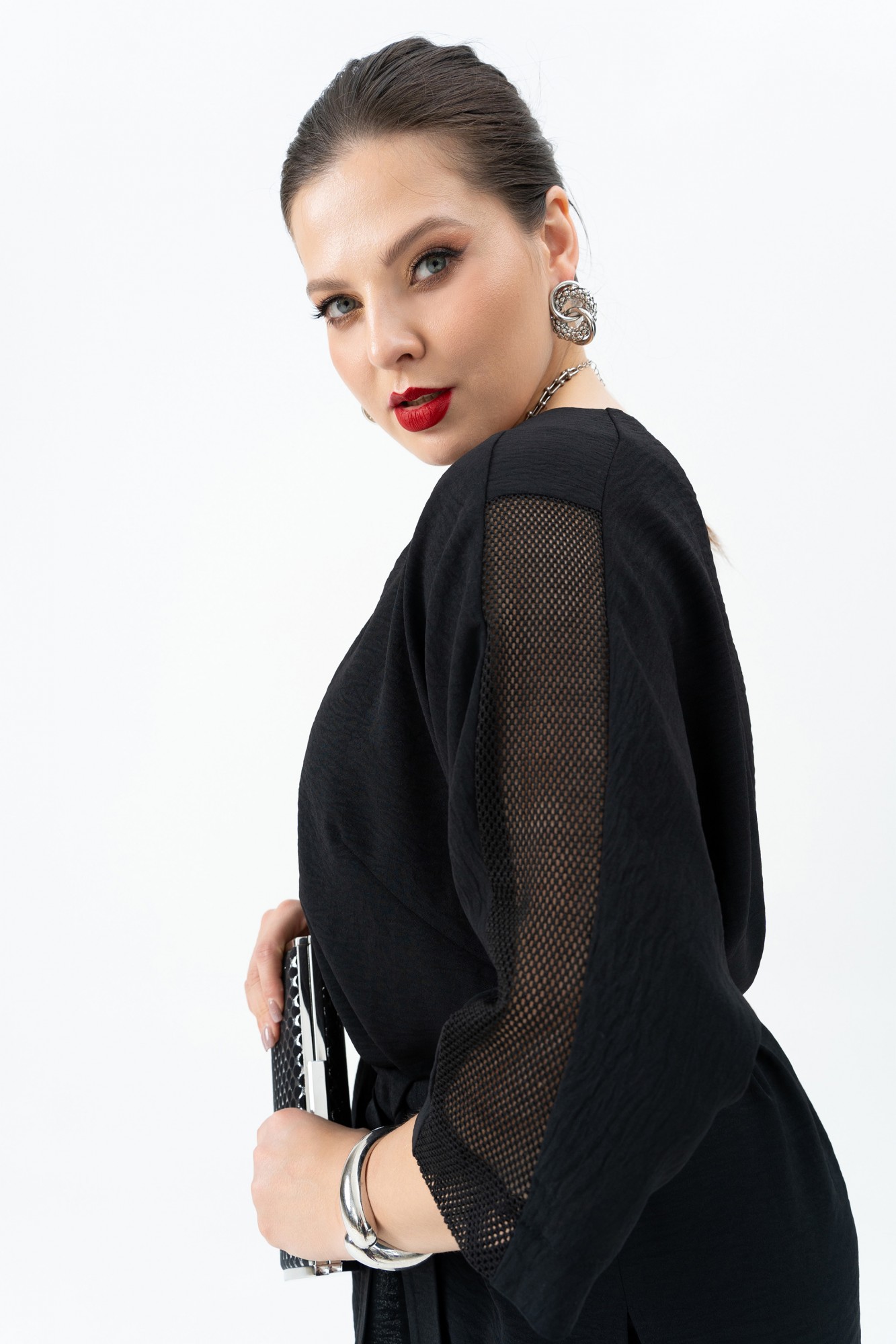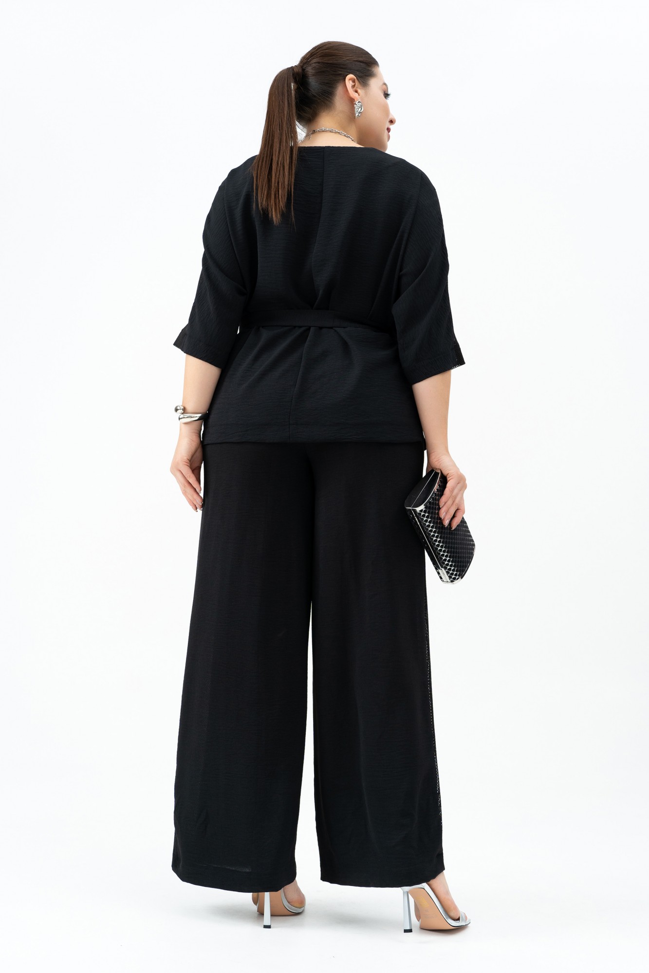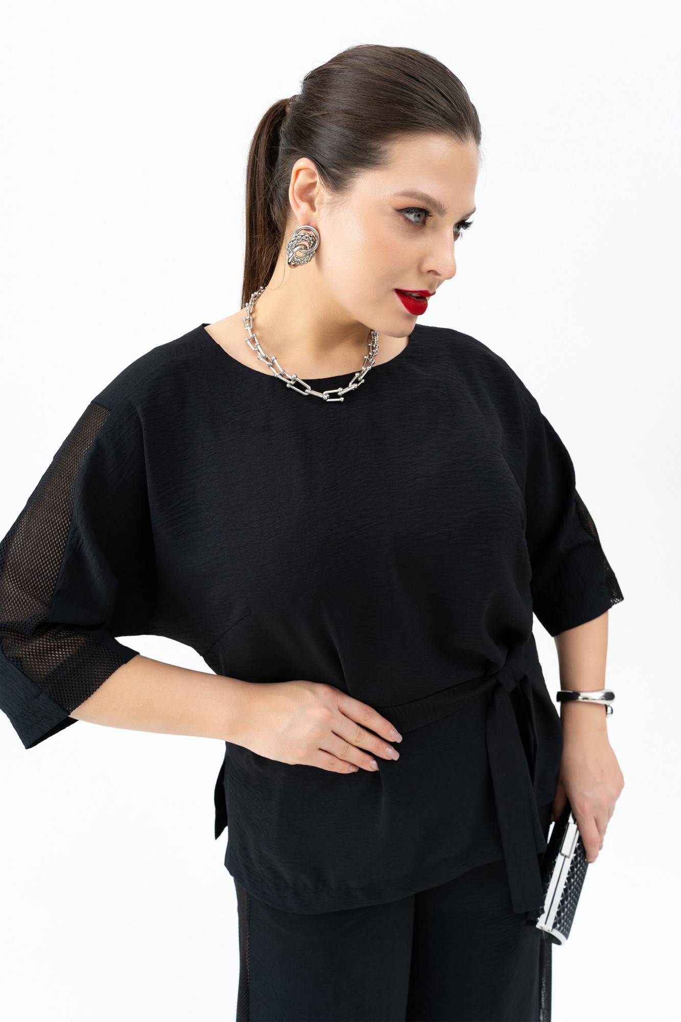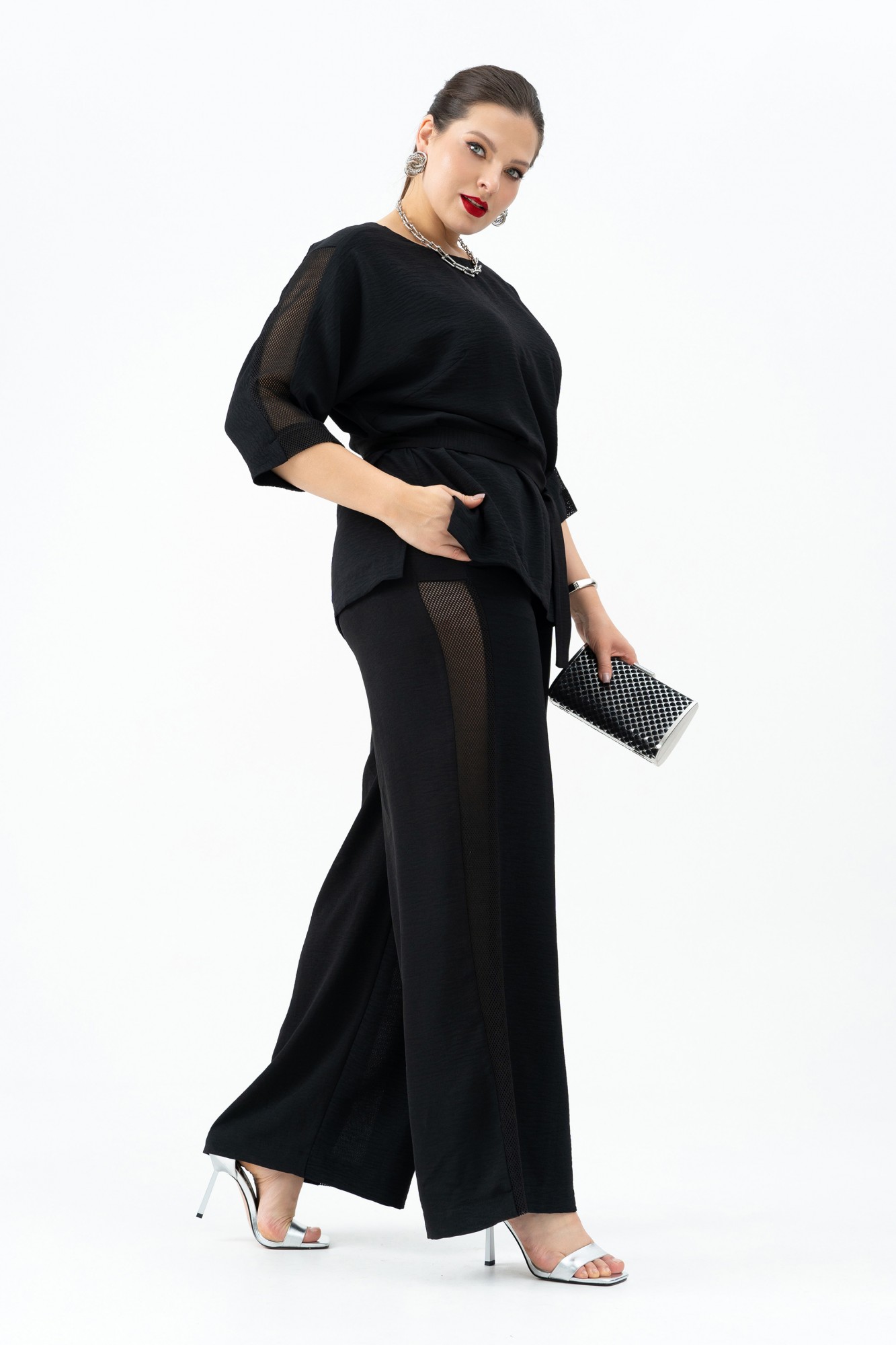 Костюм женский брючный классика для любого мероприятия . Туника прямого силуэта, с круглым вырезом горловины, с нагрудными вытачками, со вставками из сетки по рукавам, с боковыми разрезами, со съёмным поясом. Брюки женские прямого кроя, на притачном поясе по переду и с резинкой по спинке. Передние половинки с карманами в швах. Брюки по боковым швам со вставкой из сетки.