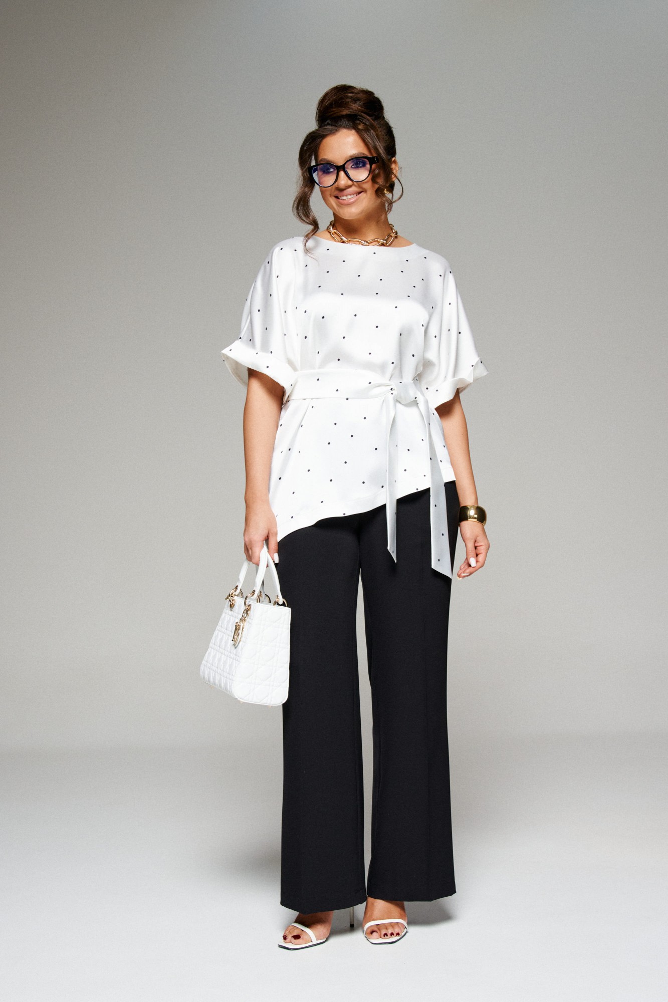 Деловой и нарядный комплект, состоящий из двух предметов: блузона и брюк. Блузон свободного кроя выполнен из ткани атлас, которая мягко облегает фигуру, а благодаря своему блеску придаёт изделию торжественный и презентабельный вид. Перед цельный. Спинка разрезная по среднему шву, в верхней части которого расположен небольшой разрез-капля с застёжкой на петельку и пуговицу. Горловина округлой формы, обработана обтачкой. Рукав цельнокроеный с притачной манжетой. В комплекте предусмотрен пояс, шириной 6см. Брюки выполнены из ткани «французский креп», которая красиво струится и имеет очень легкий стрейч. Покрой классический, посадка высокая. В верхней части брюк расположены функциональные карманы. Застежка центральная на молнию и петлю с пуговицей на поясе. В задней части пояса брюк для удобства использования и прилегания вставлена эластичная тесьма.