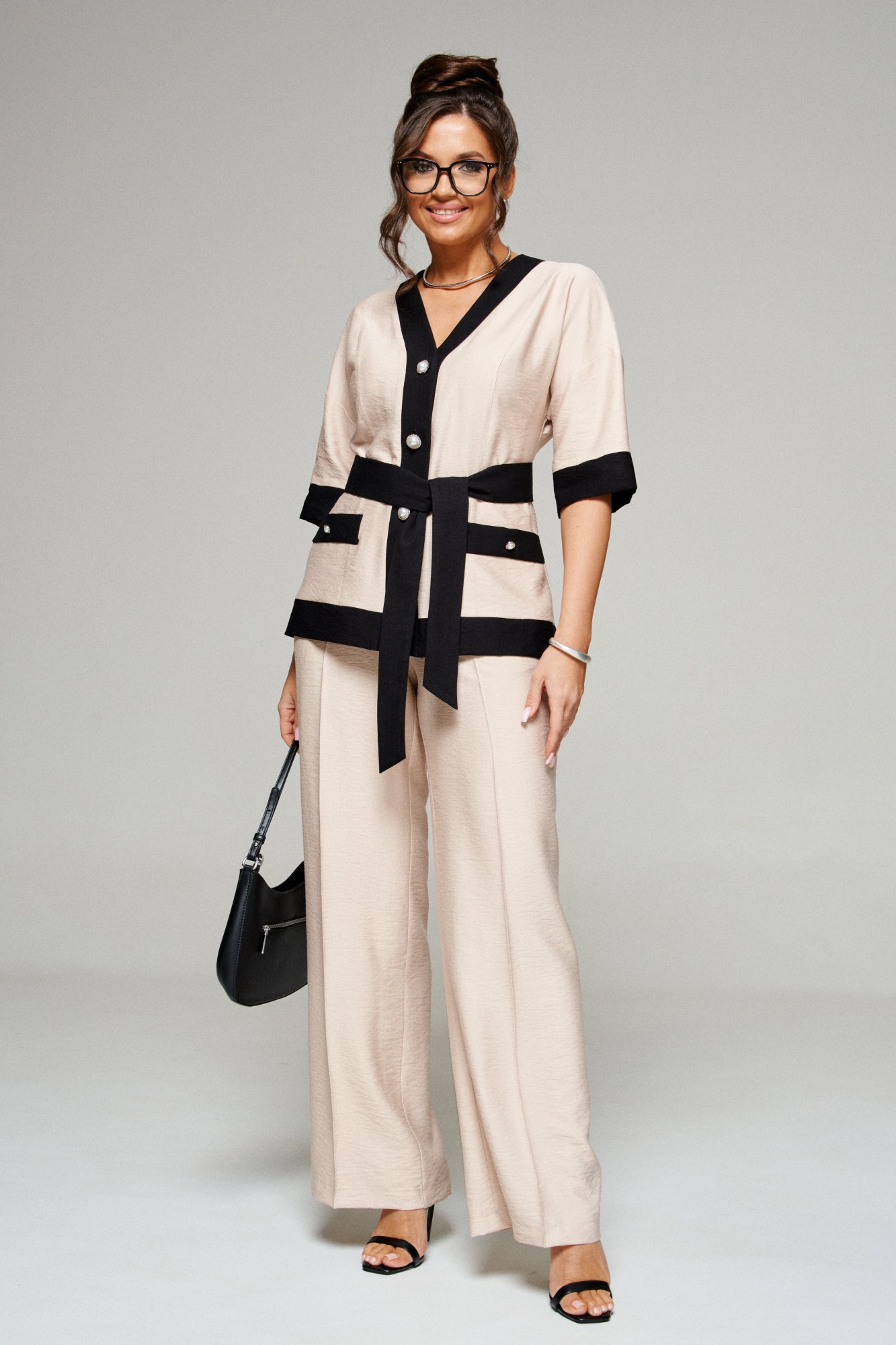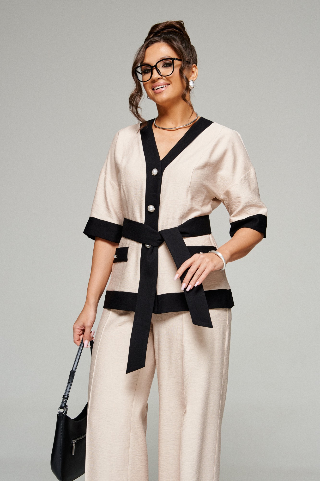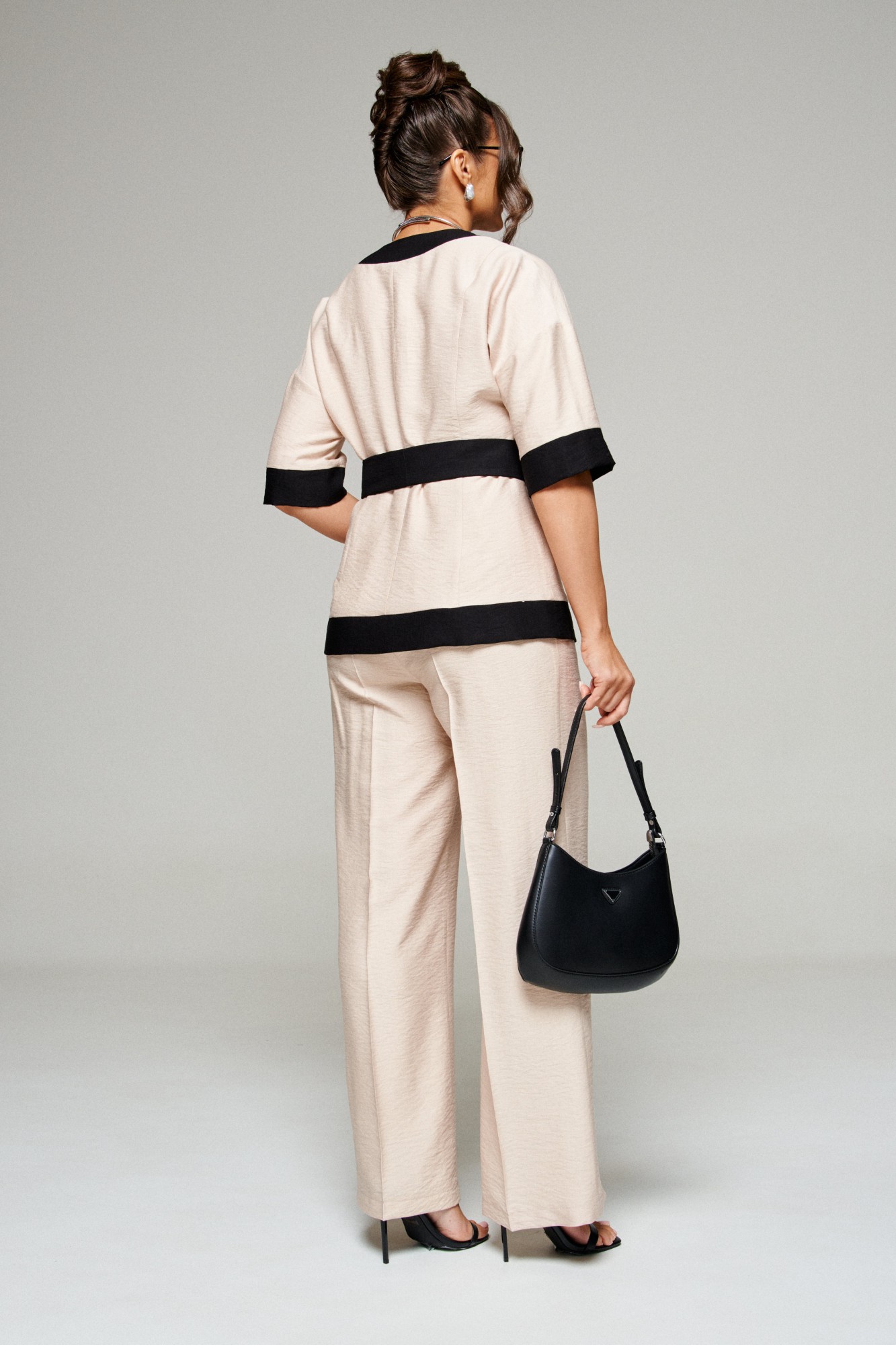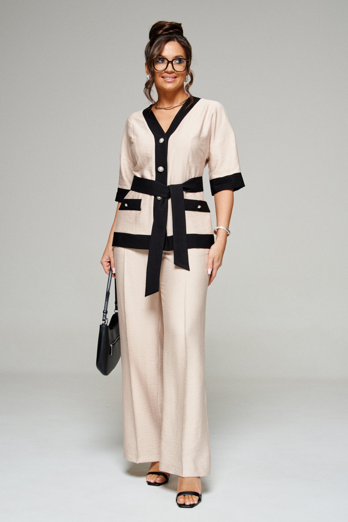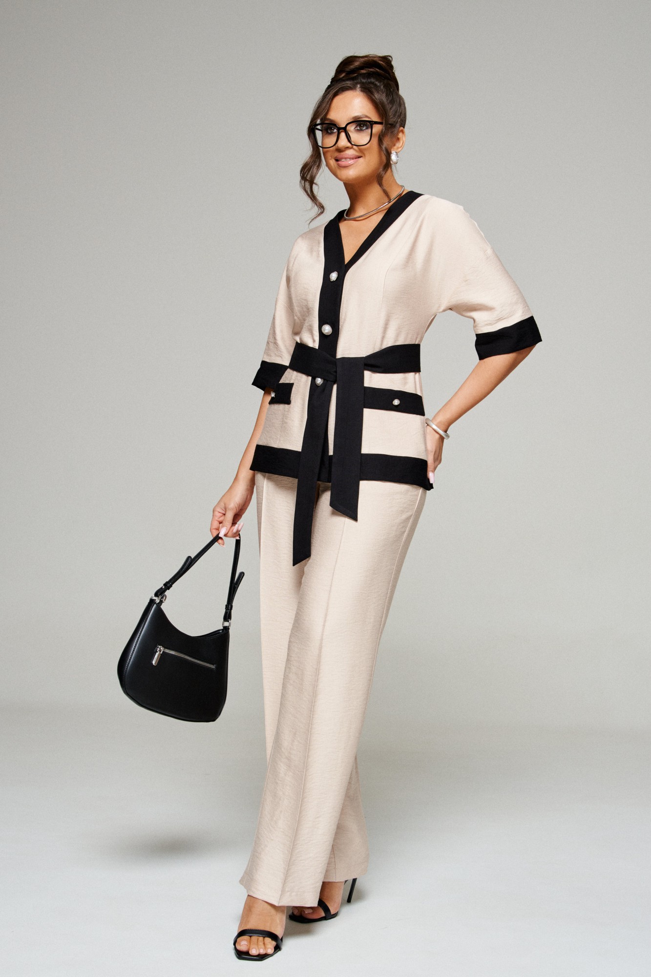 Женский льняной костюм с акцентными деталями и безупречные натуральные оттенки! Созданный отличительным кроем с подчеркнутыми деталями, костюм задаст уверенное настроение образу как в будние, так и в выходные дни. Эффектный костюм в стиле «Шанель» состоит из жакета и брюк, выполнен из мягкой смесовой ткани с натуральным волокном лен, практичен в носке. Жакет полуприлегающего силуэта, однобортный с контрастными деталями-планками. Передняя часть из двух половинок, с вертикальными рельефами от плеча и накладными нижними клапанами, имитирующими карманы. Спинка со средним швом и с вертикальными рельефами от плеча. Горловина V-образной формы. Линия плеча удлиненная, чуть спущенная. Рукав рубашечный короткий. Низ жакета и рукавов, горловина, борта и клапаны выполнены из ткани контрастного цвета шириной ~ 4.5 см. Застежка центральная на петли и декоративные пуговицы. Дополнительным элементом служит пояс-завязка в тон контрастных деталей. Брюки длинные, прямые свободные; выполнены из смесового льняного полотна. Посадка классическая, высокая. Застежка центральная на молнию и петлю с пуговицей на поясе. Спереди расположены боковые функциональные карманы. Пояс притачной, сзади на резинке, шириной 4см.