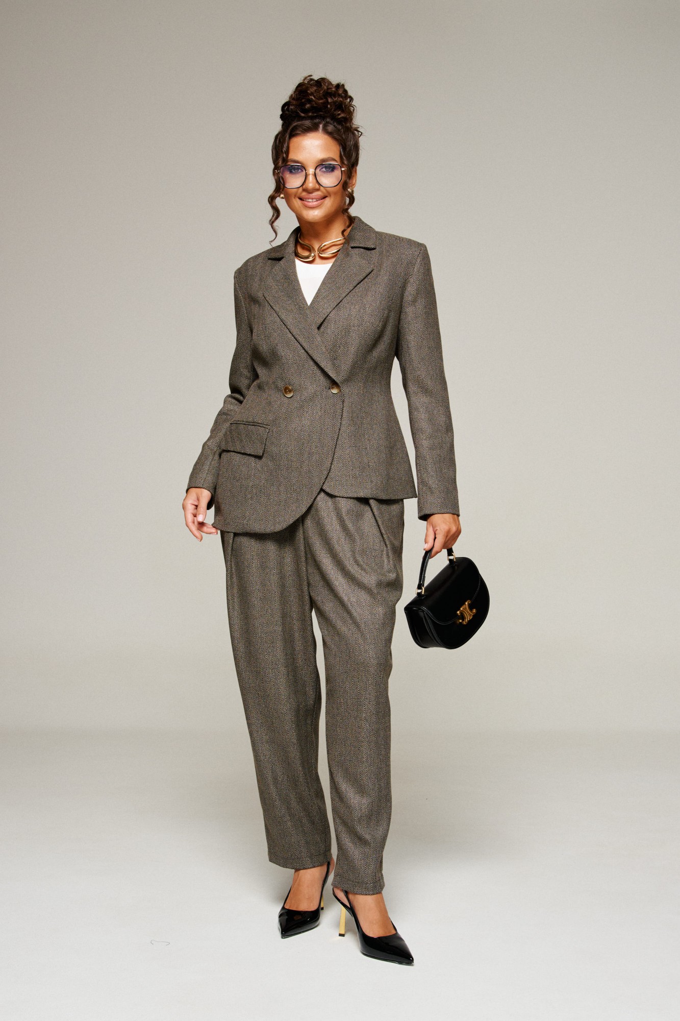 жакет, брюки – вискоза 61%, пэ 22%, пан 14%, эластан 3%; блузка – пэ 68%, вискоза 27%, спандекс 5%.