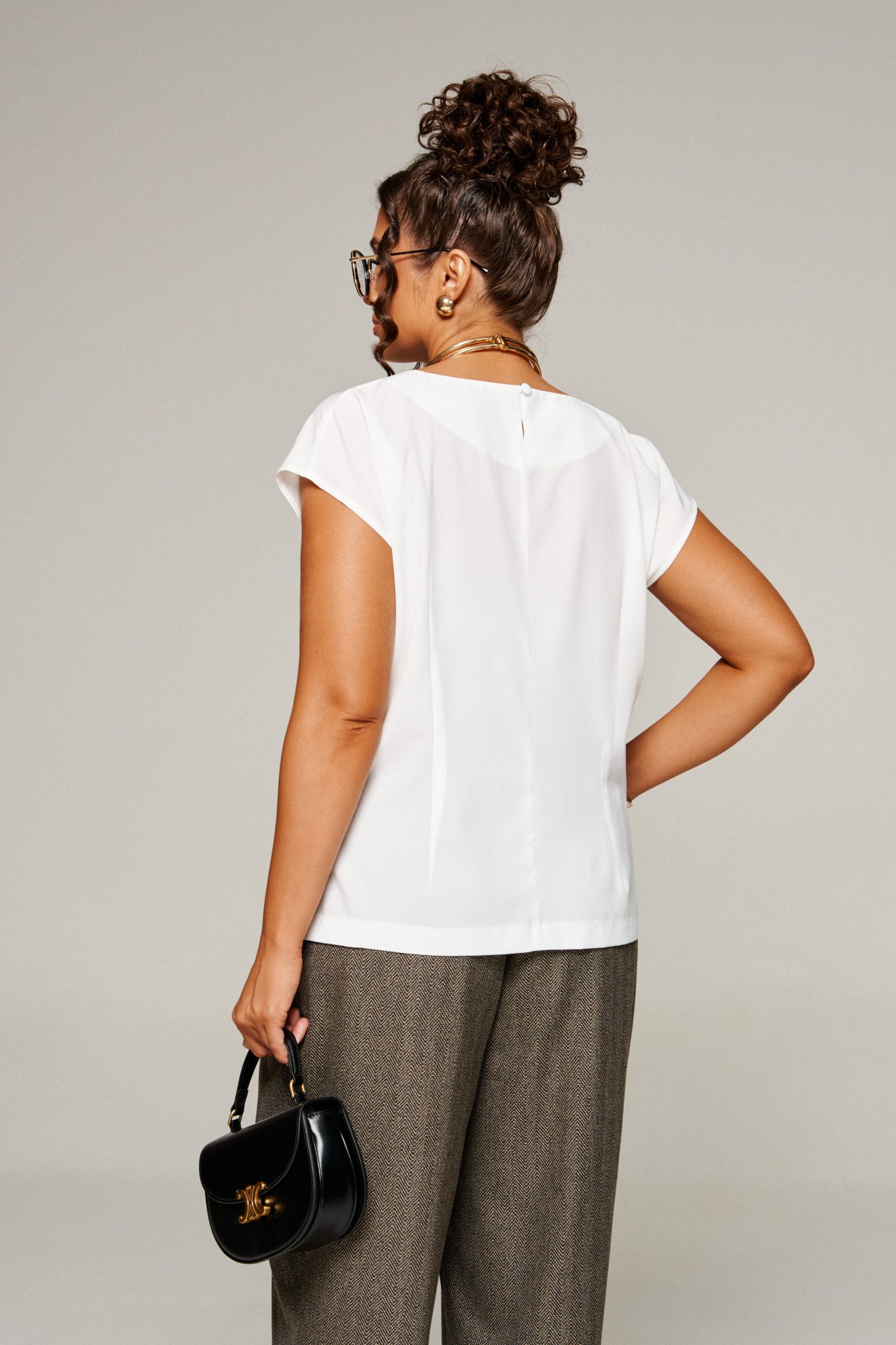 Блузка полуприлегающего силуэта. Горловина округлой формы. В боковых швах снизу разрезы.