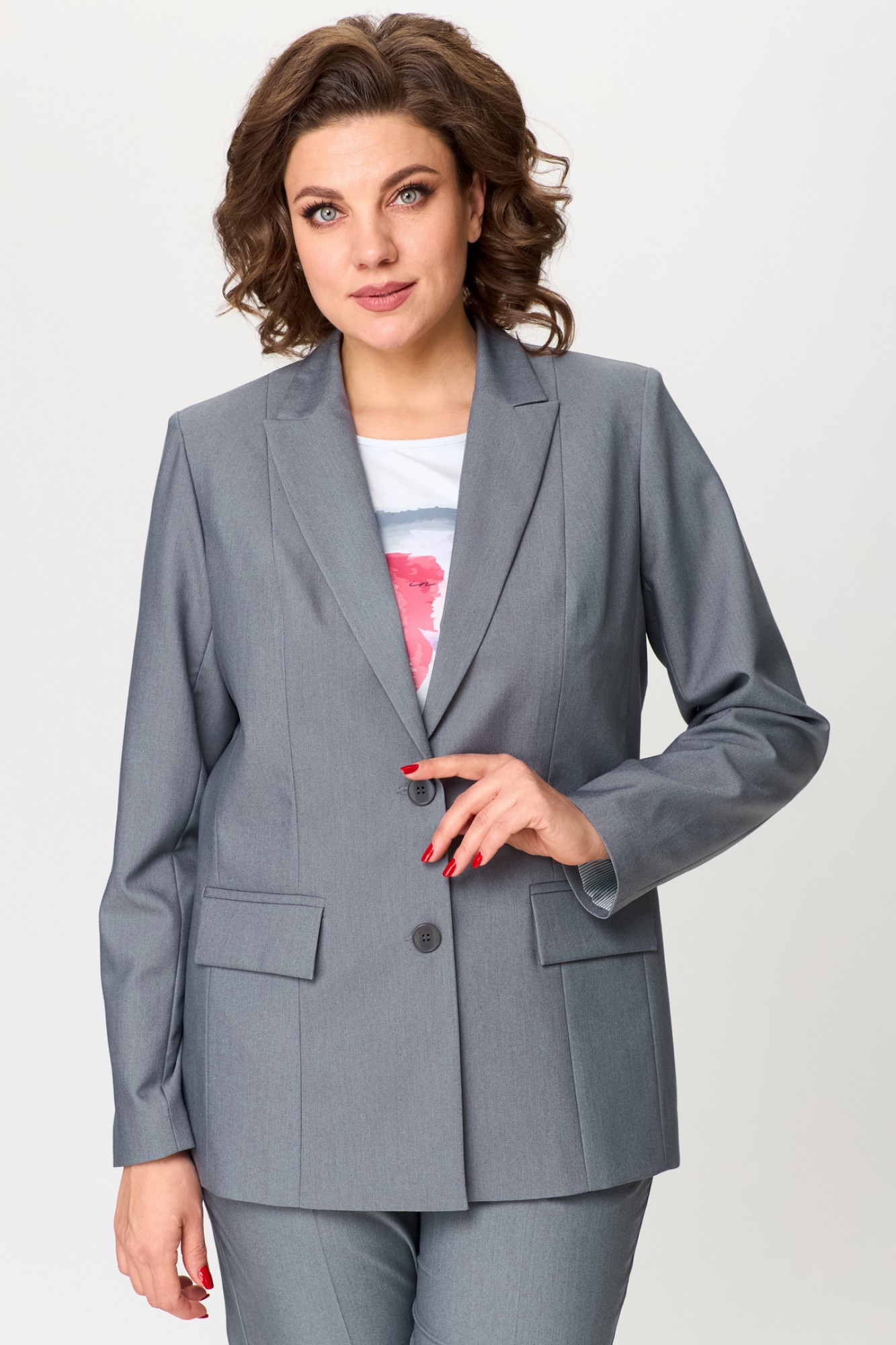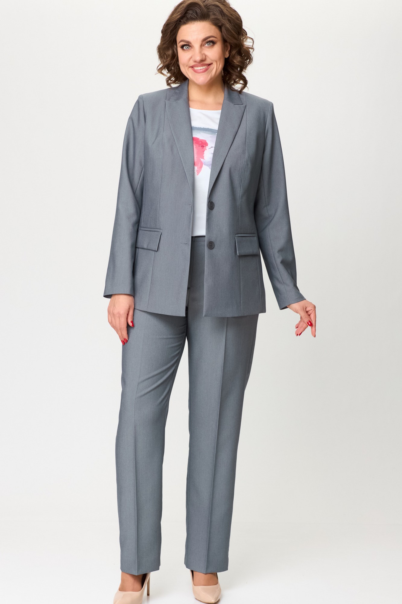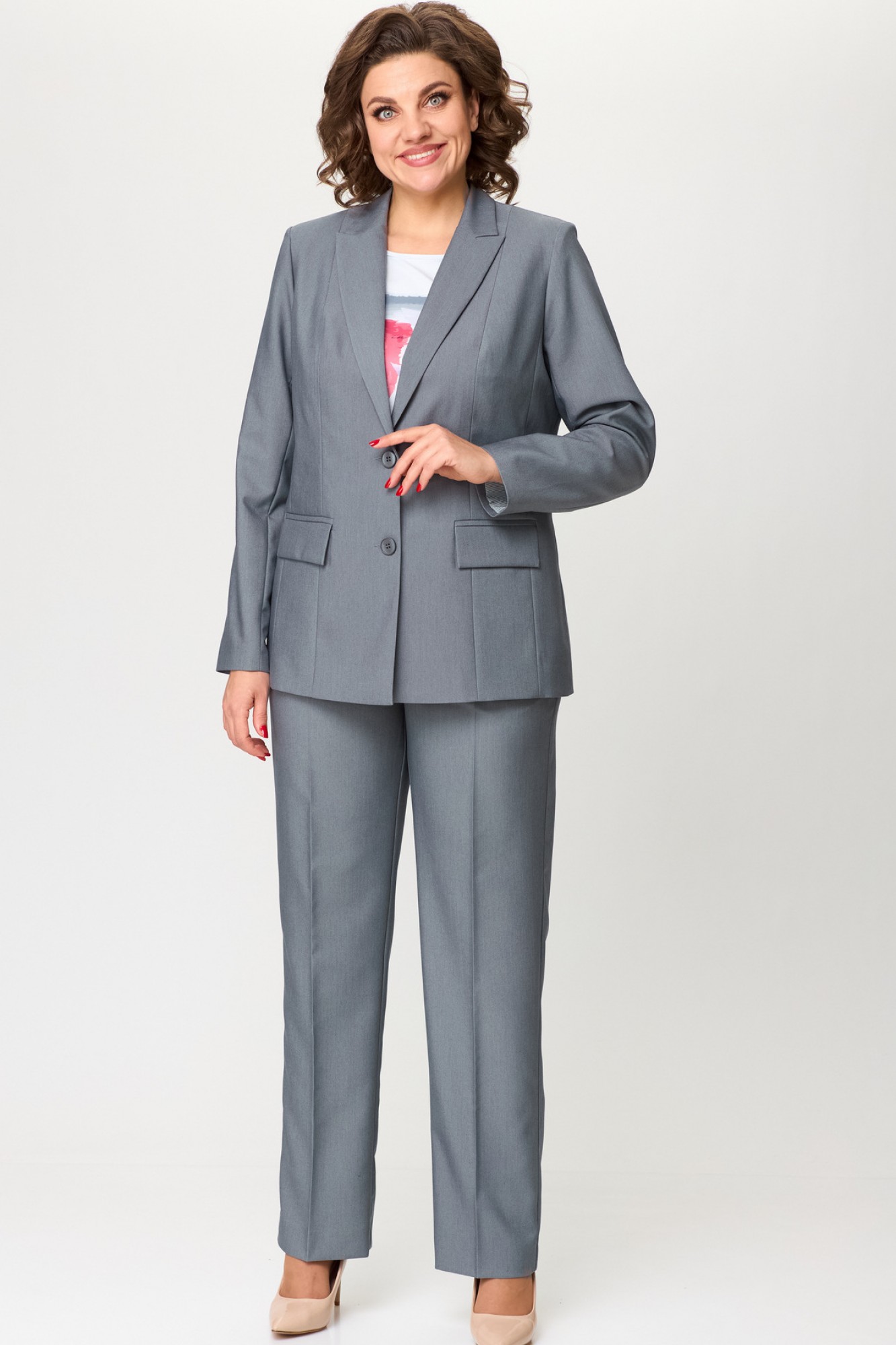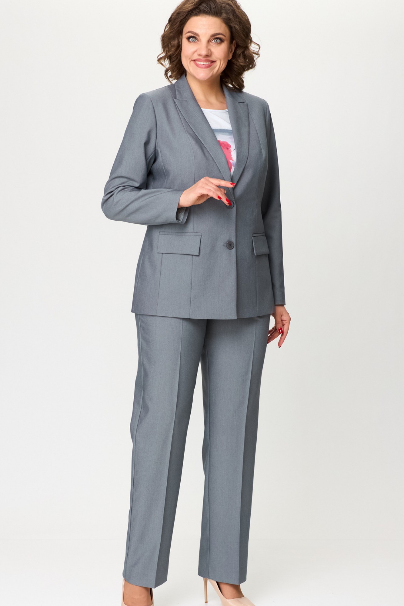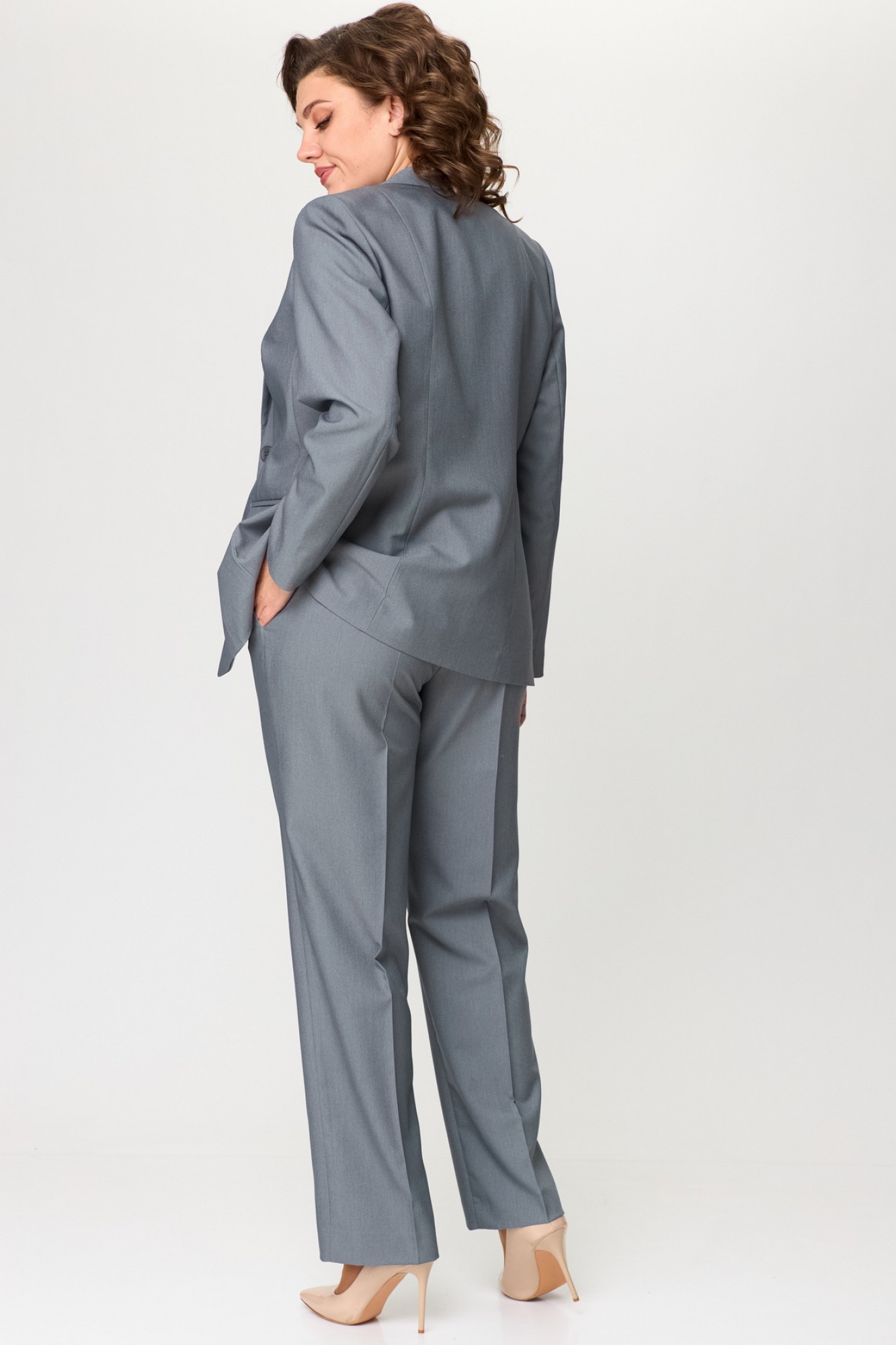 Комплект женский-двойка, из текстильной ткани, жакет удлиненный, полуприлегающего силуэта с центральной бортовой застежкой на пуговицы до линии перегиба лацкана. Спереди рельефные швы от плечевого шва, отрезной бочок и карман с клапаном. Спинка с рельефами от плечевого шва. Рукав втачной, двухшовный. Воротник пиджачного типа. Жакет на подкладке. Брюки прямые, классические, с заутюженными стрелками, по переду обработаны карманы с отрезным бочком, застежка на тесьму-молнию и 1 пуговицу. На задних половинках обработаны вытачки и имитация карманов с листочкой, пояс в брюках притачной.
