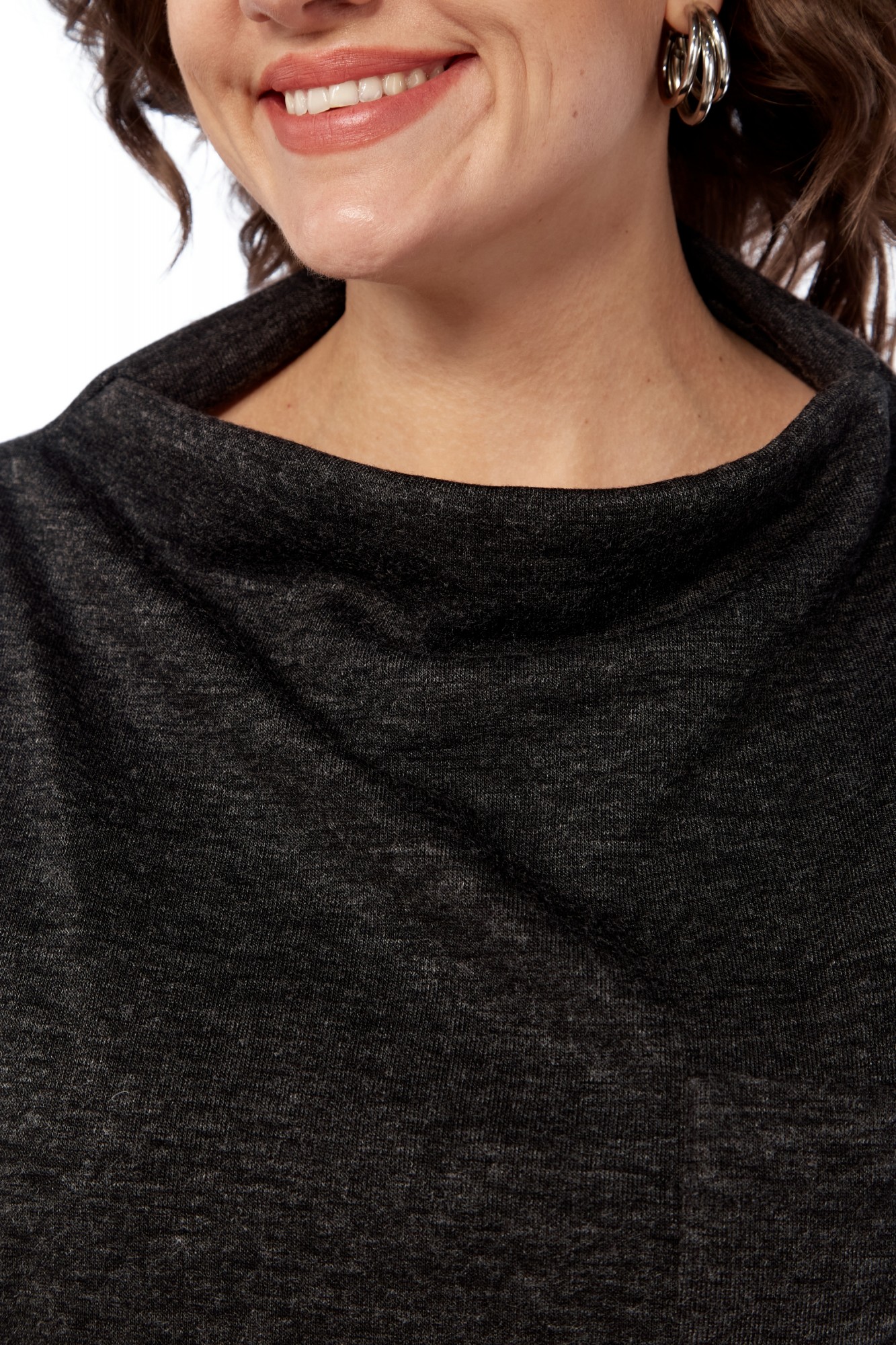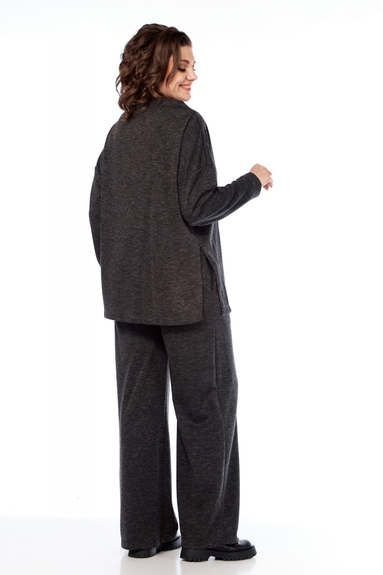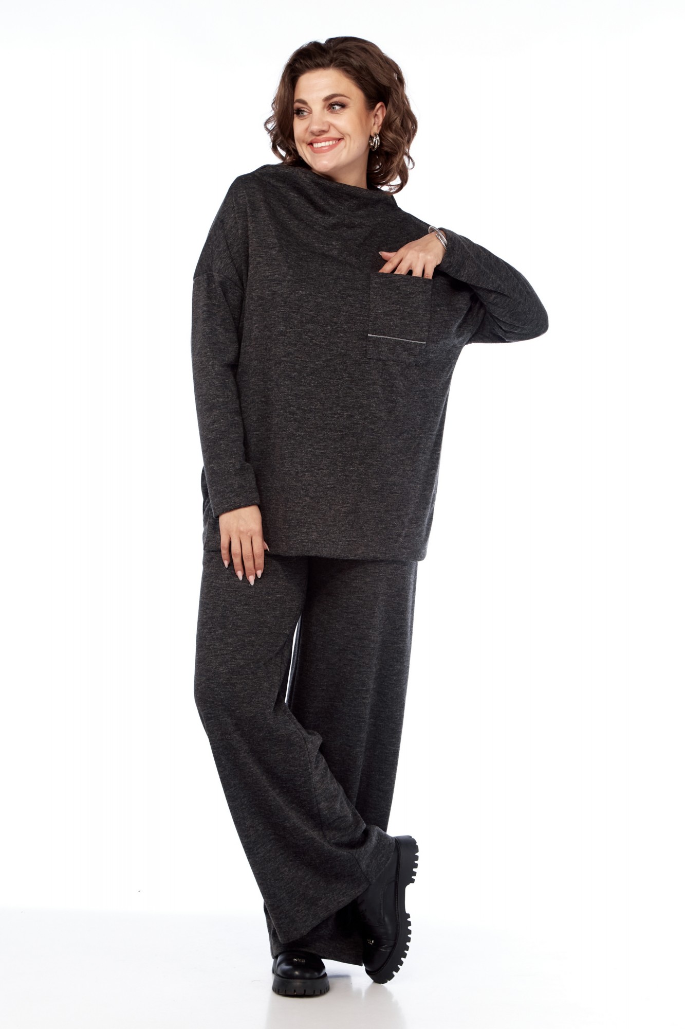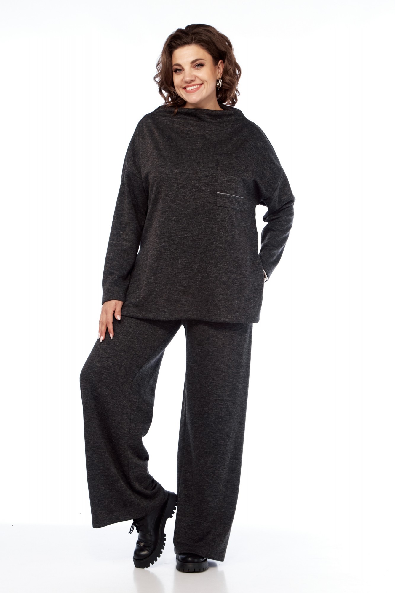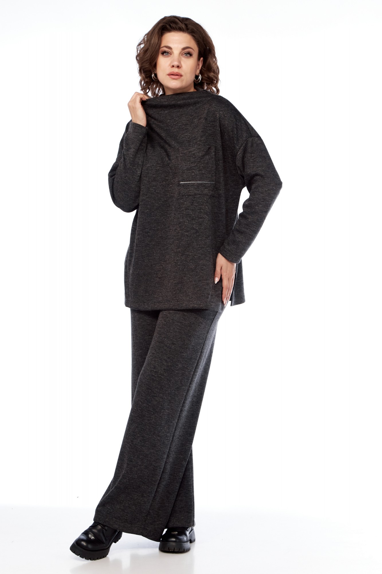 Комплект брючный состоит из кофты и брюк из трикотажного полотна. Кофта с цельнокроеной стойкой. Перед с накладным нагрудным карманом с кантом по левой стороне. Рукав втачной одношовный со спущенной линией плеча. По бокам обработаны разрезы. Брюки прямые, широкие. В боковых швах обработаны карманы. Пояс притачной на резинке.