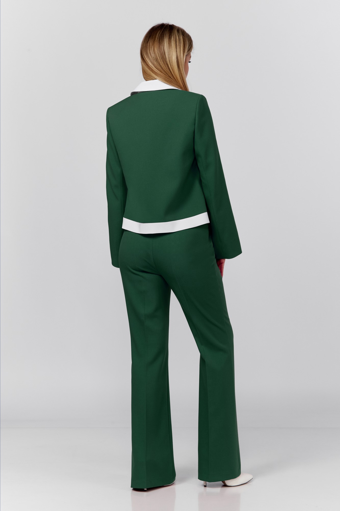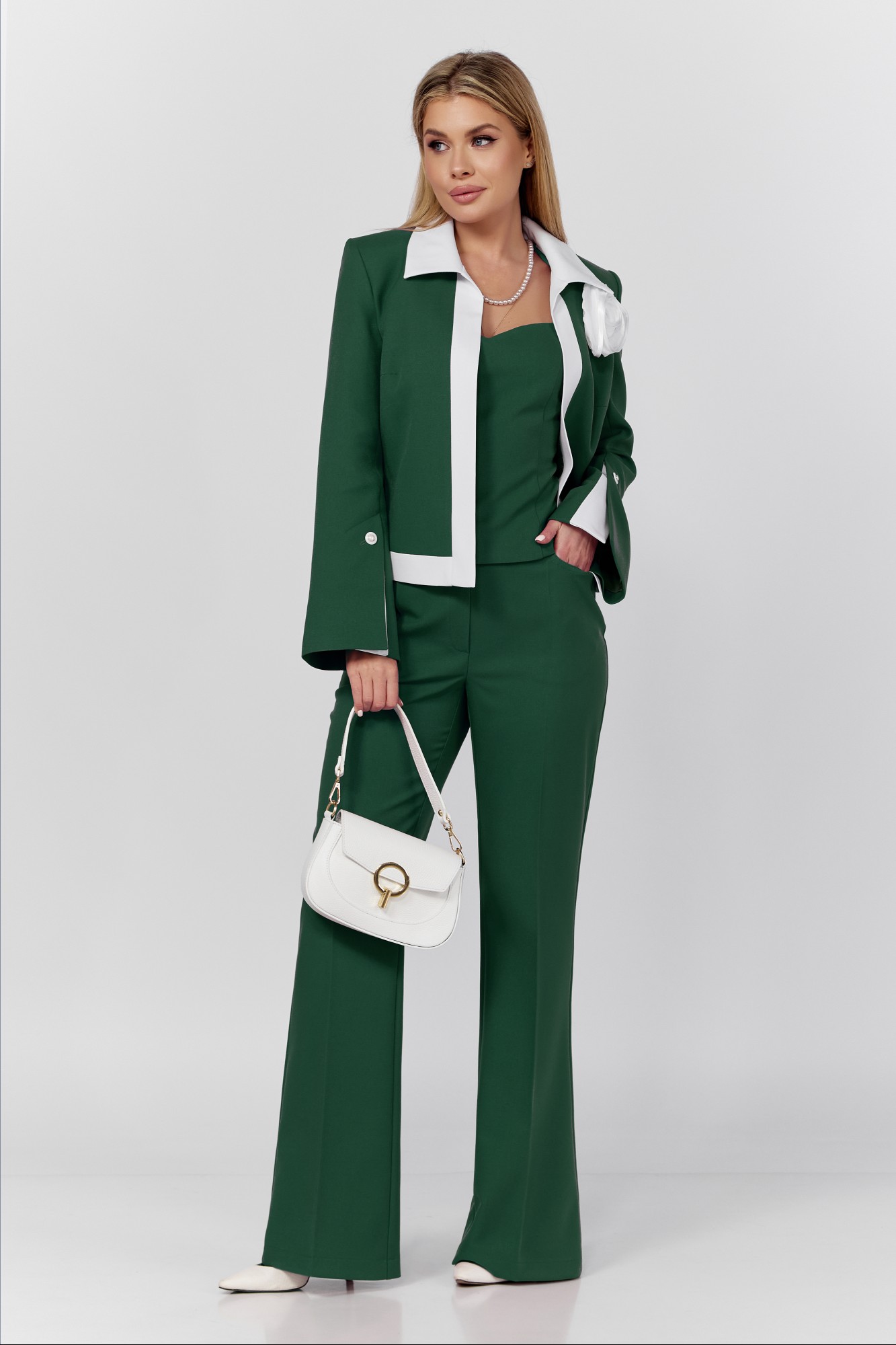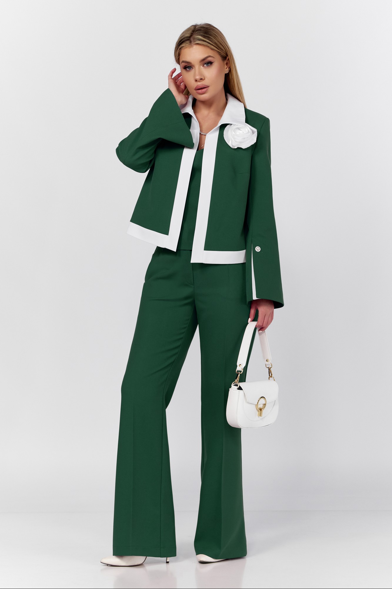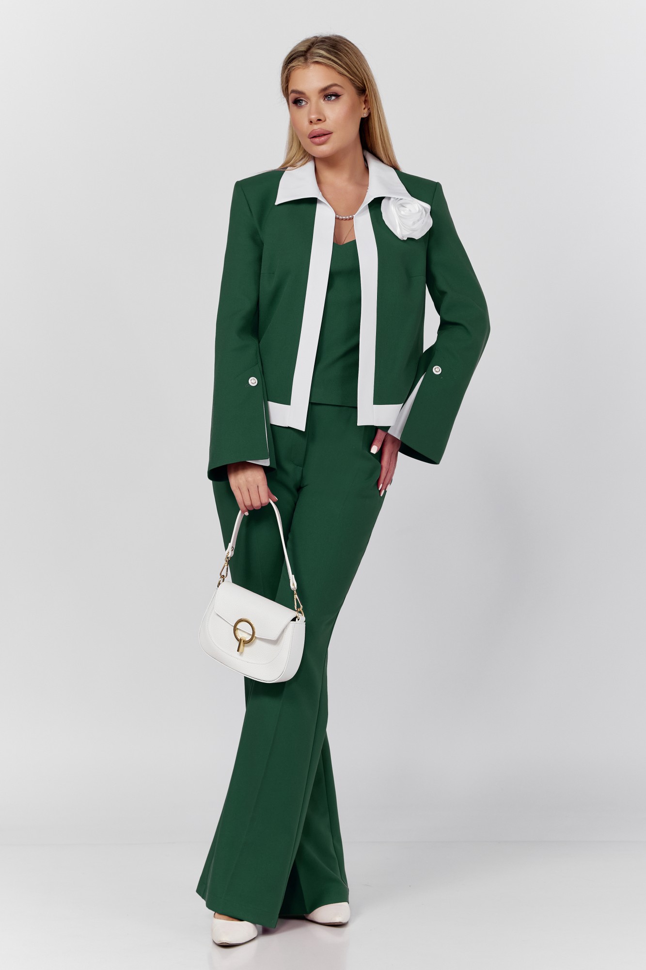 Настоящее произведение искусства!!! Уверенность, элегантность, этого костюма делает его идеальным выбором для важных деловых встреч, корпоративных мероприятий и незабываемых вечерних выходов. Изысканный комплект тройка выполнен из качественной стрейчевой ткани. Топ облегающего силуэта с рельефами по полочке, по спинке выточки и потайная молния в среднем шве. Брюки клёш от колена с за утюженым кантом, которые подчеркнут вашу утонченность и изысканность. Застежка молния по переду, по бокам прорезные карманы, пояс со шлевками и эластичной лентой по бокам. Жакет BLAZER без застежки на подкладке, рукав втачной расширенный к низу с декоративной шпицей. Изящность комплекту придает контрастная отделка воротника, планок, разреза шлицы и съемного декоративного цветка ручной работы подчеркнет вашу неотразимость и безупречный вкус.