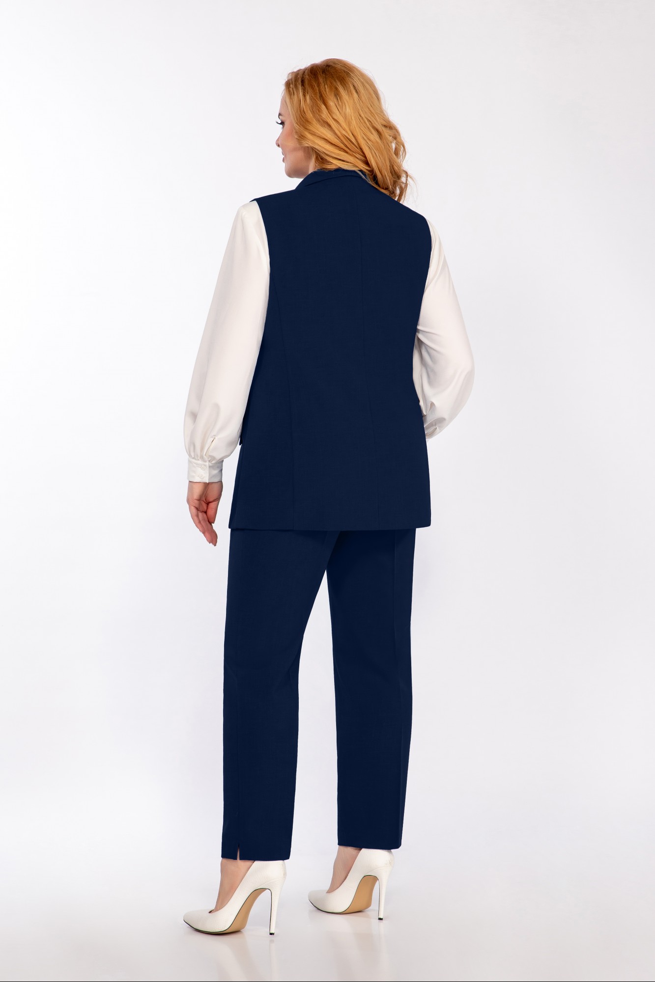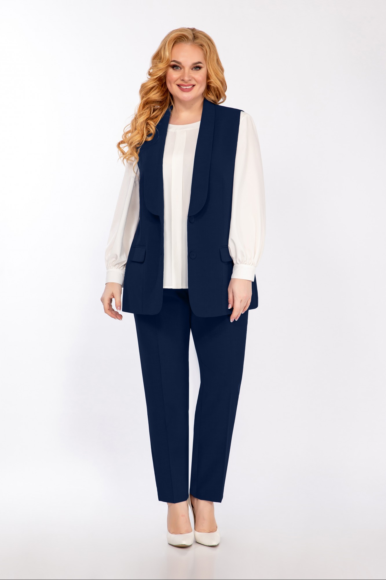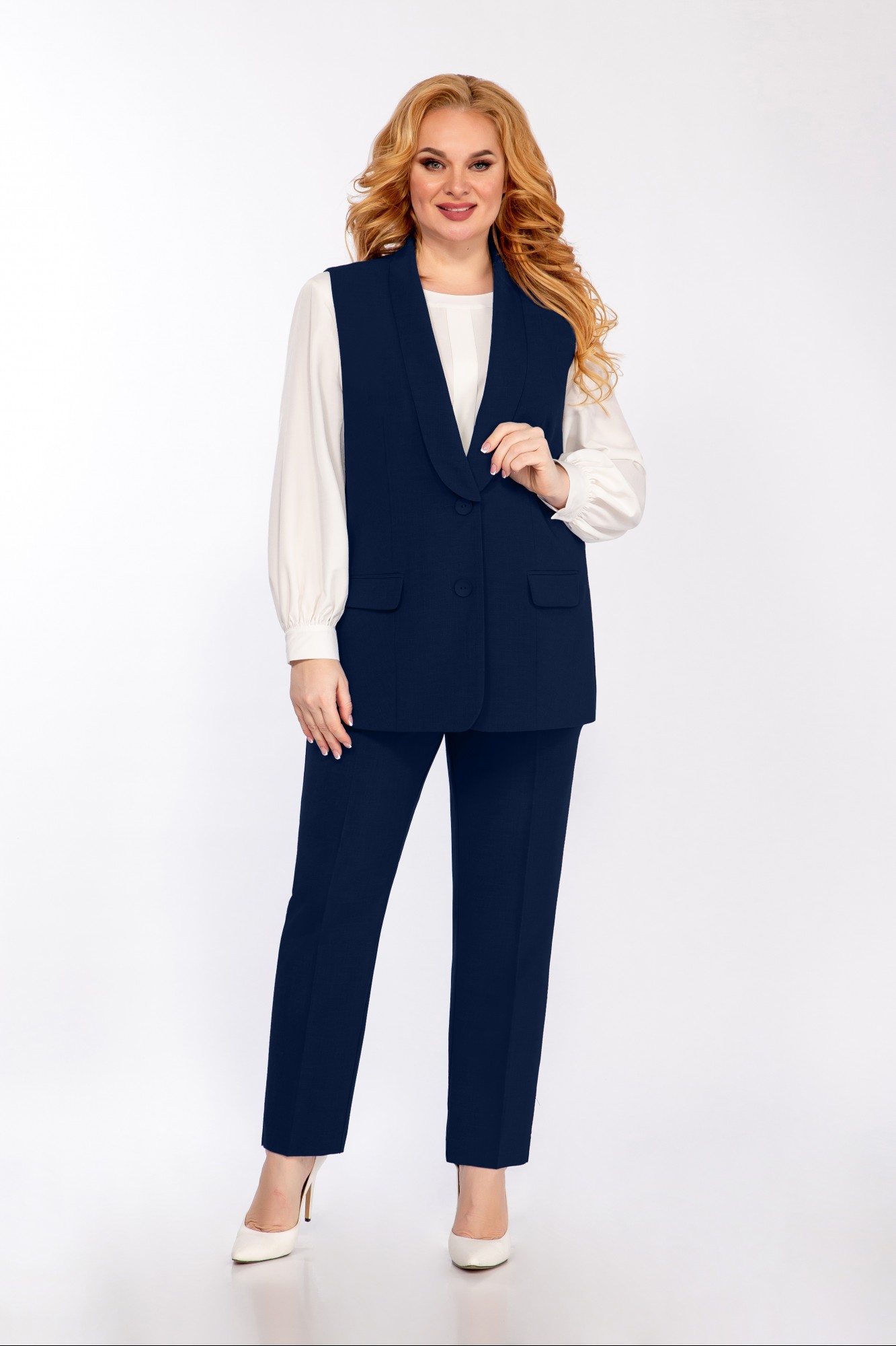 Жилет полуприлегающего силуэта. Центральная застежка на 2 пуговицы. Воротник шалевый. На полочке прорезные карманы с клапаном. Полочка обработана подкладкой. Спинка с рельефными швами. Блуза прямого силуэта из креп-шифона. На полочке нагрудные вытачки, по центру полочки декоративный элемент. Горловина обработана притачной планкой. Спинка со средним швом. Застежка в среднем шве спинке на 1 навесную петлю, 1 пуговицу. Рукав втачной. Низ рукава присборен, обработан манжетой. В боковых швах разрезы. Брюки слегка заужены к низу. Пояс притачной частично на резинке. Застежка на тесьму-молнию и петлю-пуговицу.