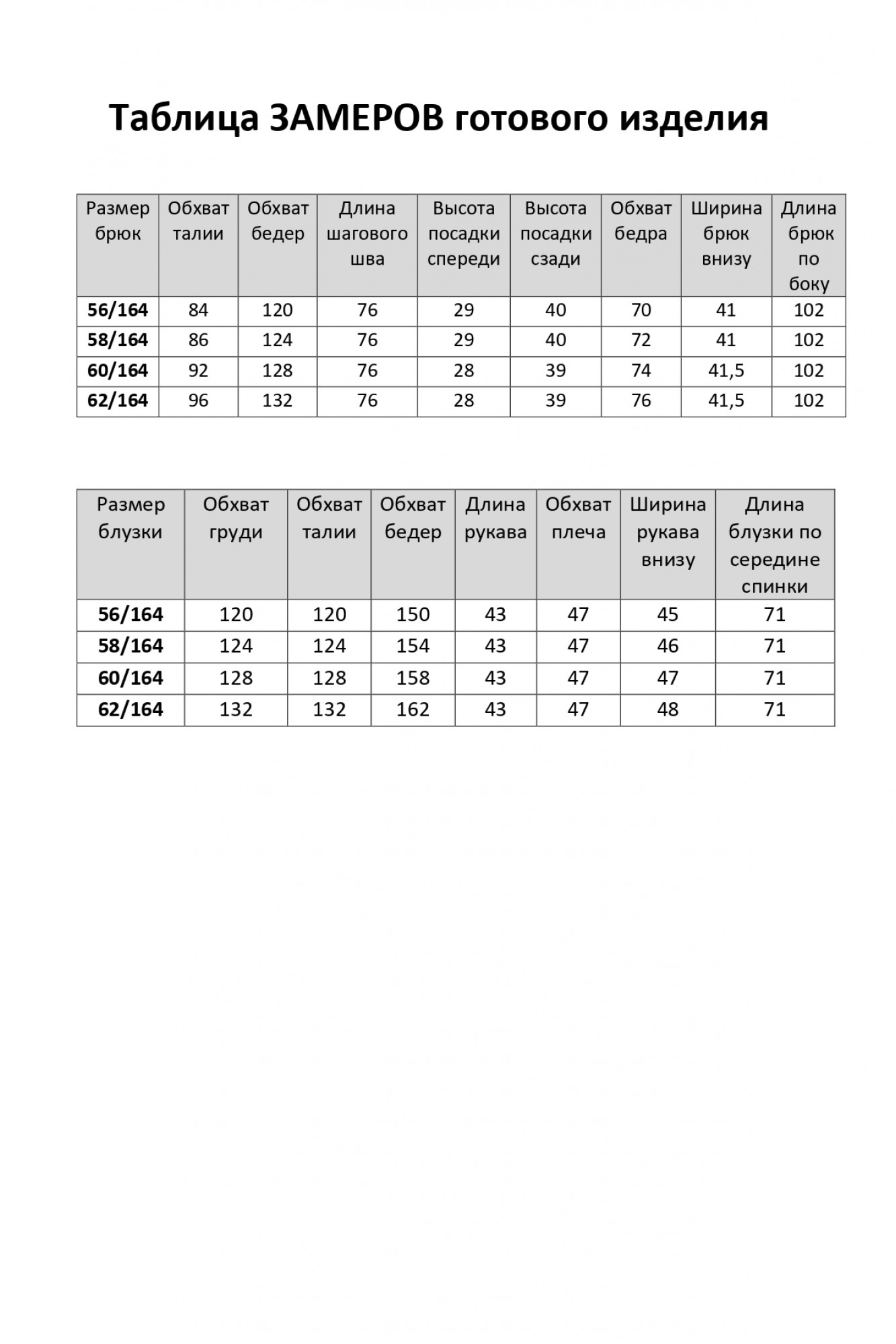 Блузка – полиэстер 100% (шифон). Брюки – полиэстер 50%, вискоза 50%