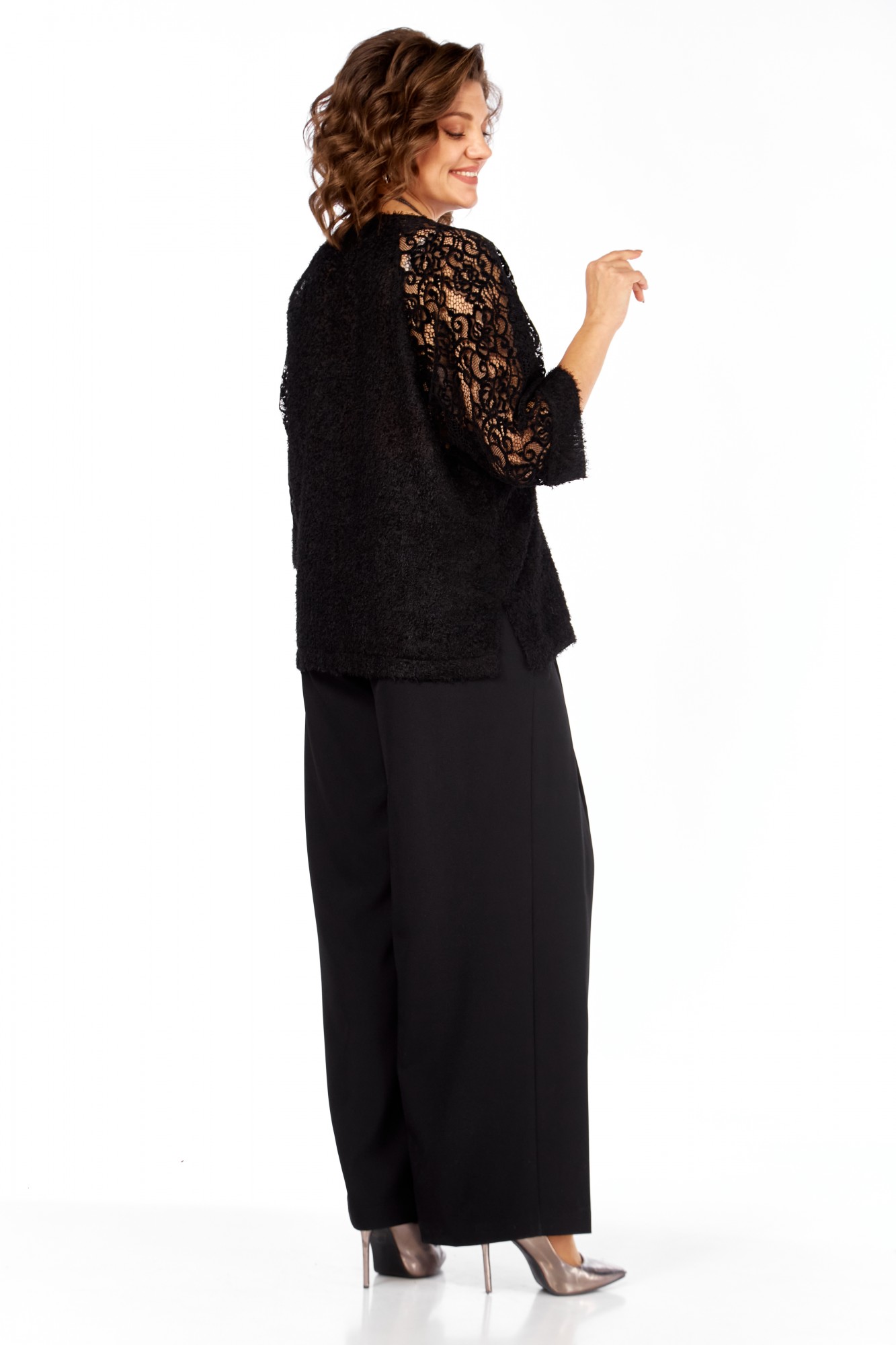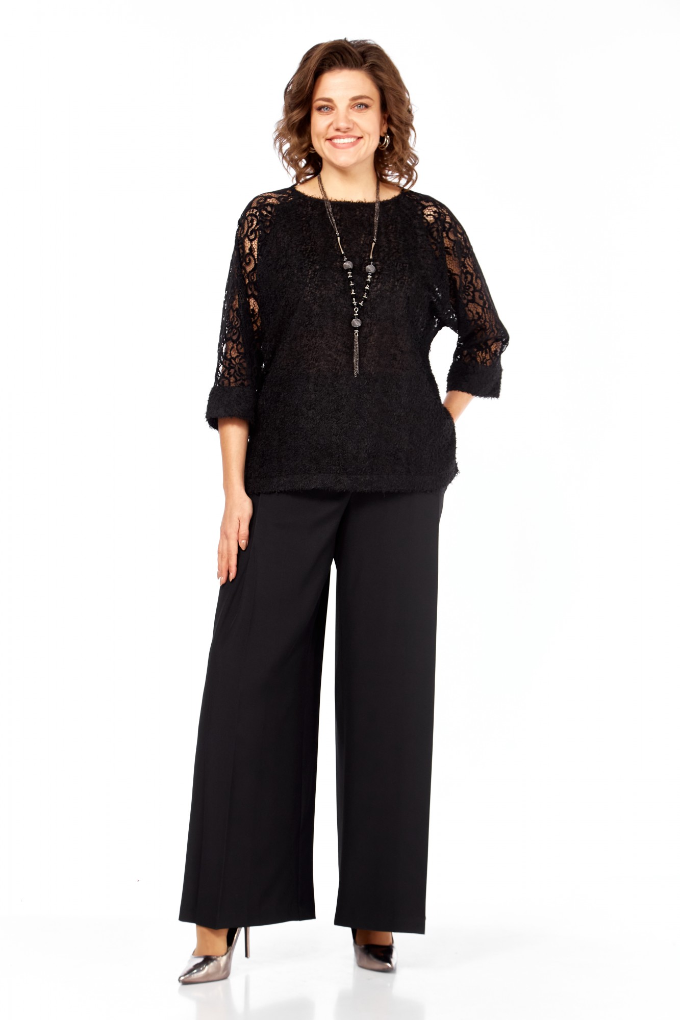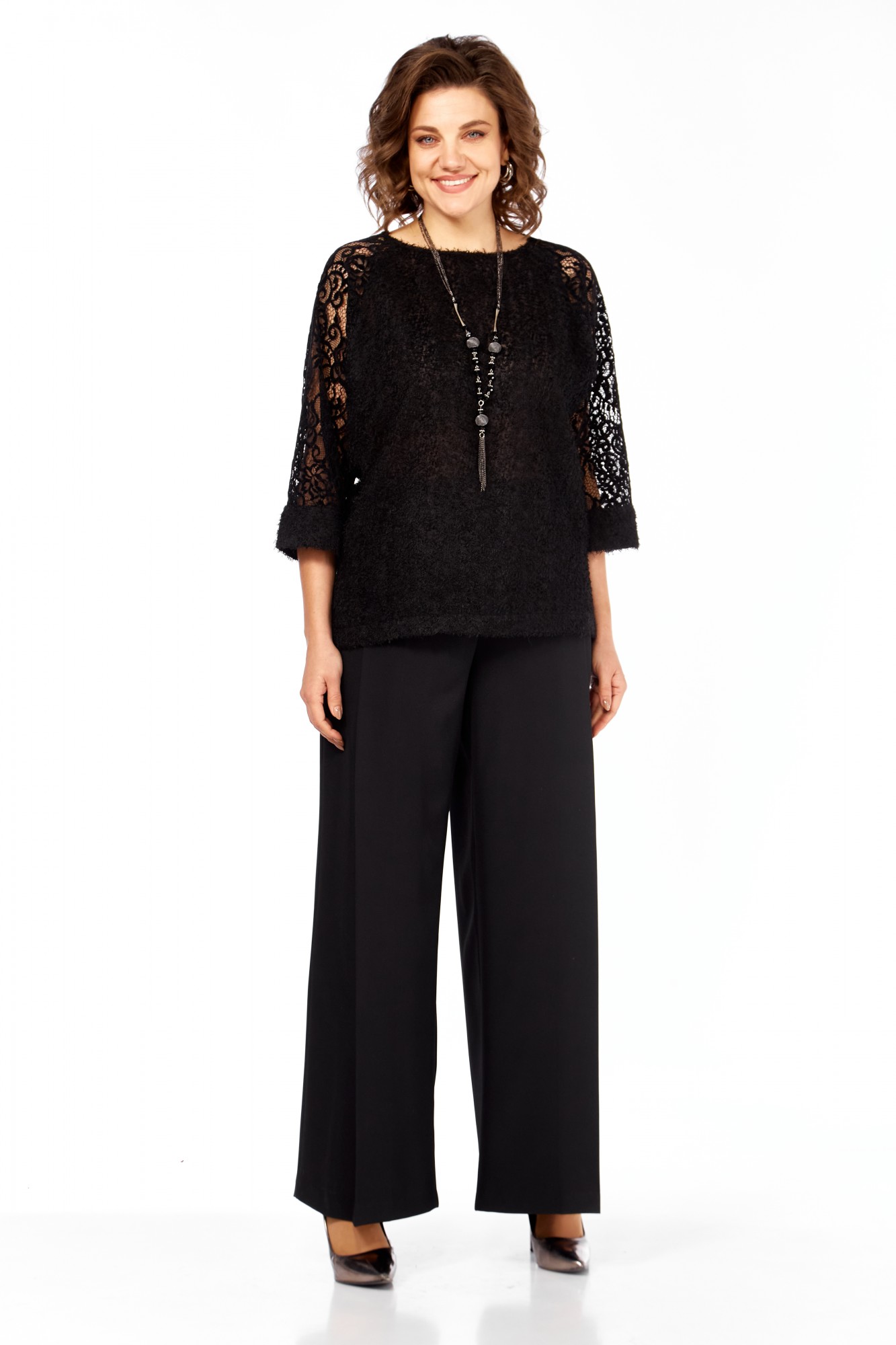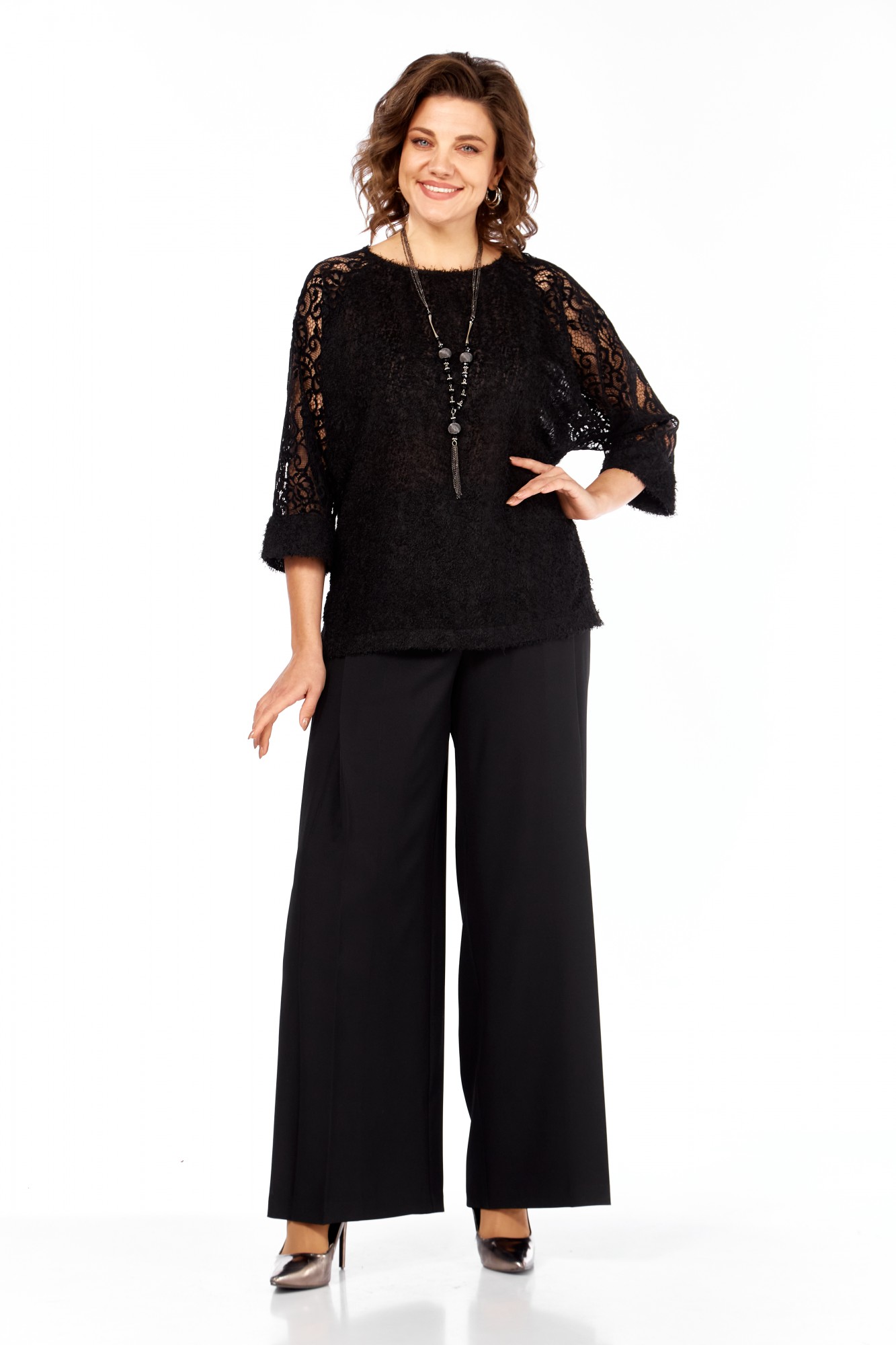 Комплект женский брючный 2-х предметный. Праздничная элегантная блузка полуприлегающего силуэта, выглядит эффектно, прекрасно подойдет для вечерних мероприятий. Горловина аккуратной округлой формы. Рукав выполнен из мягкого кружева, что придает дополнительный шарм, длина 7/8. В боковых швах предусмотрены разрезы. Невероятно комфортные, элегантные брюки-палаццо, образ в котором будет привлекать к себе внимание окружающих. Идеально подходит как для офиса, так и для вечернего выхода. Брюки свободные. По переду заложены складки, в боковых швах расположены боковые карманы, застежка-молния. Пояс притачной, сзади на резинке, это обеспечивает комфортную посадку. Широкий крой палаццо добавляет образу легкость и непринужденность, стрелки визуально удлиняют силуэт.