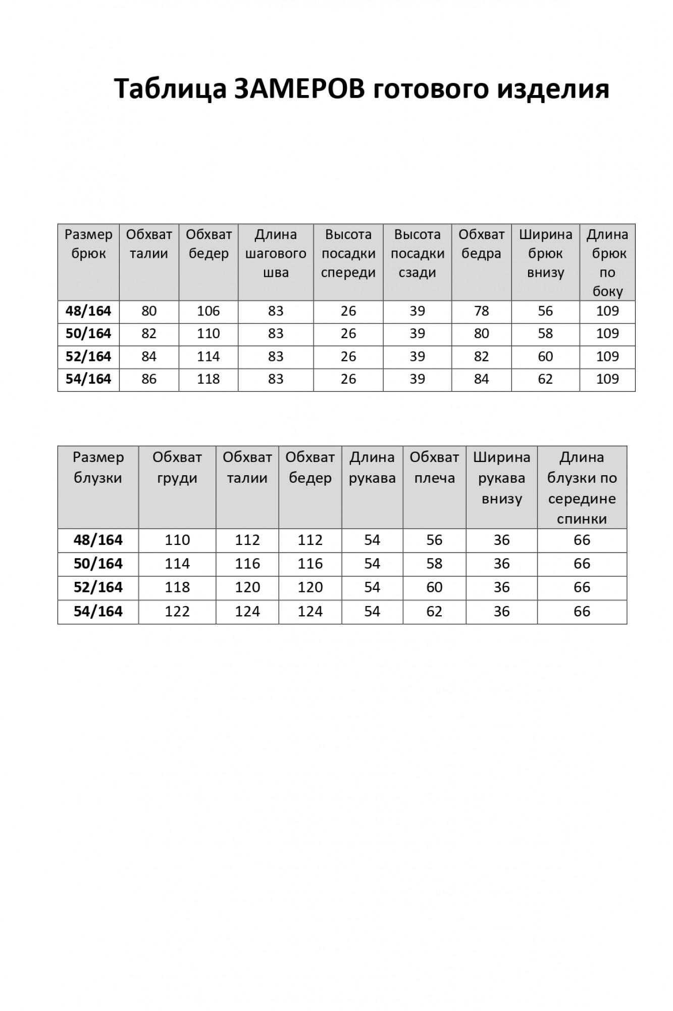 Таблица измерений