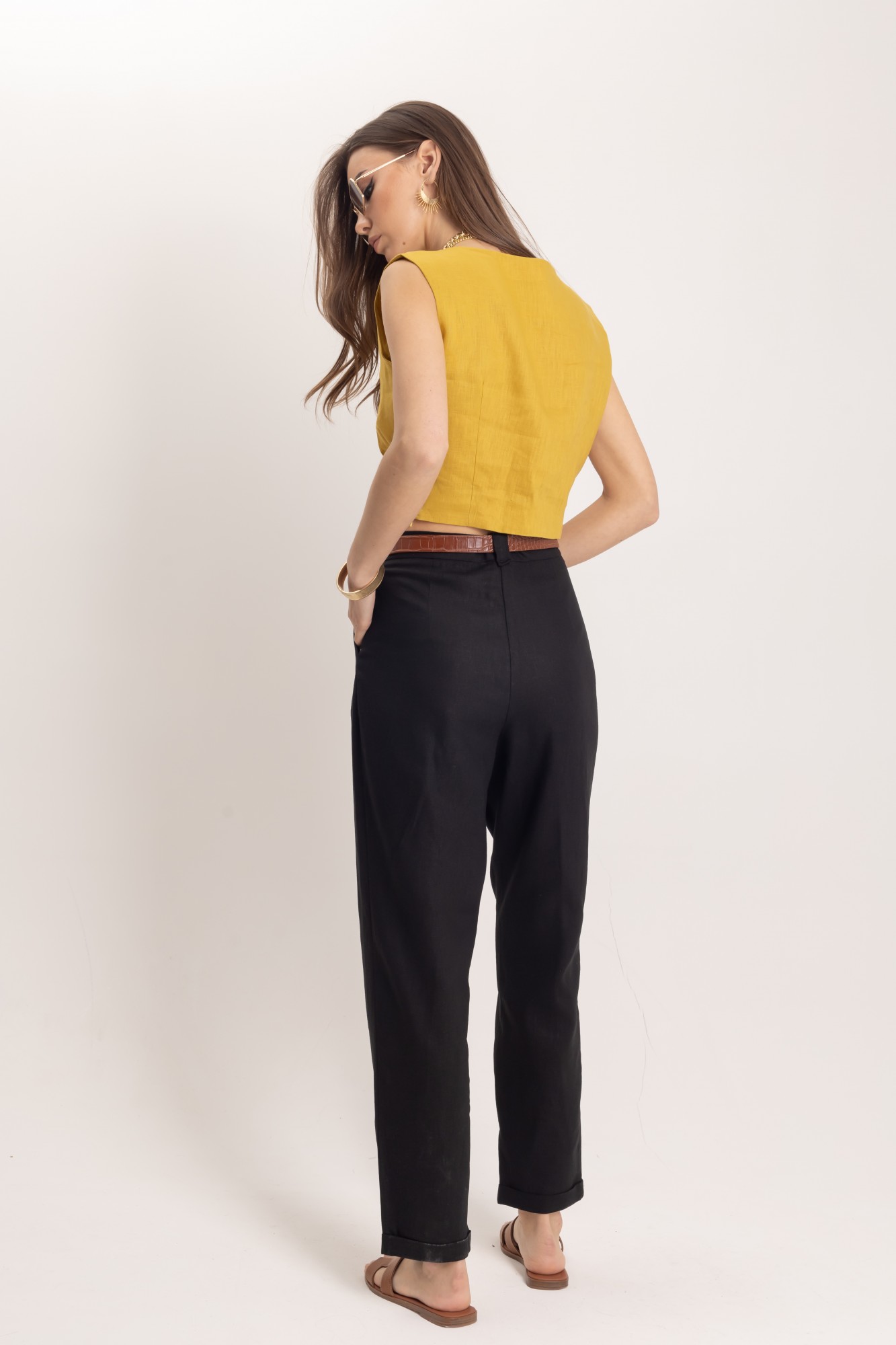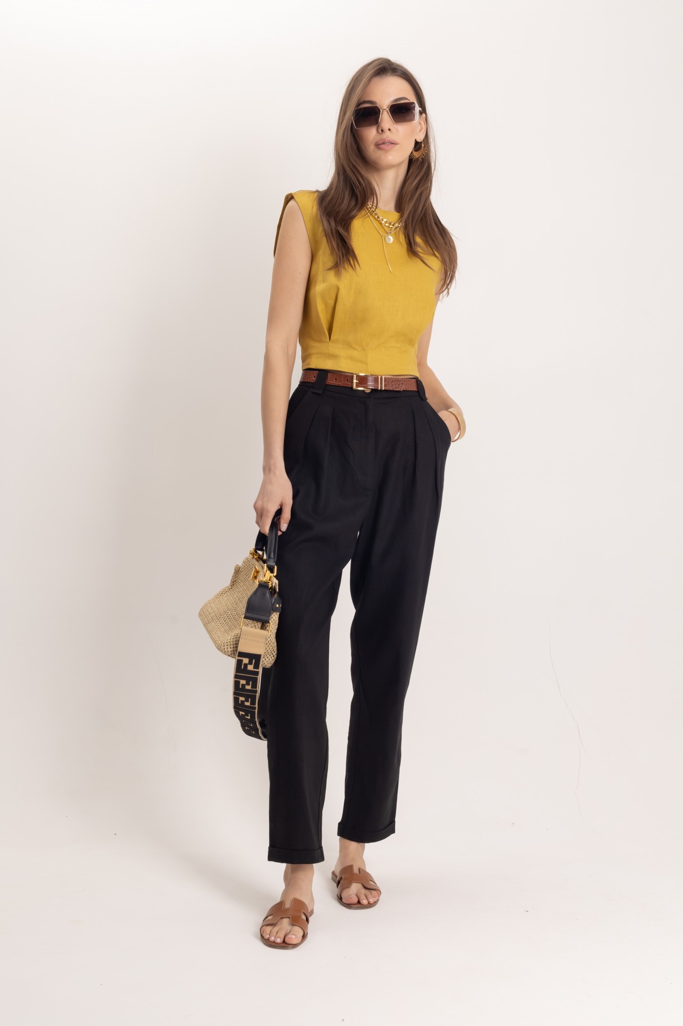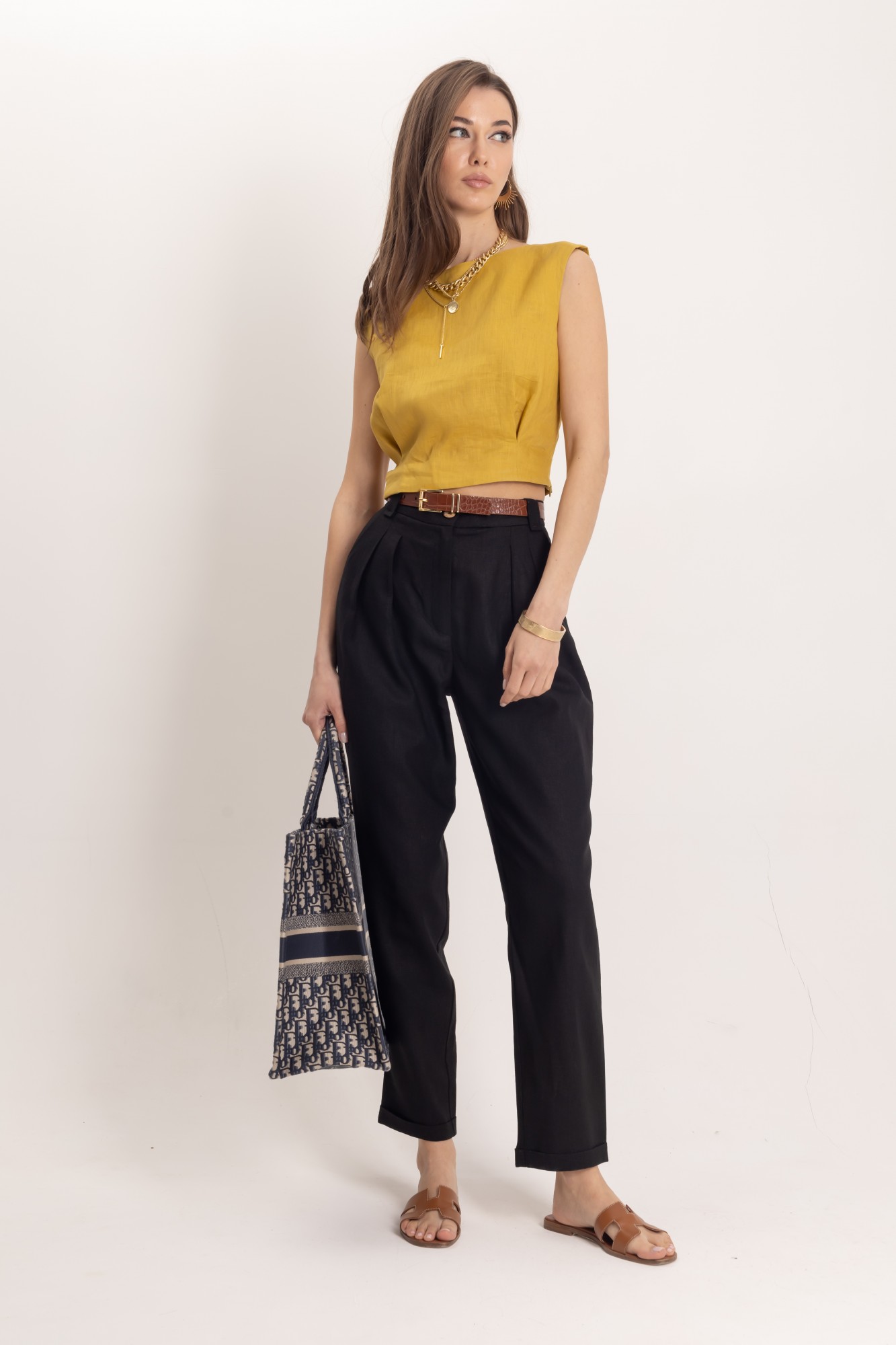 Стильный женский топ, выполнен из 100% льна, в богатом горчичном цвете, отлично подчеркнет летний загар. Топ идеально сочетается с элегантными брюками для офисной и вечерней моды. Комплект гармонично смотрится с аксессуарами из золота или жемчуга, такой комплект может быть любимым элементом вашего гардероба. Брюки женские классические черного цвета из льняной ткани, зауженные к низу. Верхний срез брюк обработан притачным поясом с отрезными шлёвками, мягкие складки отлично скроют недостатки фигуры, сделают силуэт стройным, имеется пуговица из материала «кокос». Низ брюк обработан в подгибку. Универсальным вариантом также является очень модная на данный момент модель бананы длиной ⅞